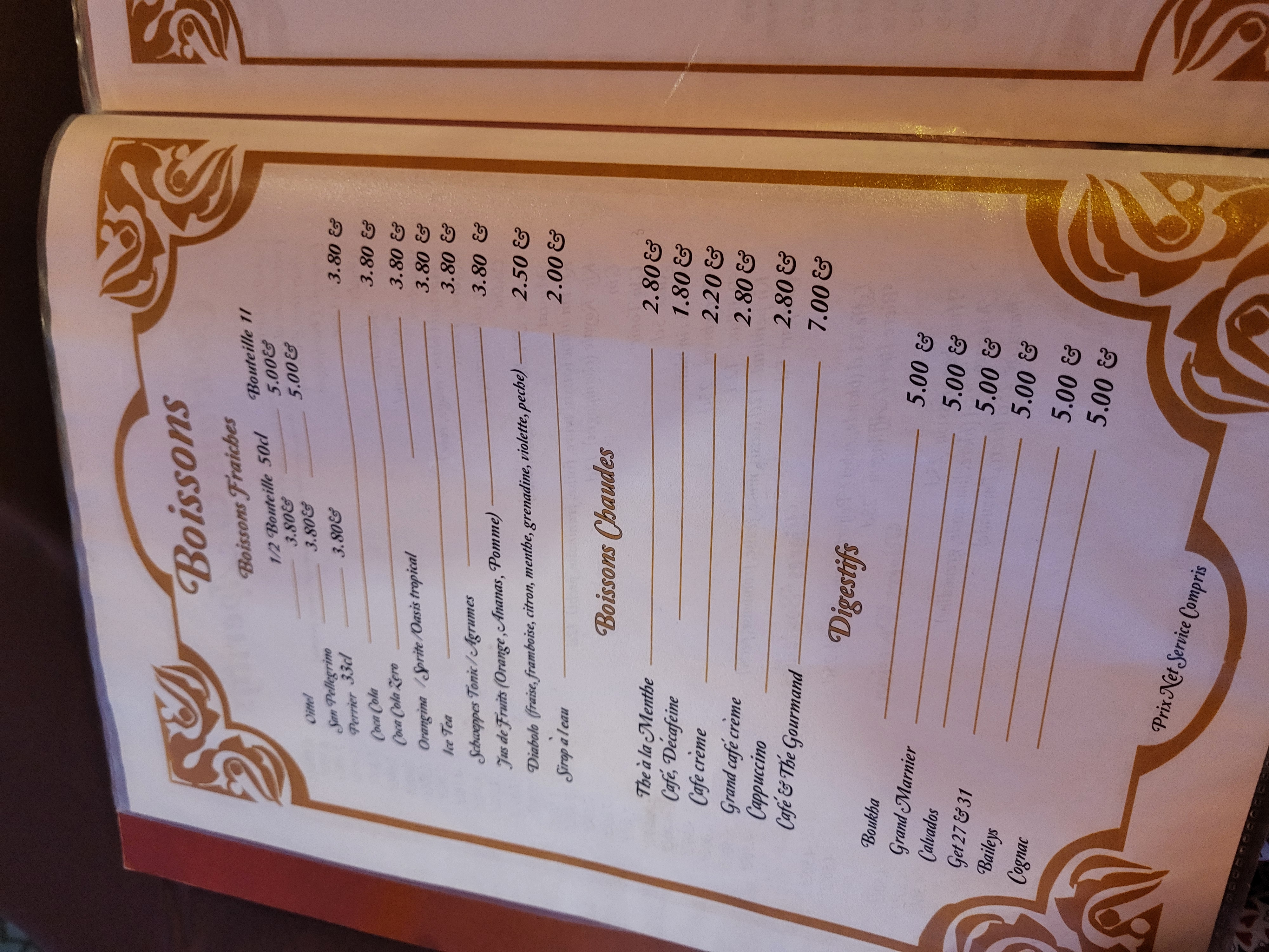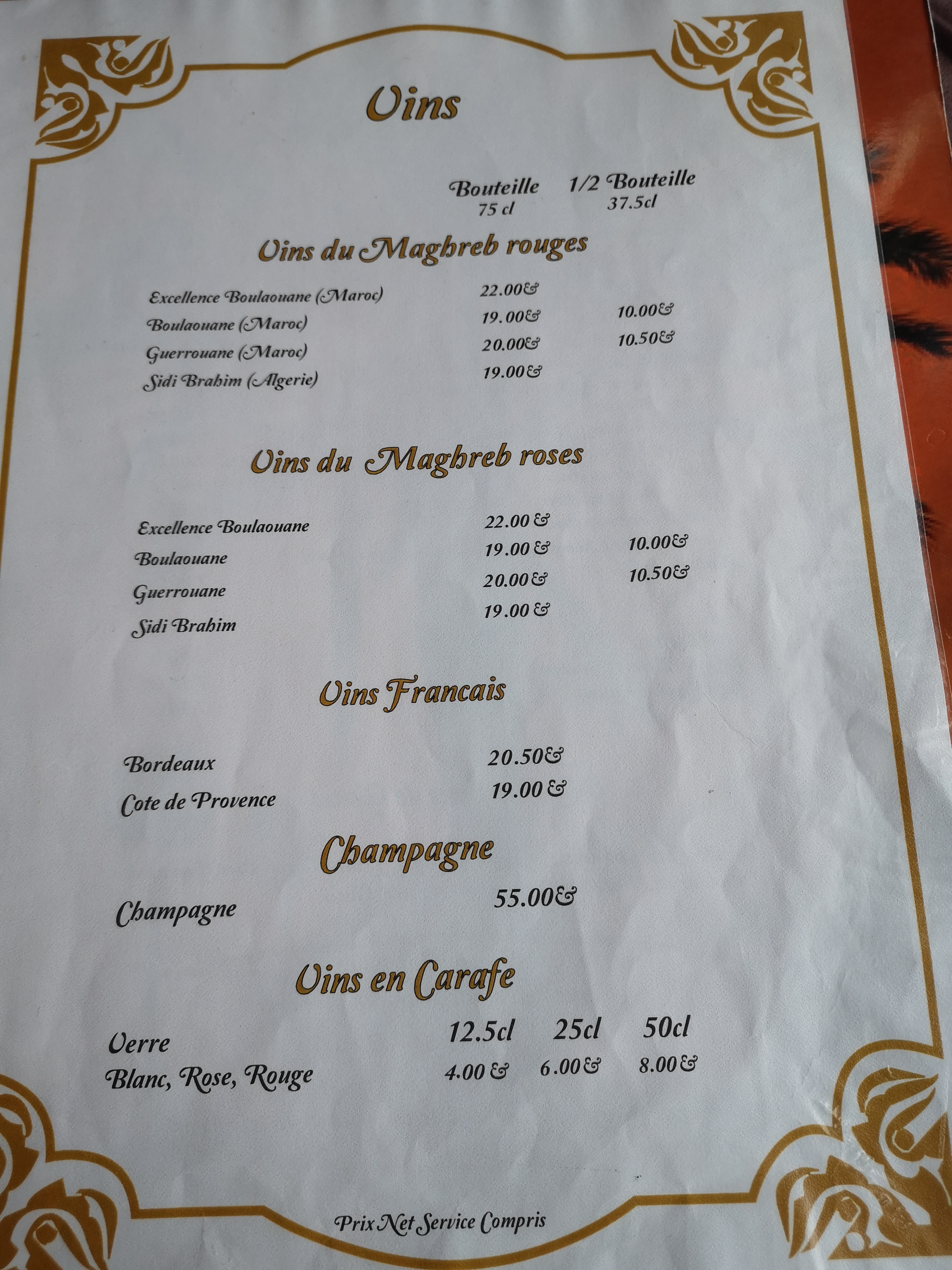 Repas délicieux : nous avons commandé le couscous berbère (agneau, poulet, merguez, boulette), deux softs et une bouteille d'eau pour 57 euros. Le couscous était très bon et copieux. La serveuse nous a proposé un supplément de semoule et de légumes.