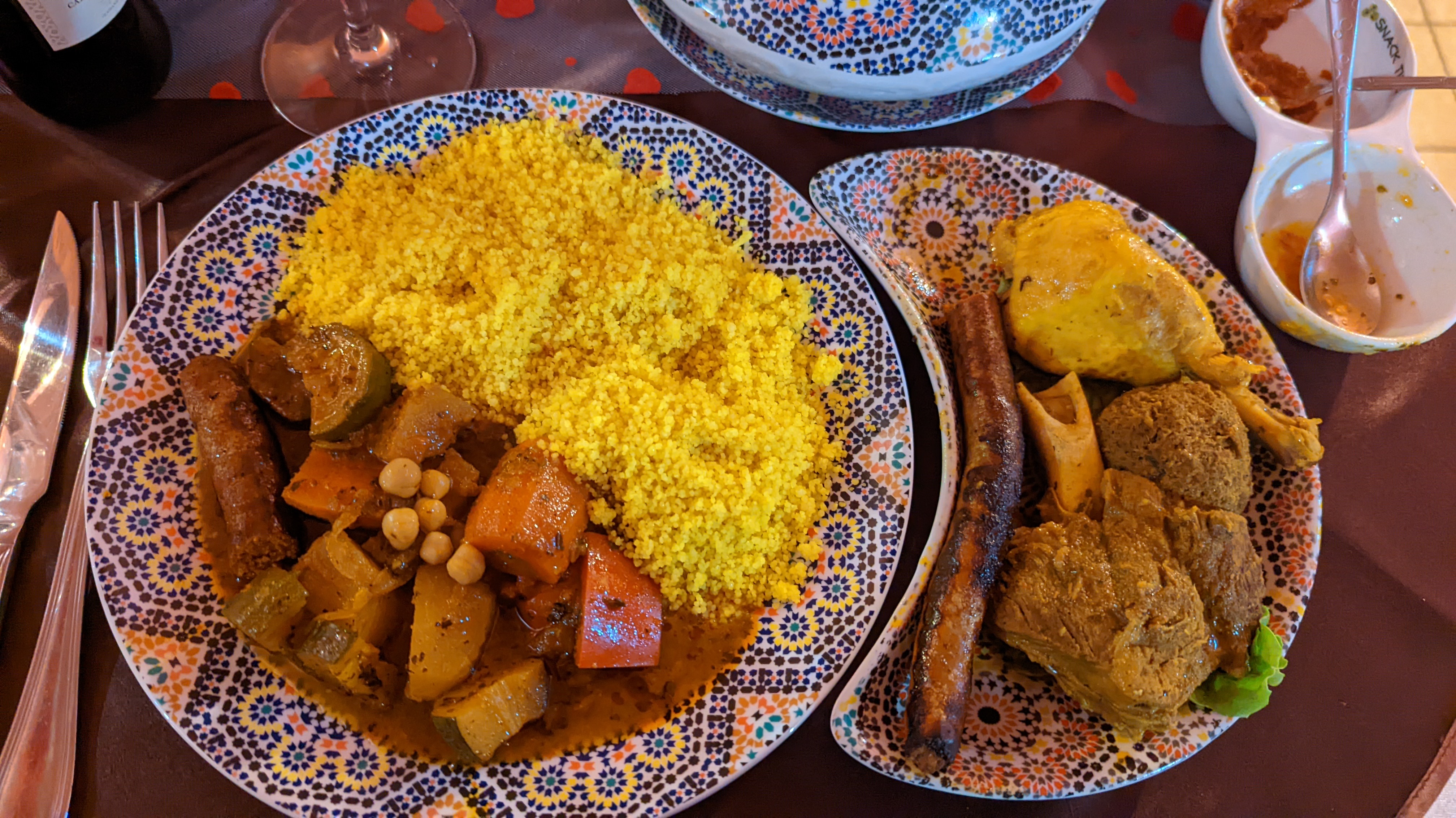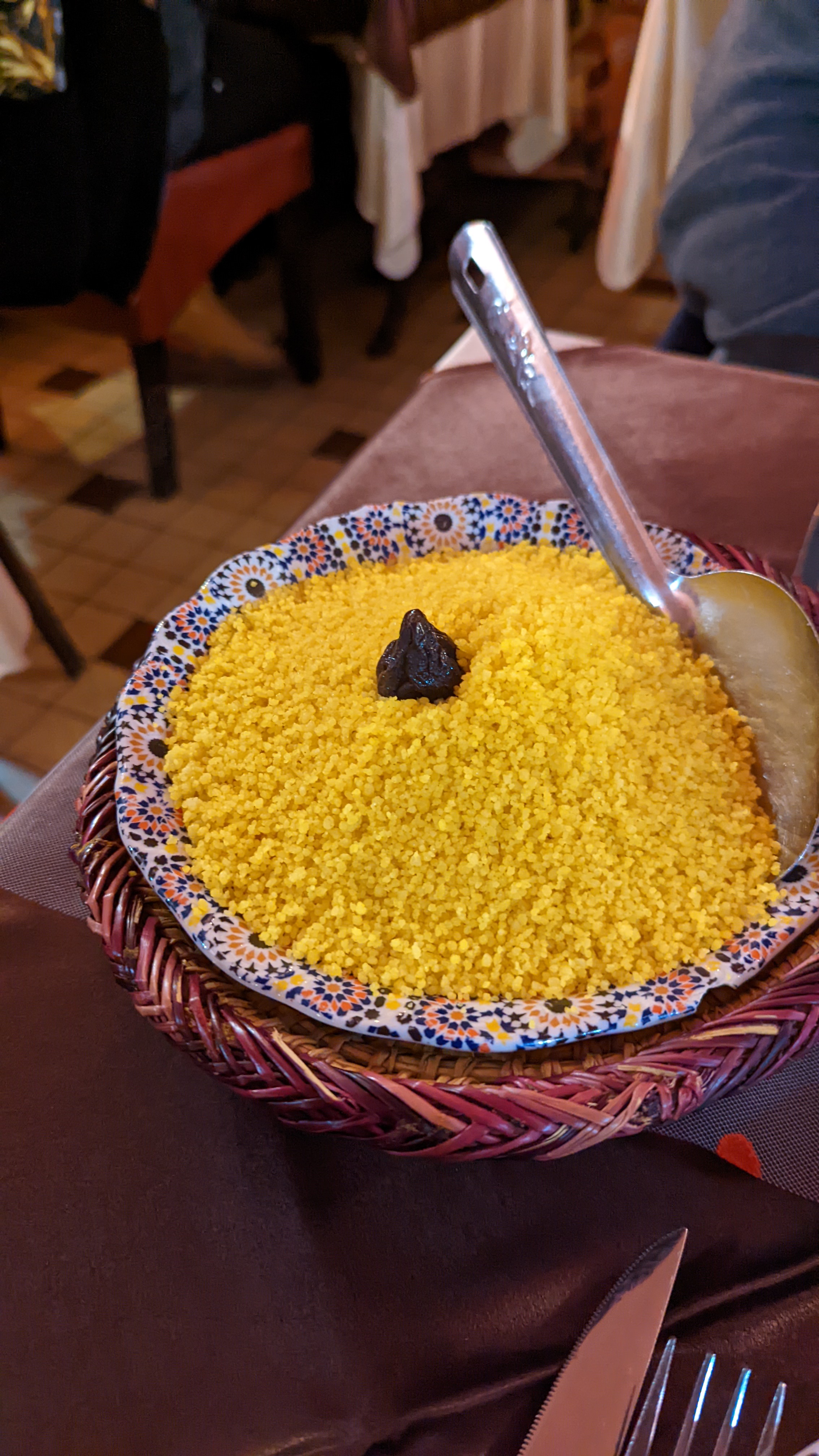 Très bonne découverte de ce restaurant sous l’ambiance du Maroc. Nous avons passé une bonne soirée et avons bien mangé. Le couscous était copieux et très bon, et le thé à la menthe aussi. Nous reviendrons avec plaisir la prochaine fois gouter les tajines et les bricks ! Car nous sommes sortis l’estomac plein sans prendre d’entrée… 😅