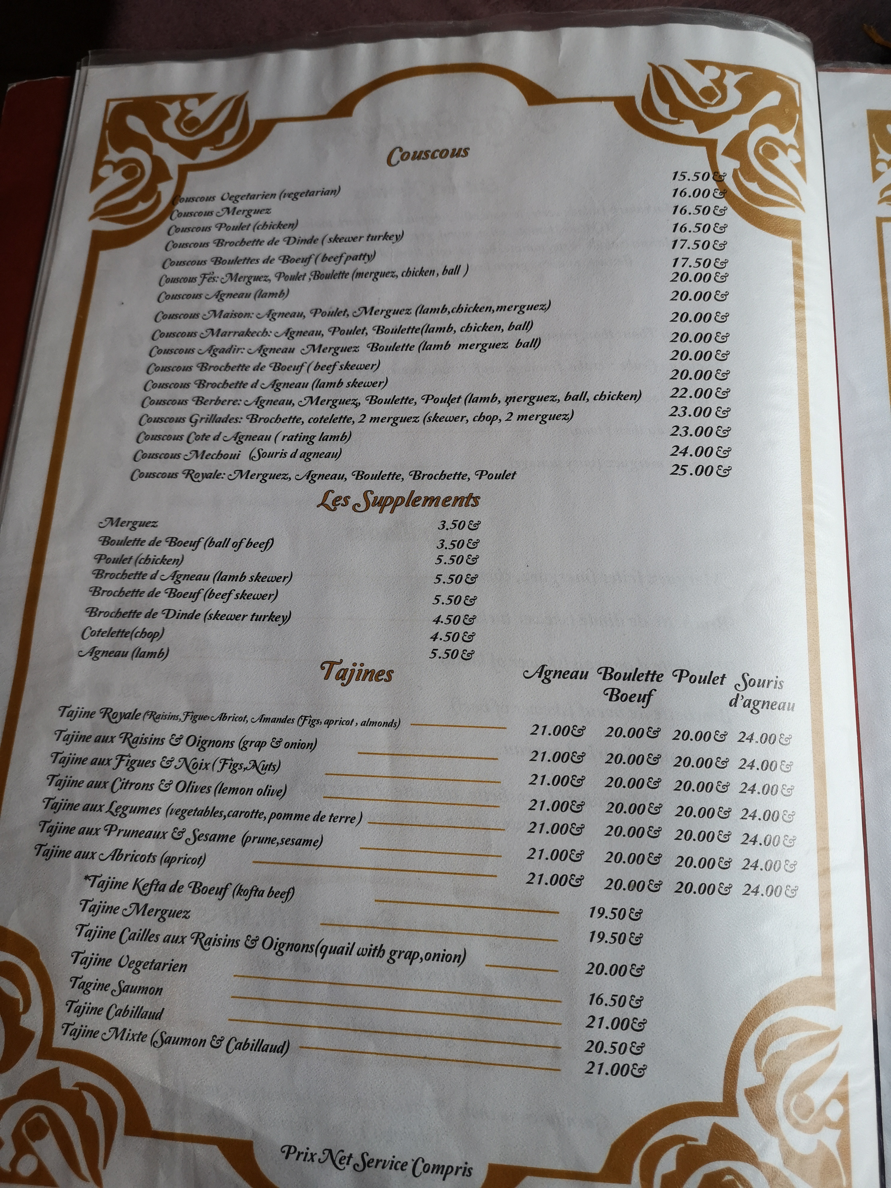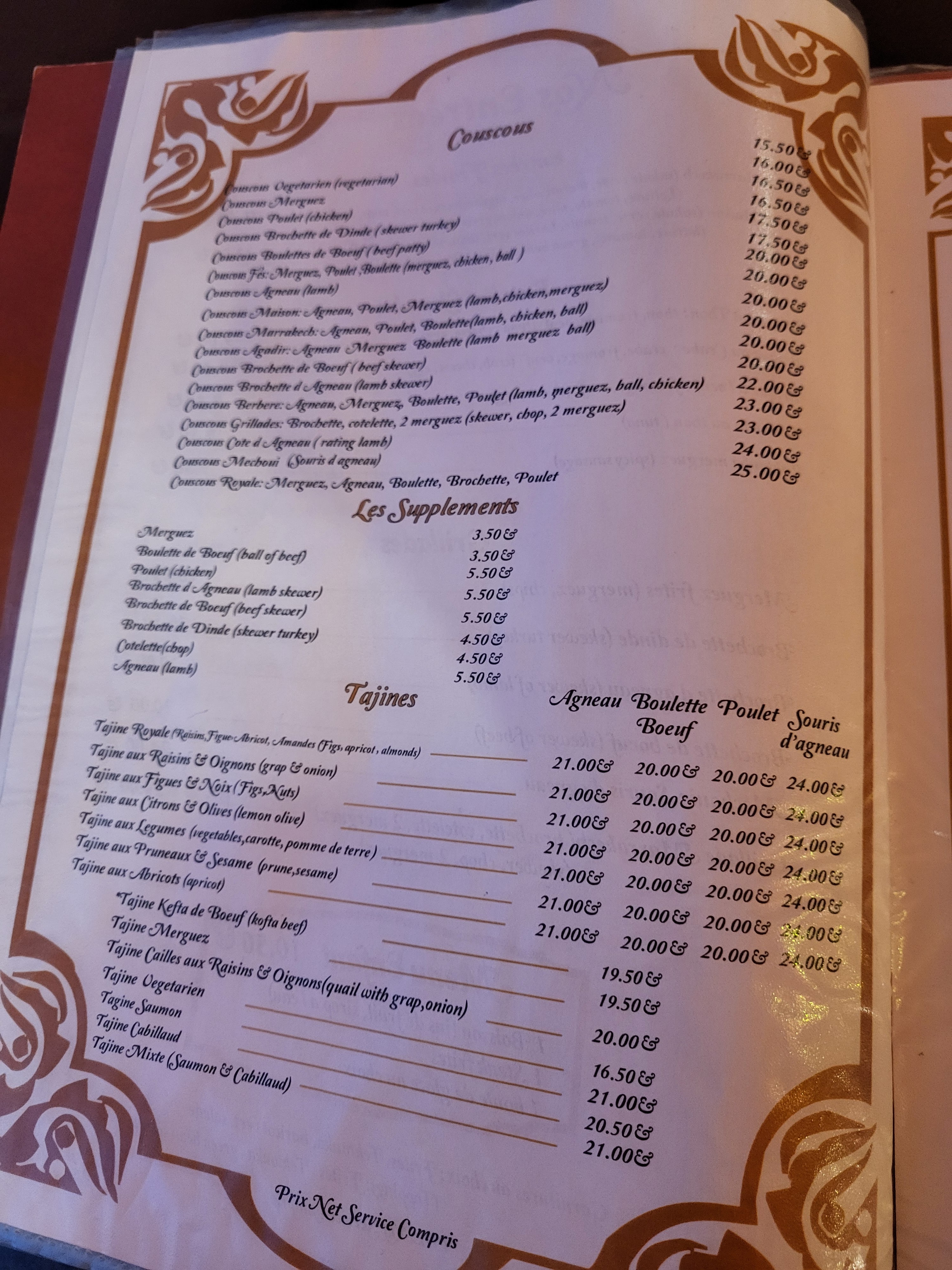 Accueil chaleureux véritable couscous (plusieurs variétés) personnellement nous avons pris grillades et Fes 👌 délicieux; vous avez aussi un choix de Tajines. Je recommande vivement