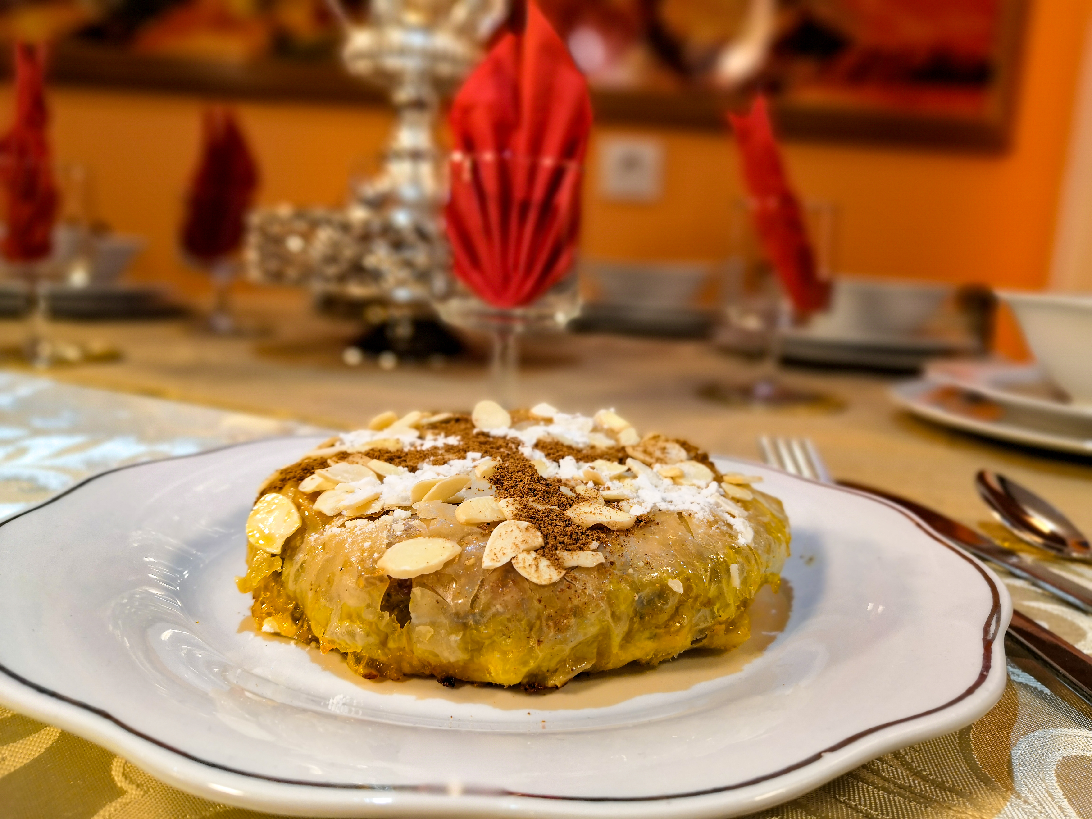 Étant d'origine marocaine je peux vous assurer que les plats choisis pour mon dîner étaient conforme à la tradition culinaire marocaine de qualité. Je conseille fortement. (En photos, une pastilla de la mer en entrée et méchoui d'agneau accompagné de sa taktouka en plat principal)