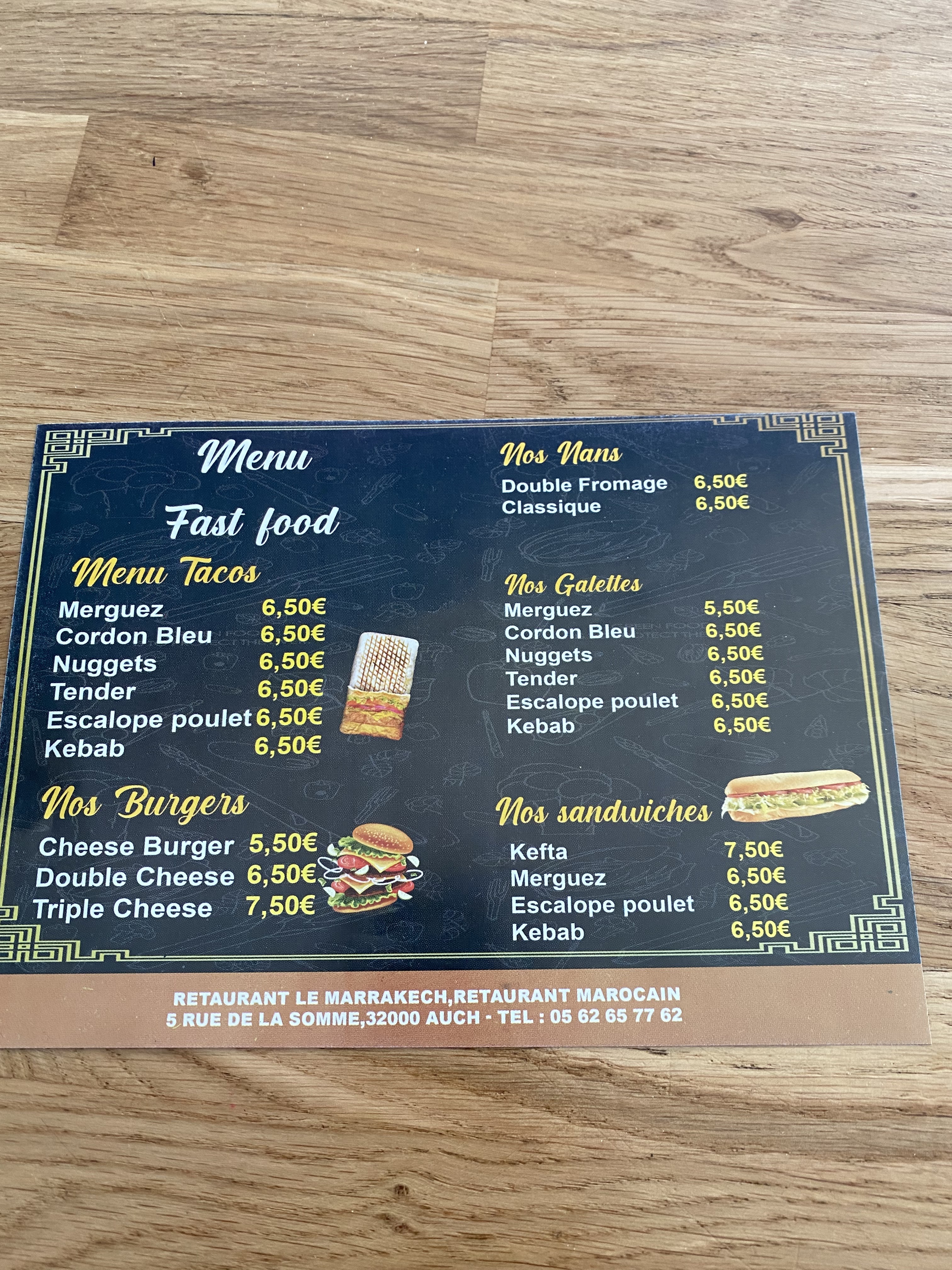 Bon restaurant marocain présent à Auch depuis 1 an. accueil chaleureux, ambiance marocaine, divans très agréables, tajines au top, le tout avec des produits frais. A recommander sans aucune hésitation, service rapide puisque la responsable est seule en cuisine. Pour ceux qui veulent un restaurant marocain au-dessus du lot, le restaurant Marrakech reste le top à Auch.