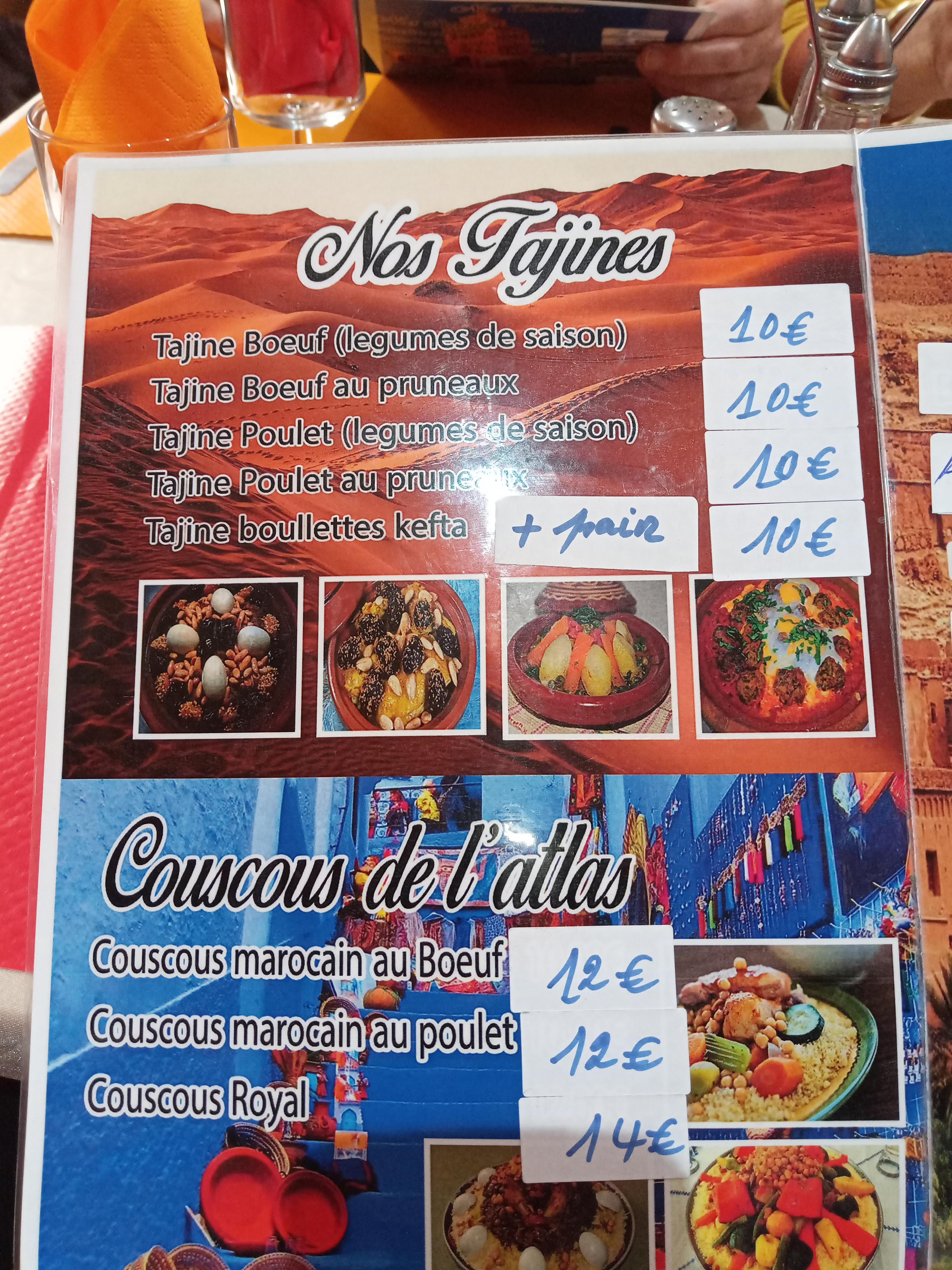 Les saveurs sont au rendez-vous mais les quantités sont moindres (notamment pour le tajine aux pruneaux). Vin très mauvais que ce soit en carafe ou en bouteille. Pas même servi frais. Nous ne reviendrons pas.