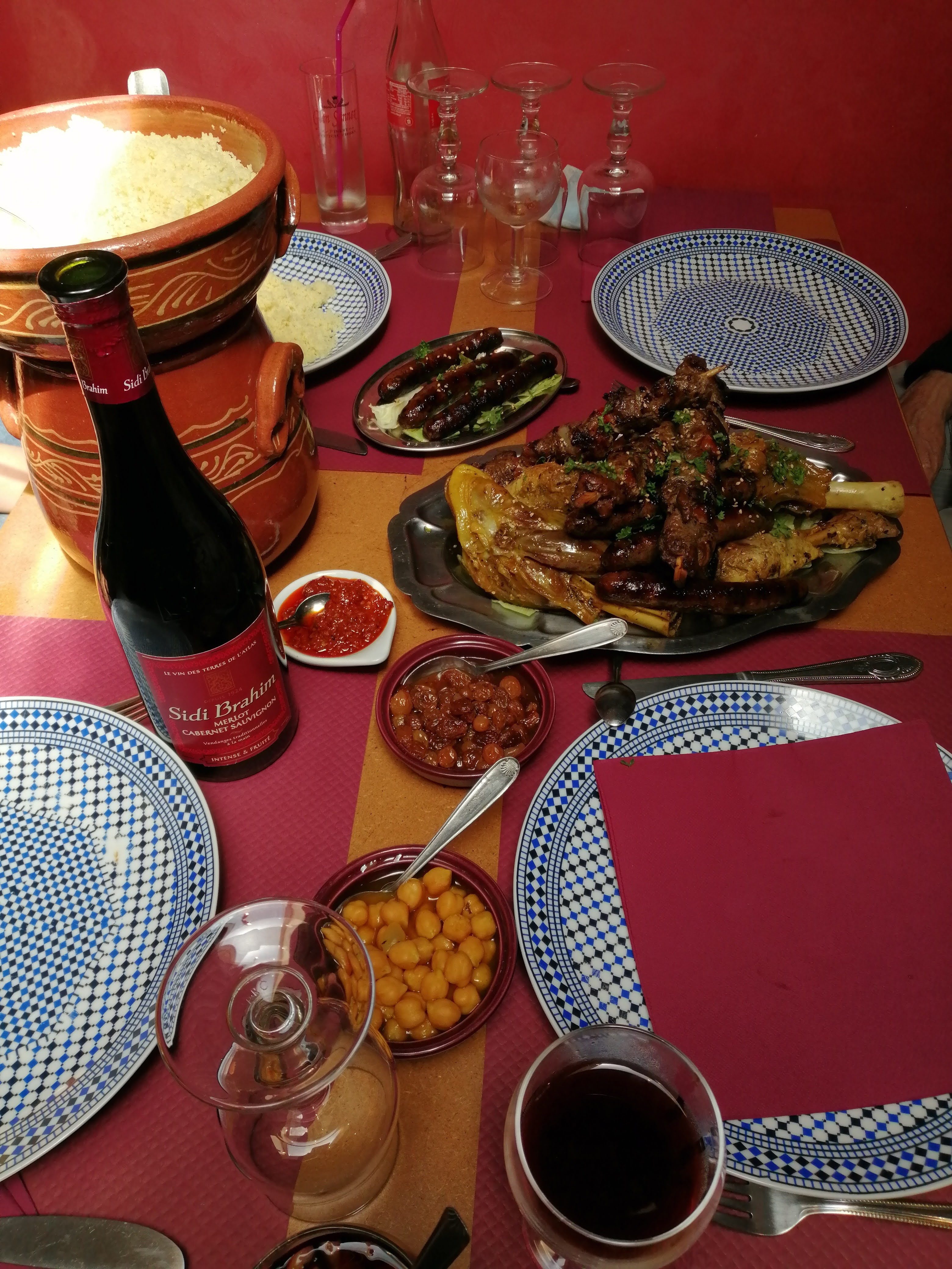 Parfait. Couscous royal au alentour de 20€, une assiette garnie (poulet, merguez, agneau, bœuf) semoule et légumes à volonté. Très très bon. Rien à dire ! 👍 Ps : un Bon vin marocain.