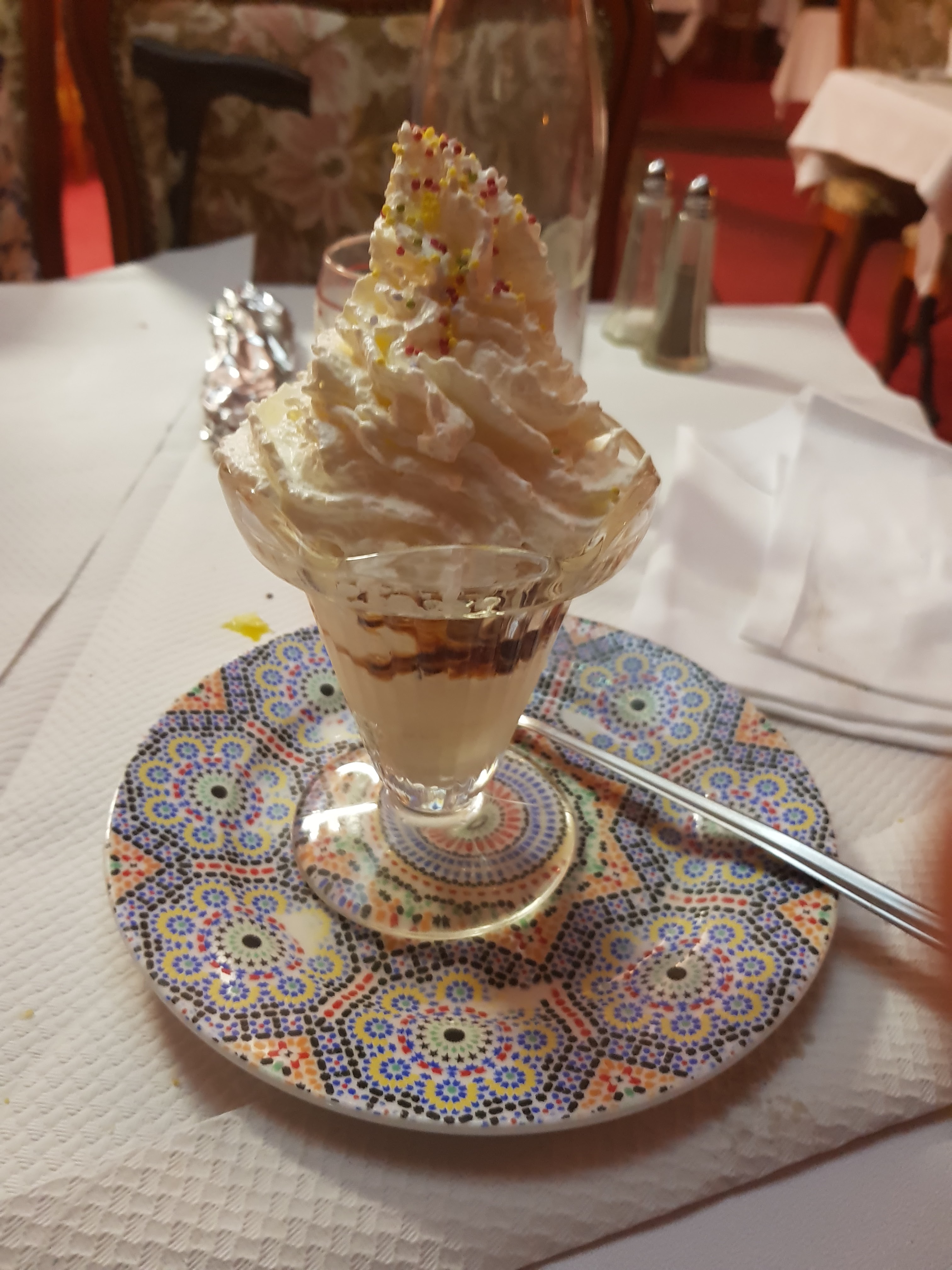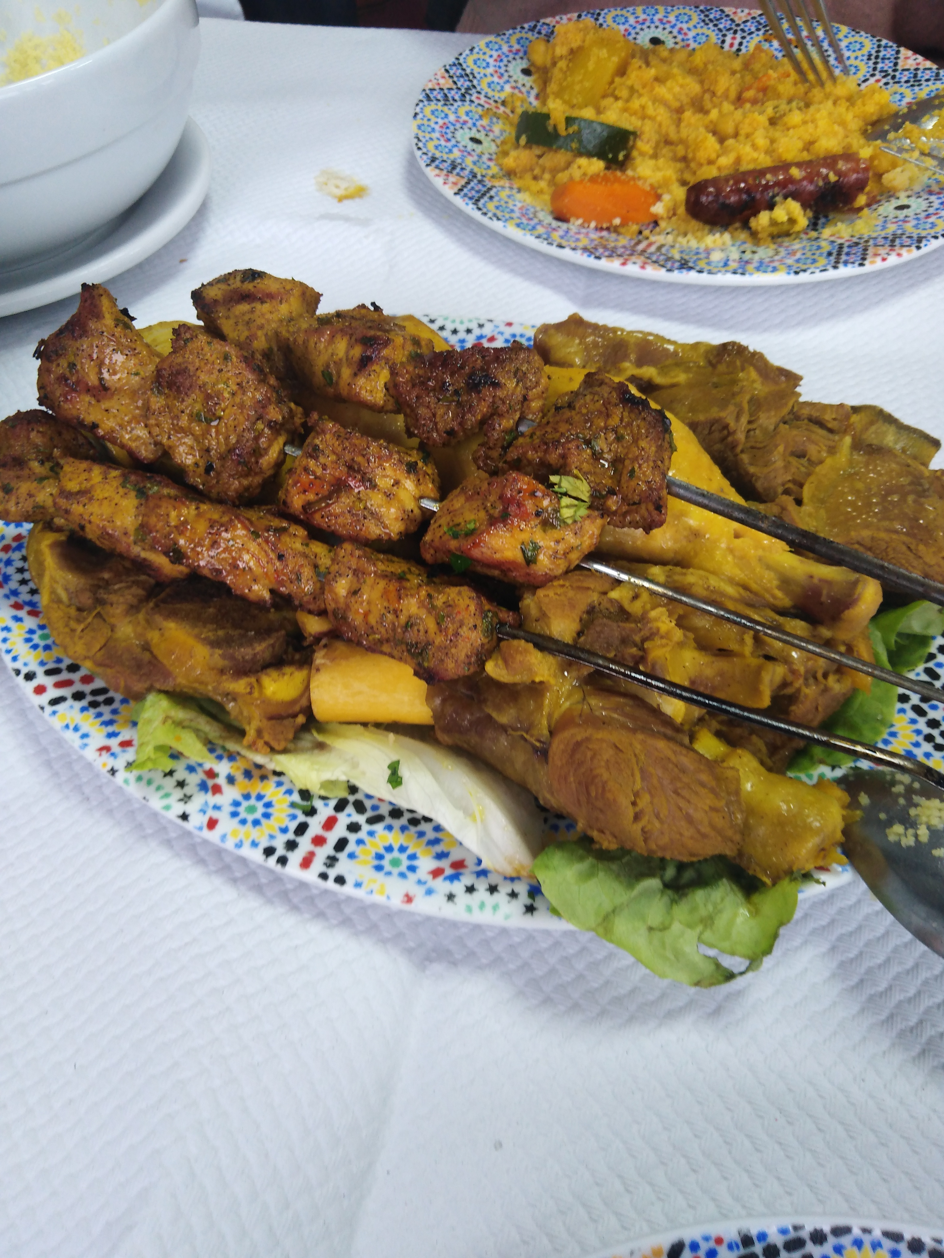 Diner en famille sympathique dans ce beau restaurant marocain. Il propose un choix varié de couscous et de tajines qui permet à chacun de trouver son bonheur. J'ai testé le couscous grillades qui comprend une brochette, une merguez et une côtelette d'agneau. La semoule fine, excellente, est bien servie en quantité. Juste un petit bémol concernant le thé gourmand qui était accompagné d'une boule de glace et d'une unique pâtisserie. J'aurais préféré un assortiment de 3 ou 4 pâtisseries. Monsieur le restaurateur, les pâtisseries marocaines sont réputées parmi les gourmands alors n'en soyez pas avare.