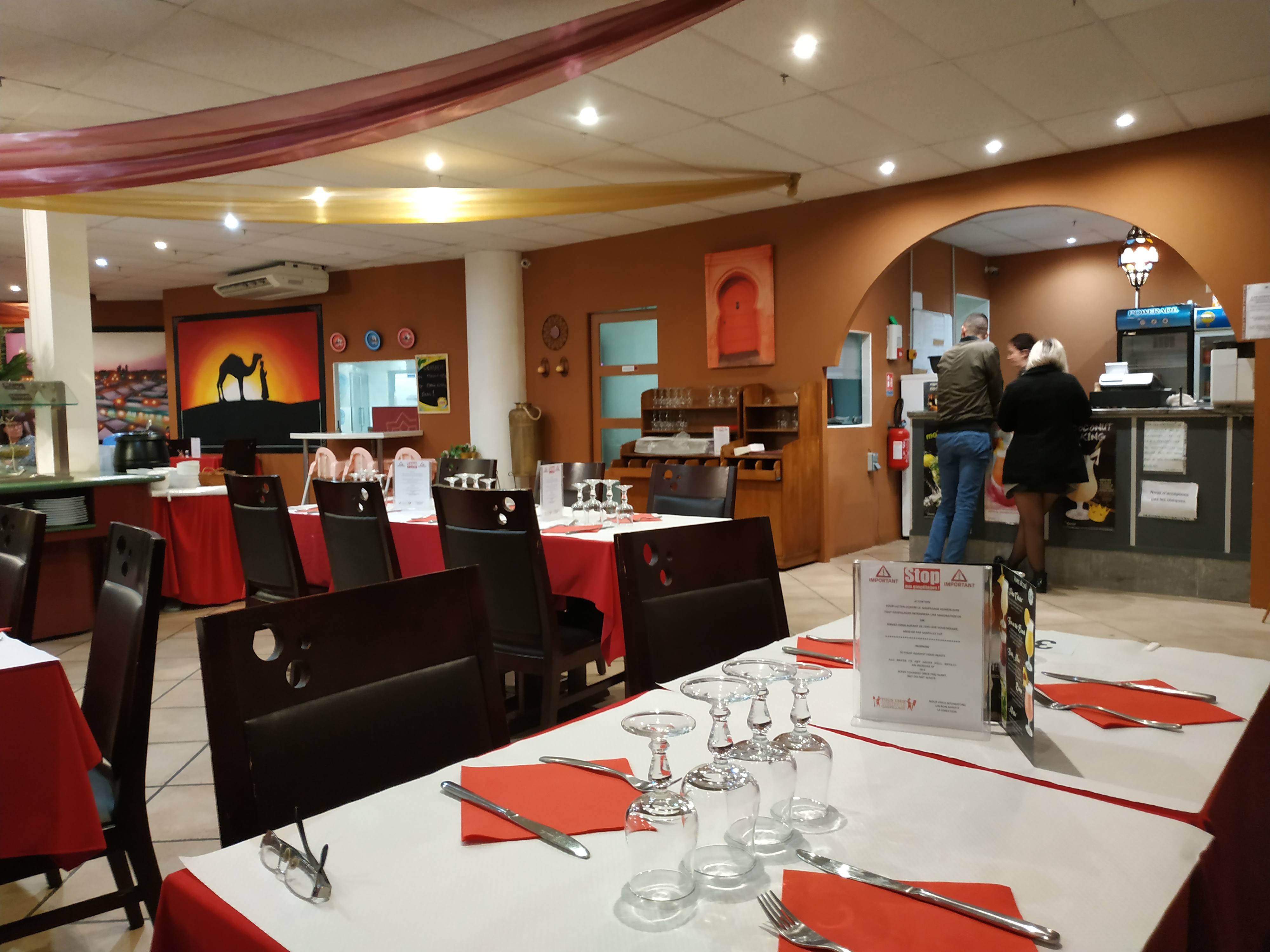 Très convivial et super accueillant, protocole sanitaires carré donc top mes seules regret peux être reste le manque de choix de goût ( épices) et surtout de pâtisserie orientale mais j avoue que ma femme étant algérienne je suis habitué à d avantages dans la famille mais reste très convenable pour une famille qui rêve d évasion bon 95€ quand même 3 adultes 1 enfants avec juste 1 coca chacun et 4 thé à la menthe qui pour moi aurait pû être offert car quasi 2€ merci quand même