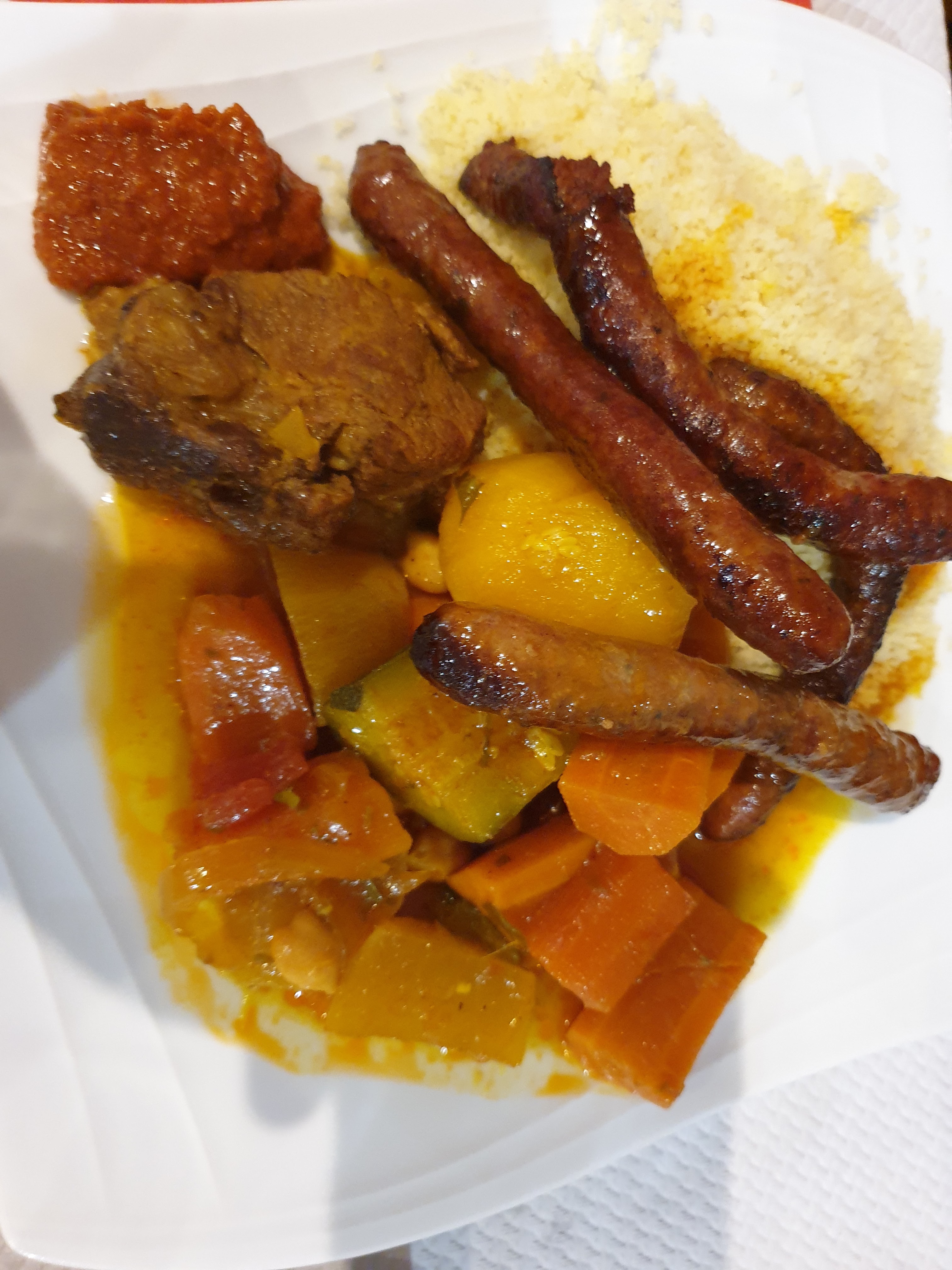 J'ai testé une commande à emporter, copieux mais semoule dessous et viande et légumes dessus. Le tout dans la même boîte Ce qui fait qu'il n'y avait plus aucune sauce et donc un couscous très sec avec une semoule écrasé dessous. Dommage . Déçu 😞