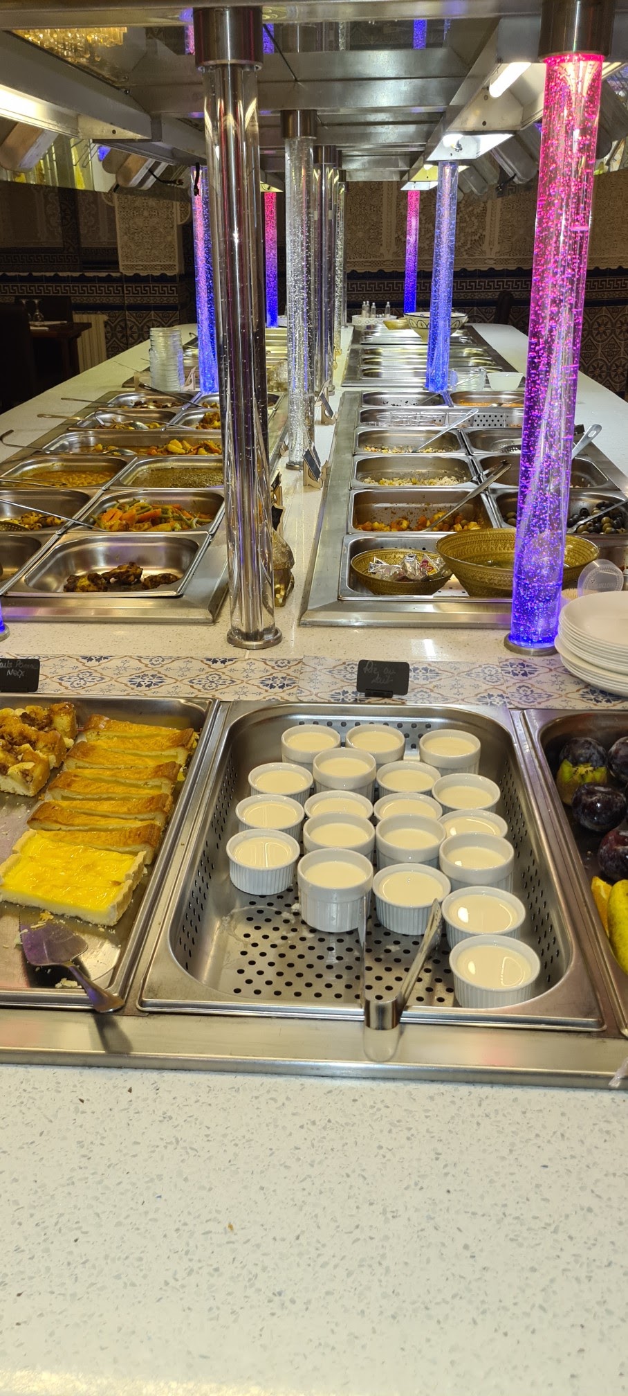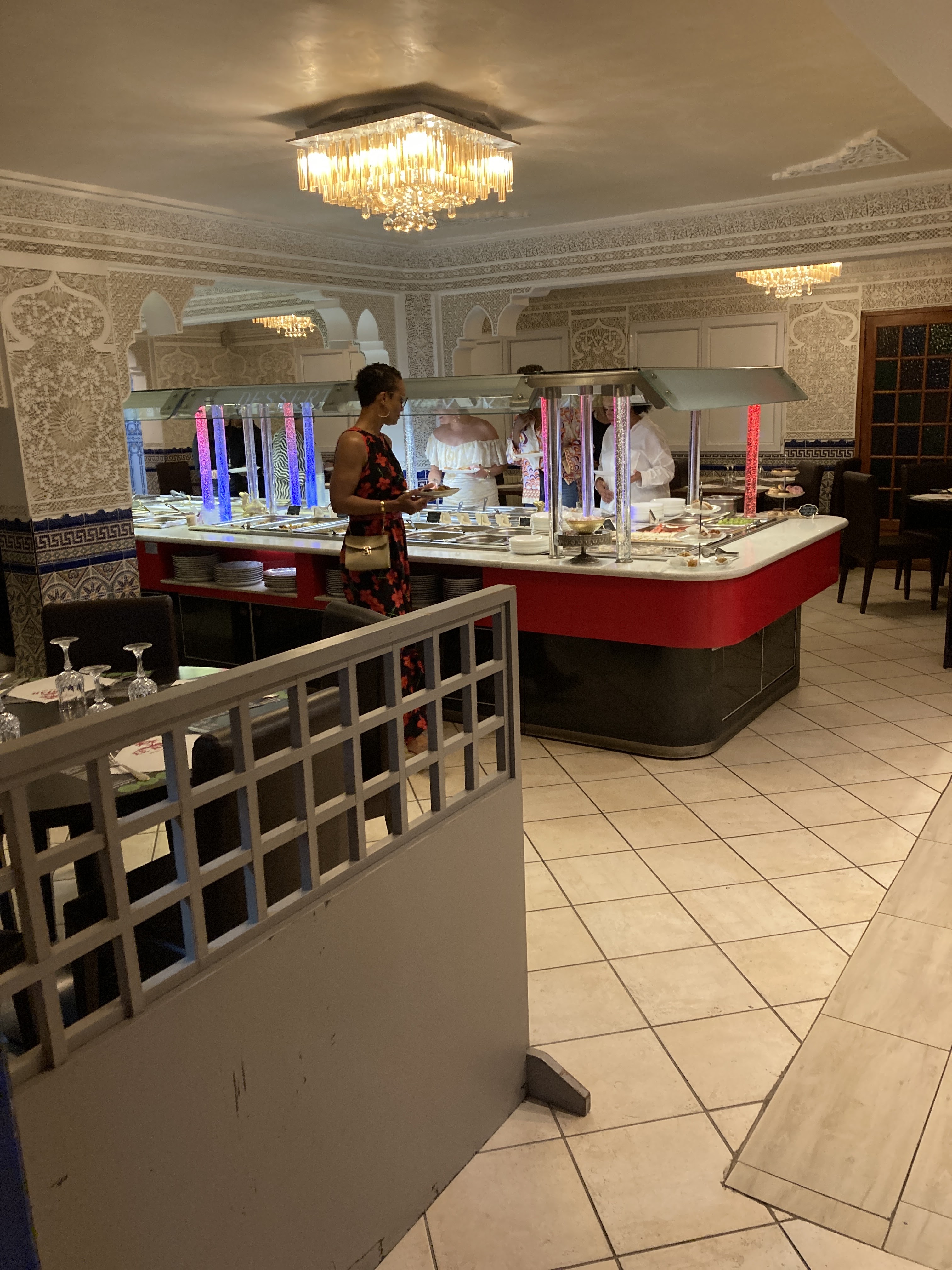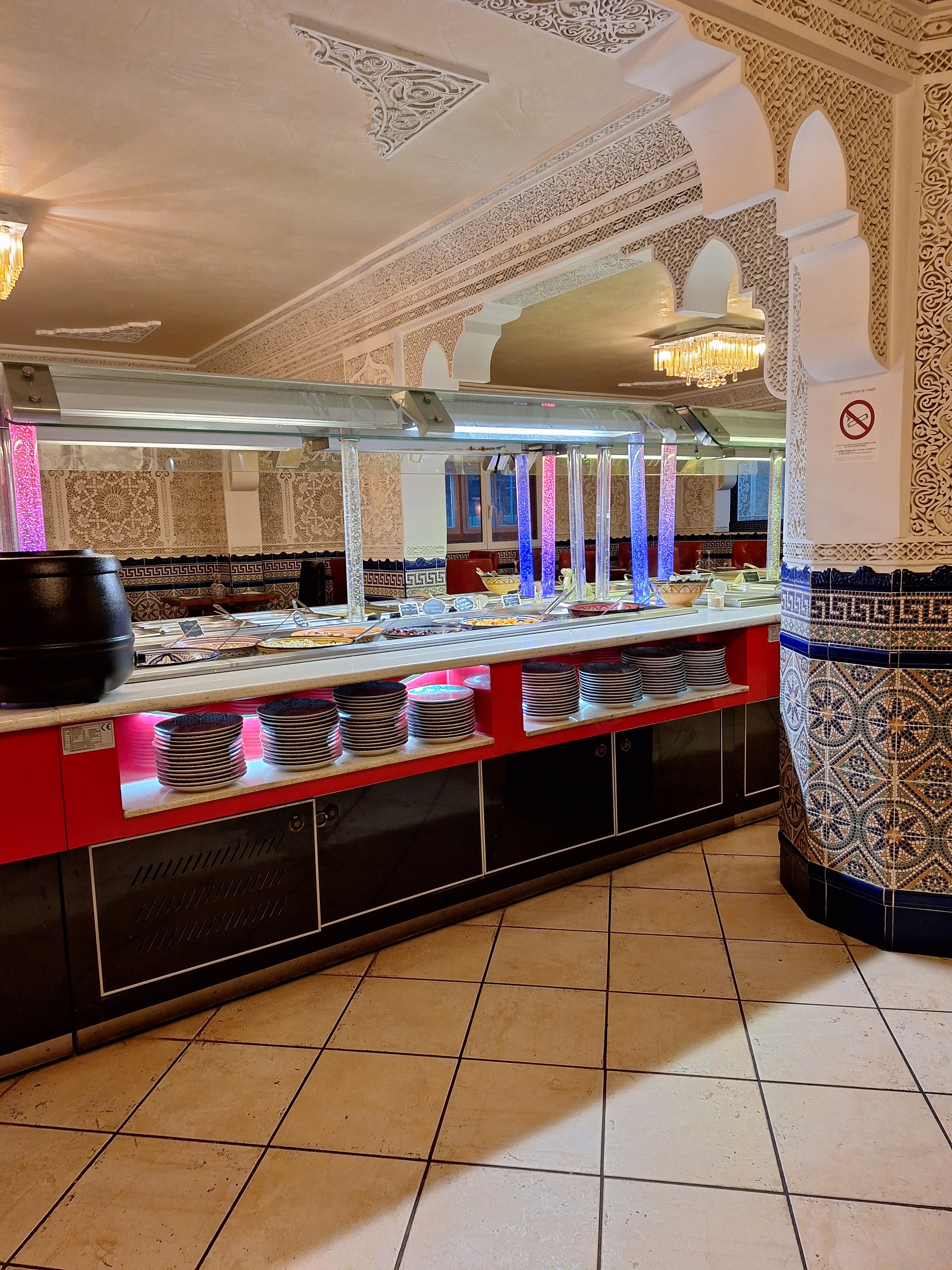 Très déçu, les informations sur google ne sont pas à jour concernant les prix et l’âge pour les menus enfants, arrivés à 21h le buffet était déjà quasi vide pour un samedi soir alors que la salle était à peine remplie (4-5 tables présentes), la nourriture n’est pas exceptionnelle pour notre part (étant déjà venue l’année dernière j’avais étais très surprise de la qualité de la cuisine mais après ce soir extrêmement déçue), le bac de glace : la cuillère pour les boules de glace repose dans un bac d’eau avec une mouche morte qui flottait à la surface c’est clairement inconcevable de laisser tremper la cuillère qui est amenée à être en contact avec les glaces dans ces conditions, les gâteaux orientaux sont assez secs makrout, chebakia, zlabia (hors sablé bien évidemment) et pour couronner la soirée les toilettes sont vraiment pas clean le miroir est rempli de calcaire… seul point positif la serveuse était très gentille et serviable, le rapport qualité prix n’est pas du tout là 77€60 pour 2 adultes 1enfants de 11ans 1 Soda et 1 Diabolo