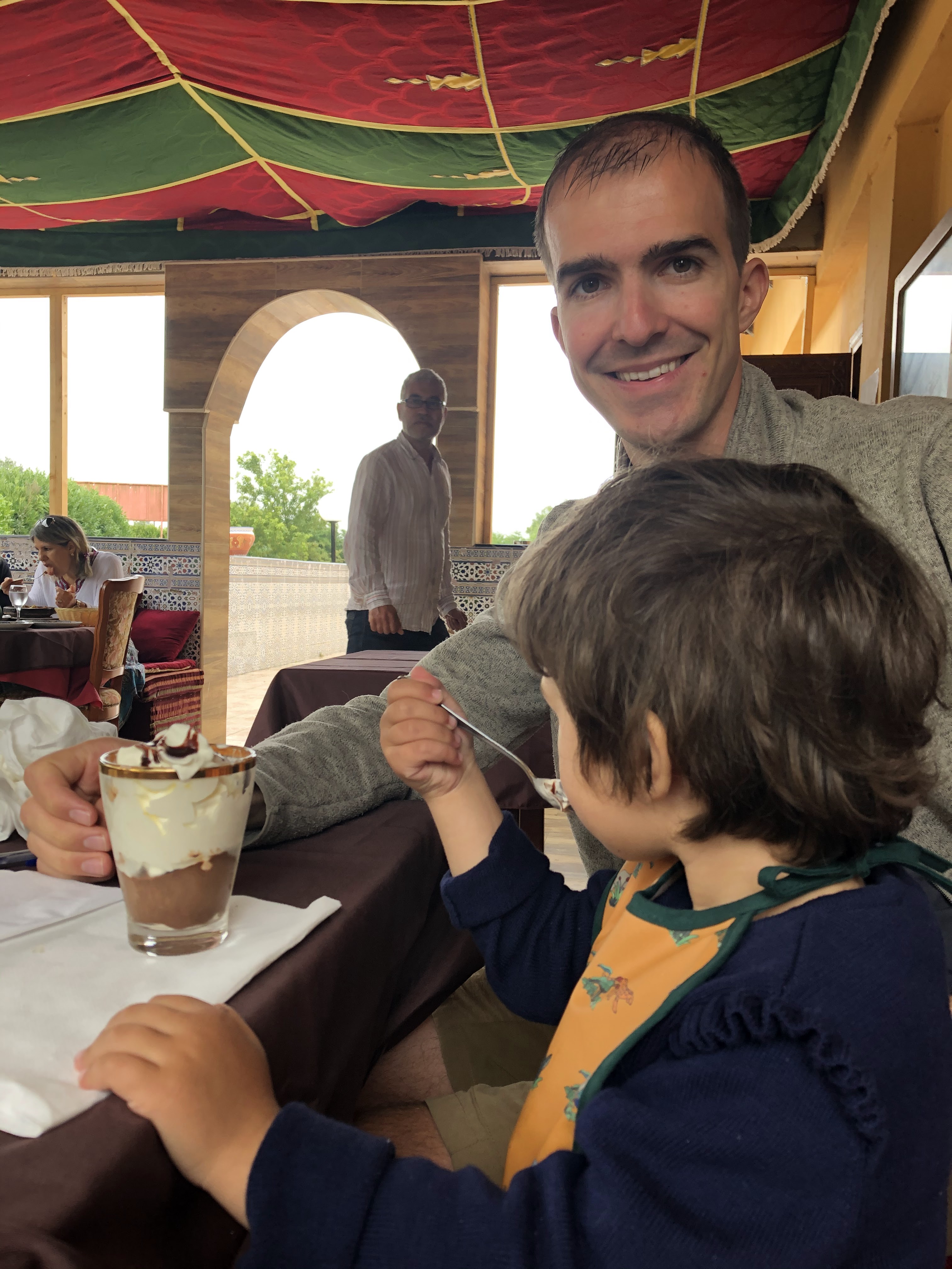 Avec mon mari nous sommes venus avec nos deux enfants de 4 ans et 1 mois. Nous avons d'abord apprécié l'accueil chaleureux, le calme, et le buffet qui est garni il ya du choix et c'est surtout très bon entre les tajines, les couscous, les brick et les crudités vous voyagerai au Maroc jusqu'au dessert avec une belle variété de dessert (pâtisserie, glace, salade d'orange, ananas, verrines au fruit ou chocolat...) La terrasse Intérieur est agréable les sedari son confortable et la pièce aéré par la brise du vent . Nous avons passé un très bon moment Le personnel est disponible et à l'écoute. Nous reviendrons sans hésiter car c'est une bel découverte.