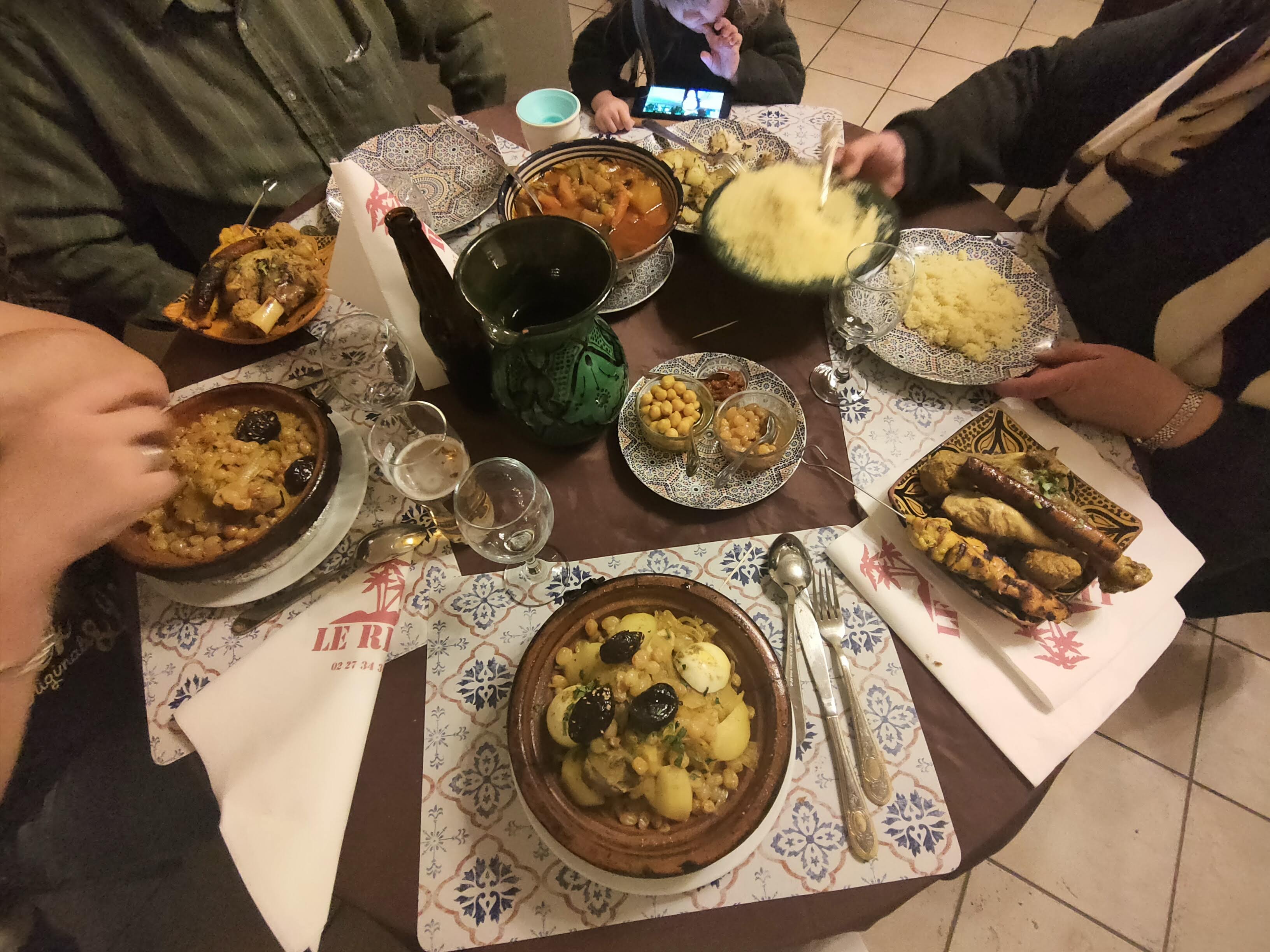 Nous sommes venus en famille par hasard. La salle est grande et rappelle bien les décors des raids du Maroc. L'accueil est très chaleureux et la nourriture très goûteuse et variée. Couscous, tajine, bricks, desserts . .