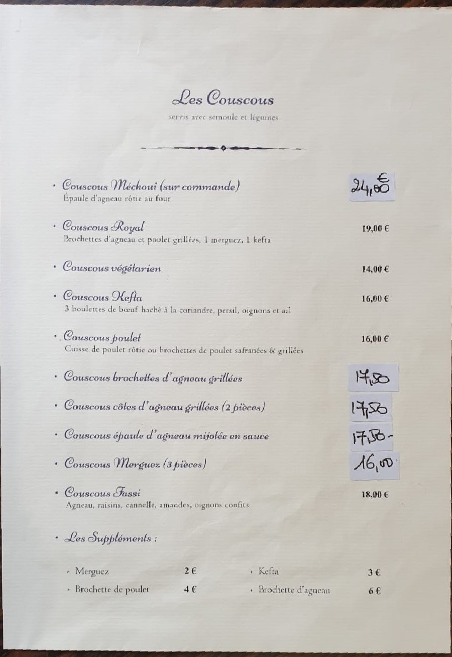 j'ai pris le couscous de base, un peu cher pour ce que c'est, le resto est tenu par deux femmes et un homme, sympa pendant le service mais alors une fois qu'il faut payer... N'espérez pas payer en carte si vous en avez pour moins de 15€ ce sera non même pour 14€...! Bref le sourire à la caisse serait un plus ! Surtout pour le gérant ?