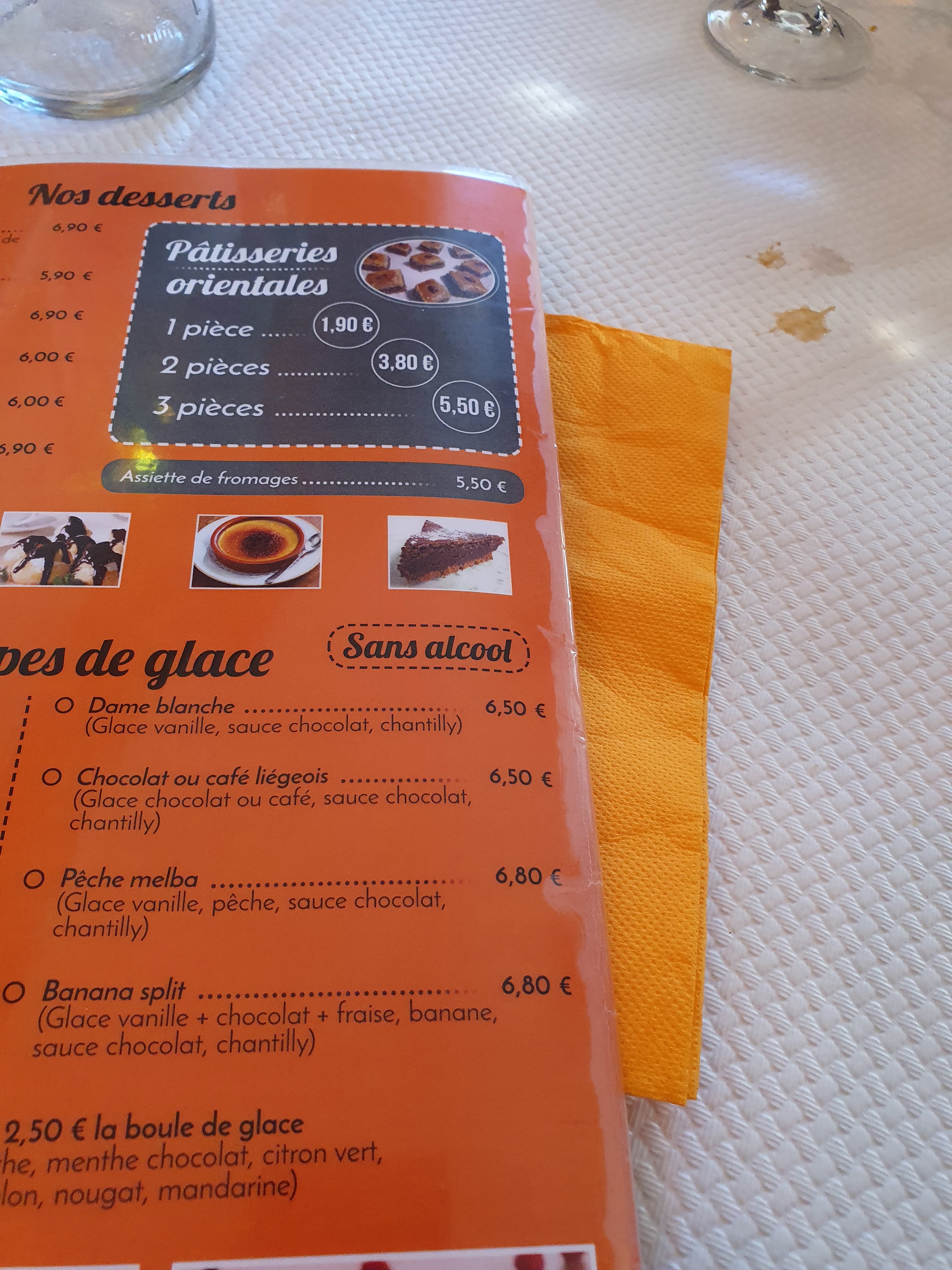 Très bon couscous et le dessert sublime ! Tranche d'orange avec fleurs d'oranger miel 🍯 et cannelle avec une boule de glace à la clémentine miam-miam 👍👍👍👍 Je recommande le couscous à l'agneau mariné c'est se que j'ai pris ! Excellent Le couscous royal, couscous merguez