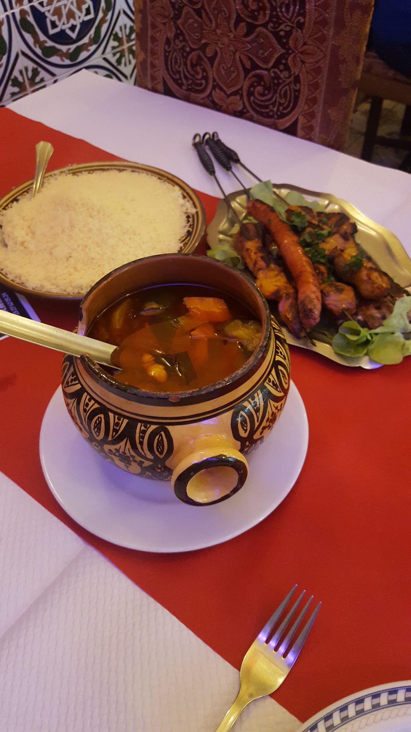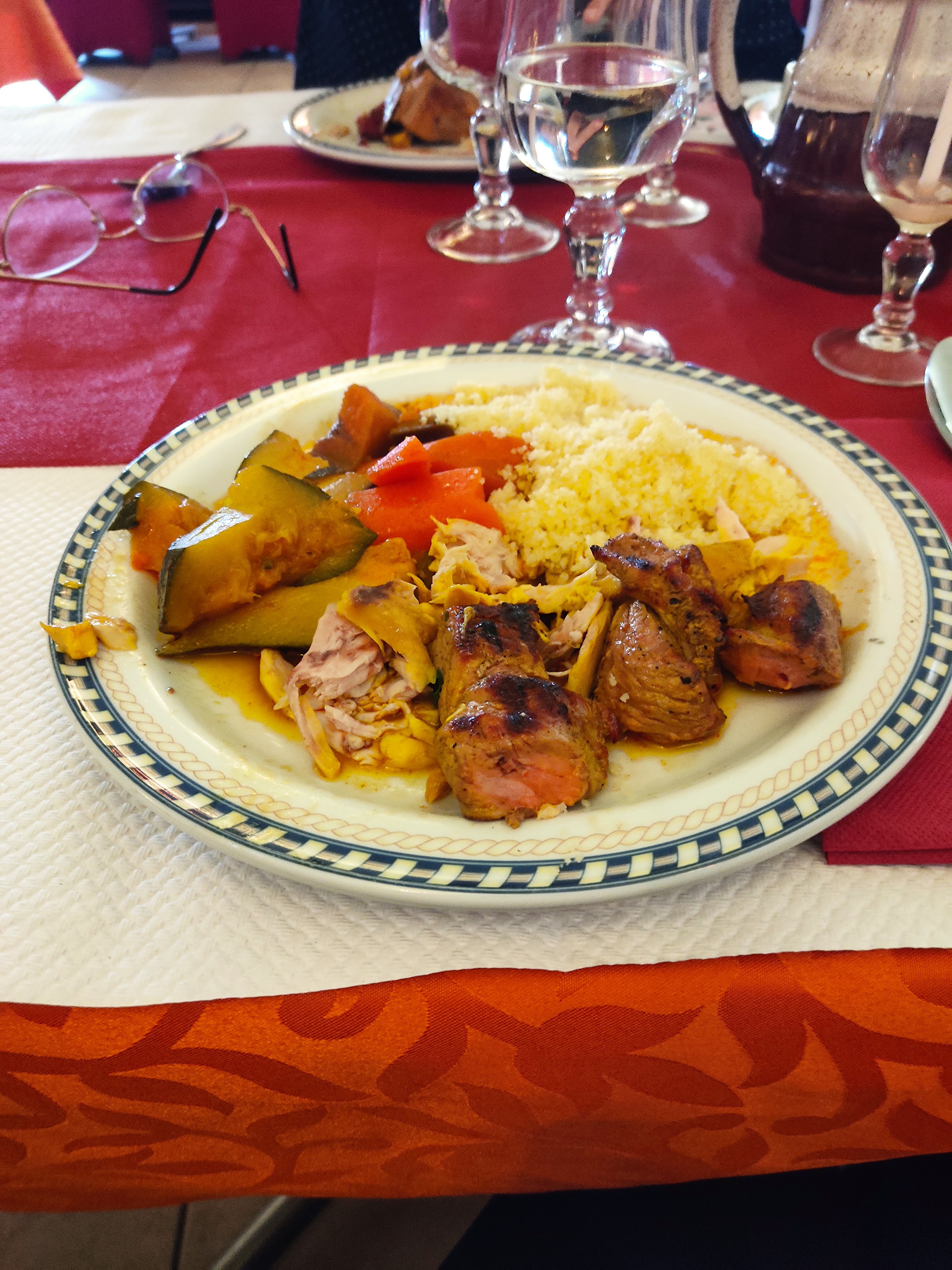 j'ai commandé un couscous avec toutes les viandes et j'ai eu la surprise de ne pas avoir de merguez, d'avoir une brochette de boeuf avec des petits morceaux de viande et d'avoir du mouton enrobé de gras...... C'est dommage car le restaurant à un excellent accueil et le dépaysement est total.