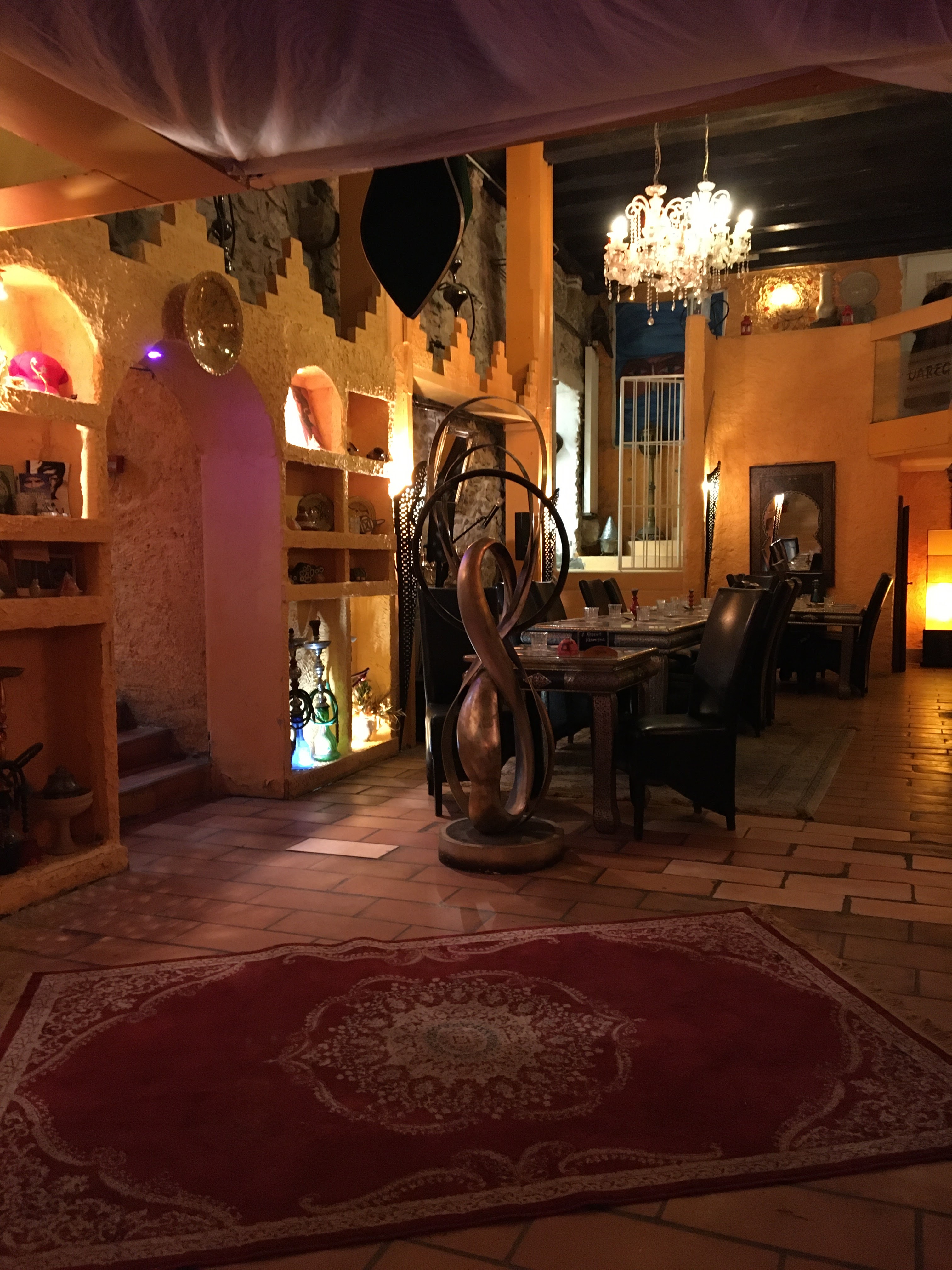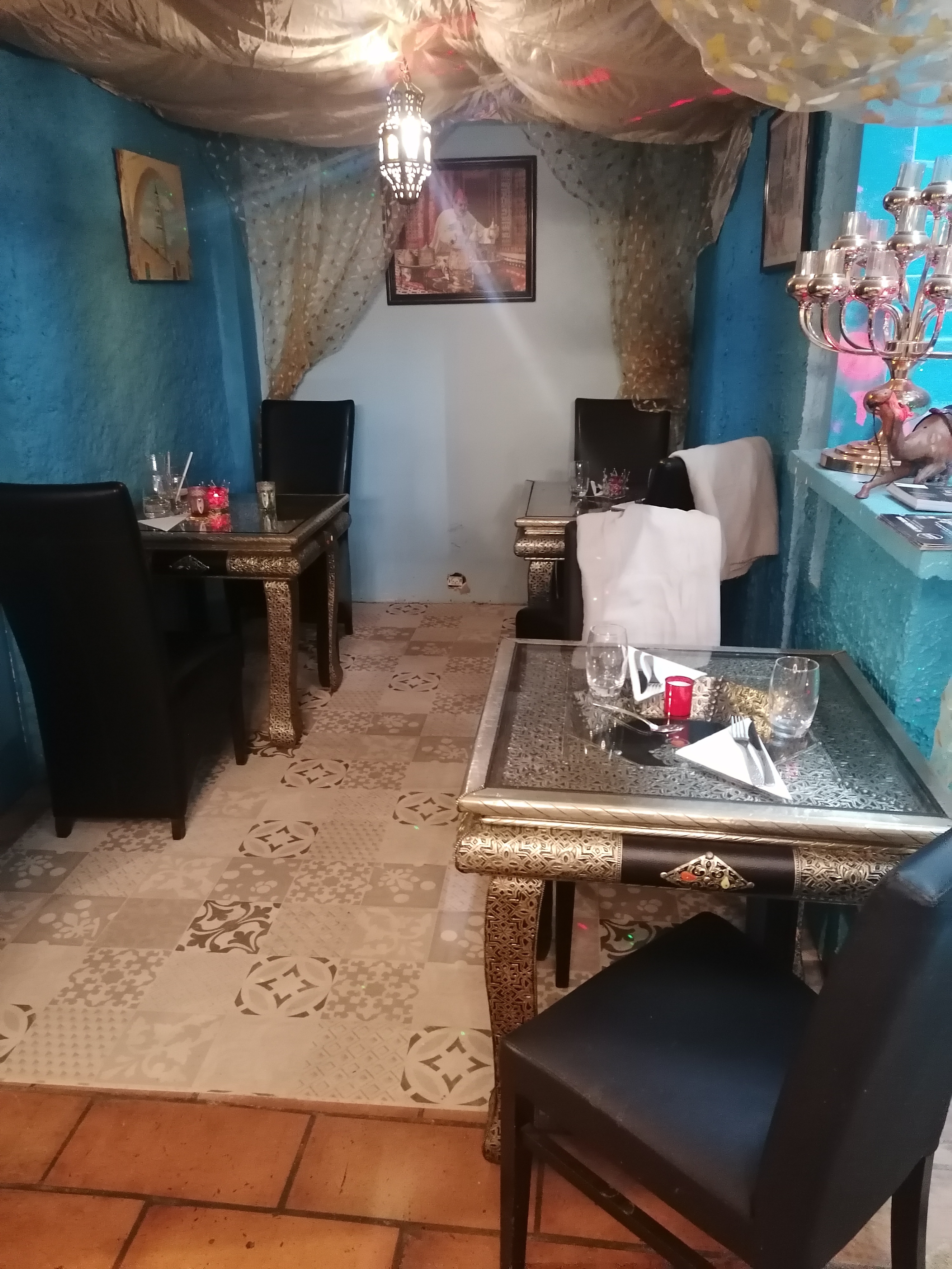 Oh la la! Impeccable. On nous met tout de suite dans l'ambiance orientale, déco magnifique, à l'entrée il y a même un chameau grandeur nature que mon petit a aimé. Musique sympa. Accueil par la serveuse très agréable. Les repas commandés étaient très bons. Nous avons demandé à voir la partie basse, la patronne en personne est venue nous faire visiter tout le resto et il y a de nombreuses salles somptueusement décorées dont une en pierre.Très sympathique, elle a pris le temps de bavarder avec nous. Elle nous a conseillé des petits endroits que nous avons visité par la suite. Merci! Nous devions repasser le lendemain mais nous étions de l'autre côté de la ville à pieds, dommage...nous aimerions y revenir avec grand plaisir. C'est rare d'être content de payer et je suis assez critique mais quand c'est bien il faut le dire. En résumé : c'est beau, c'est bon, on s'y sent bien et on est bien accueillis.