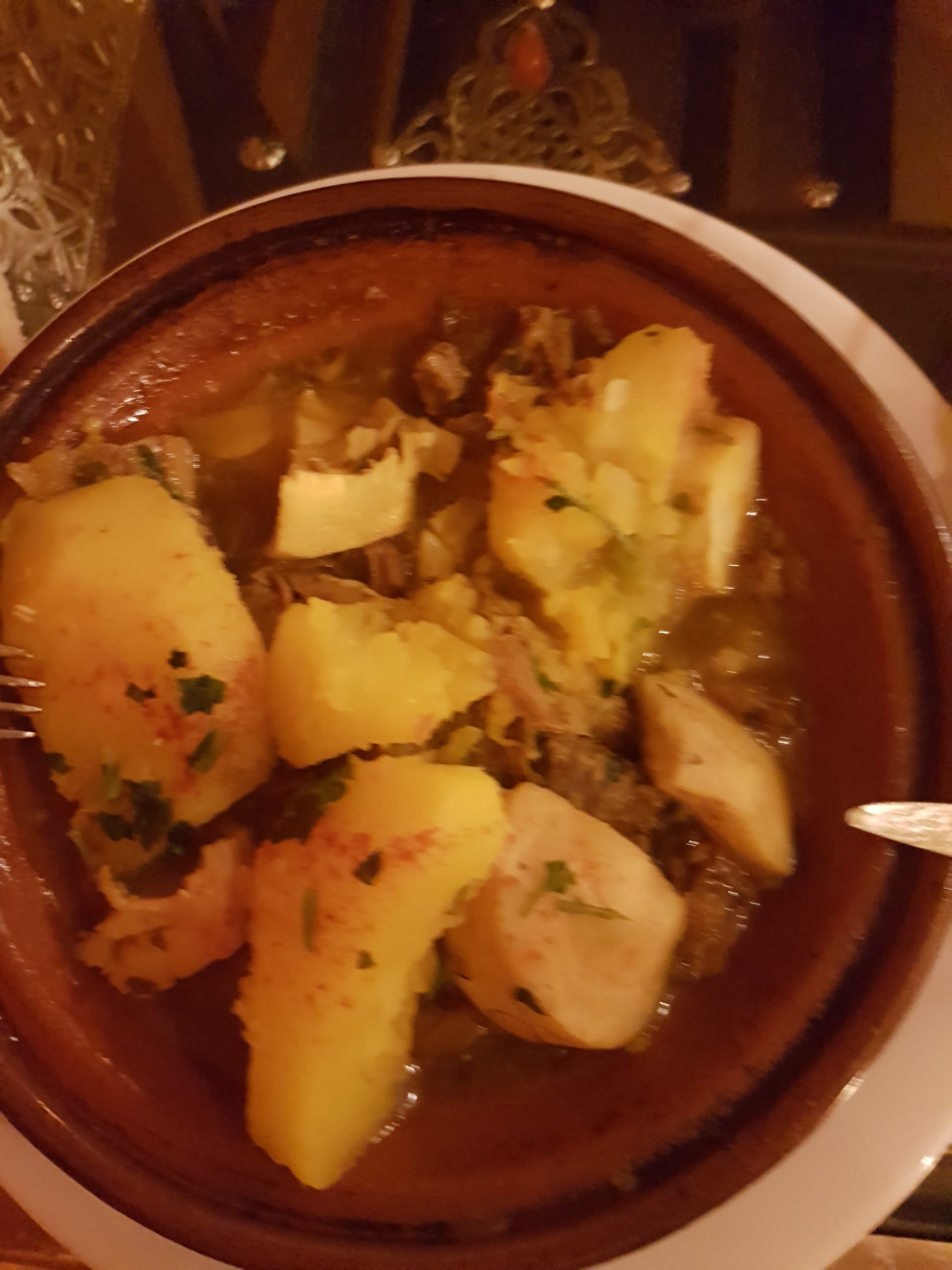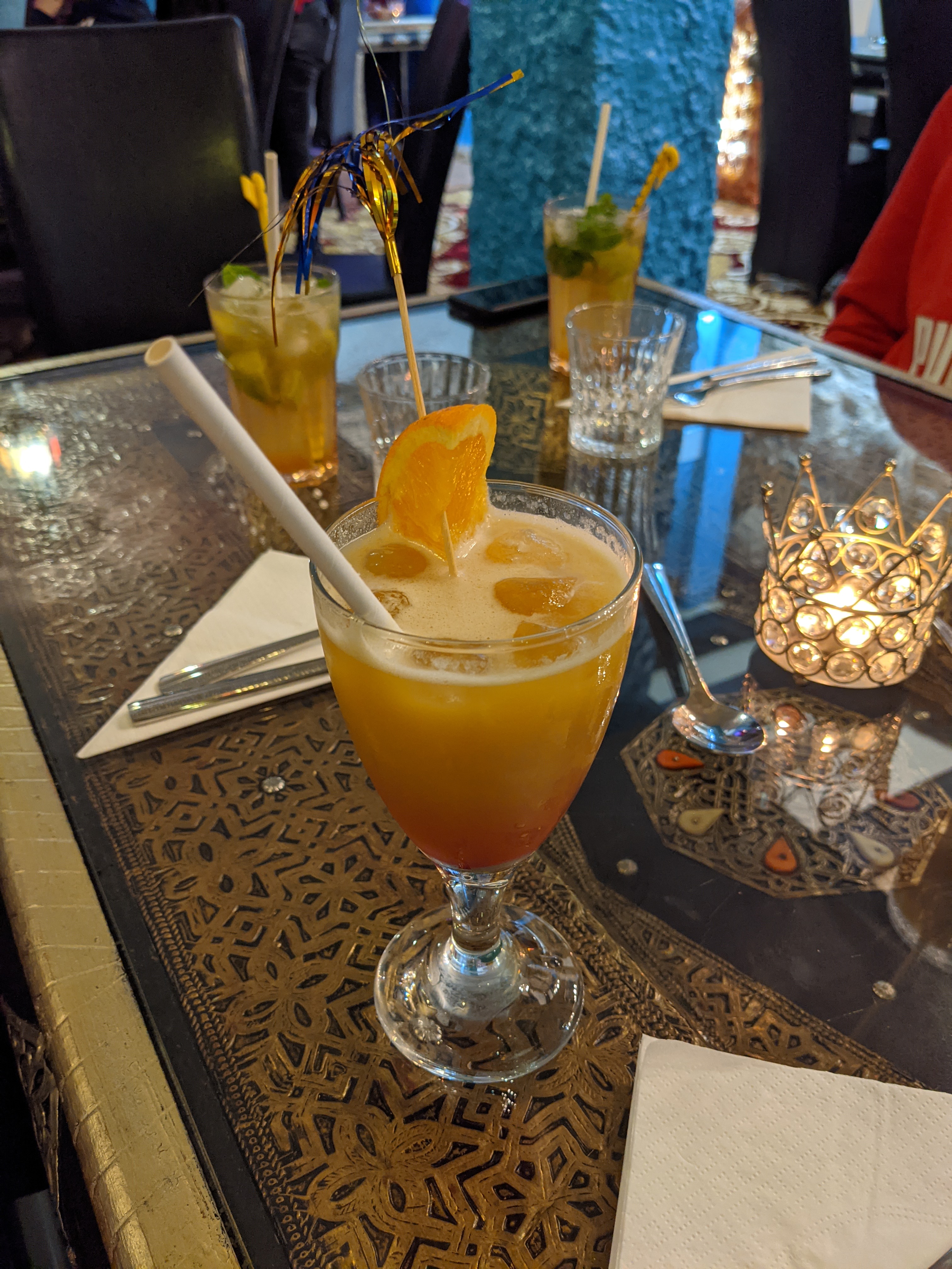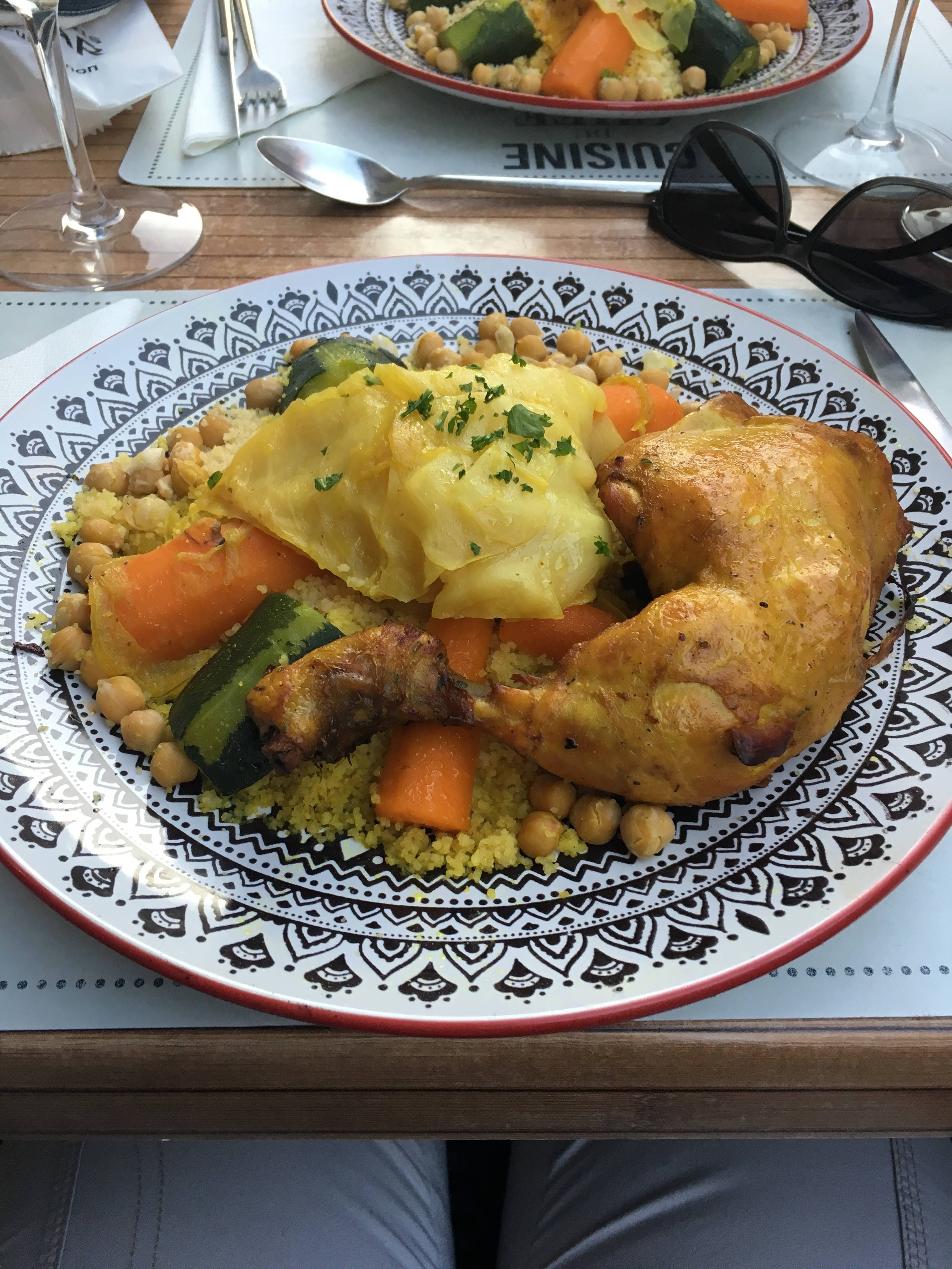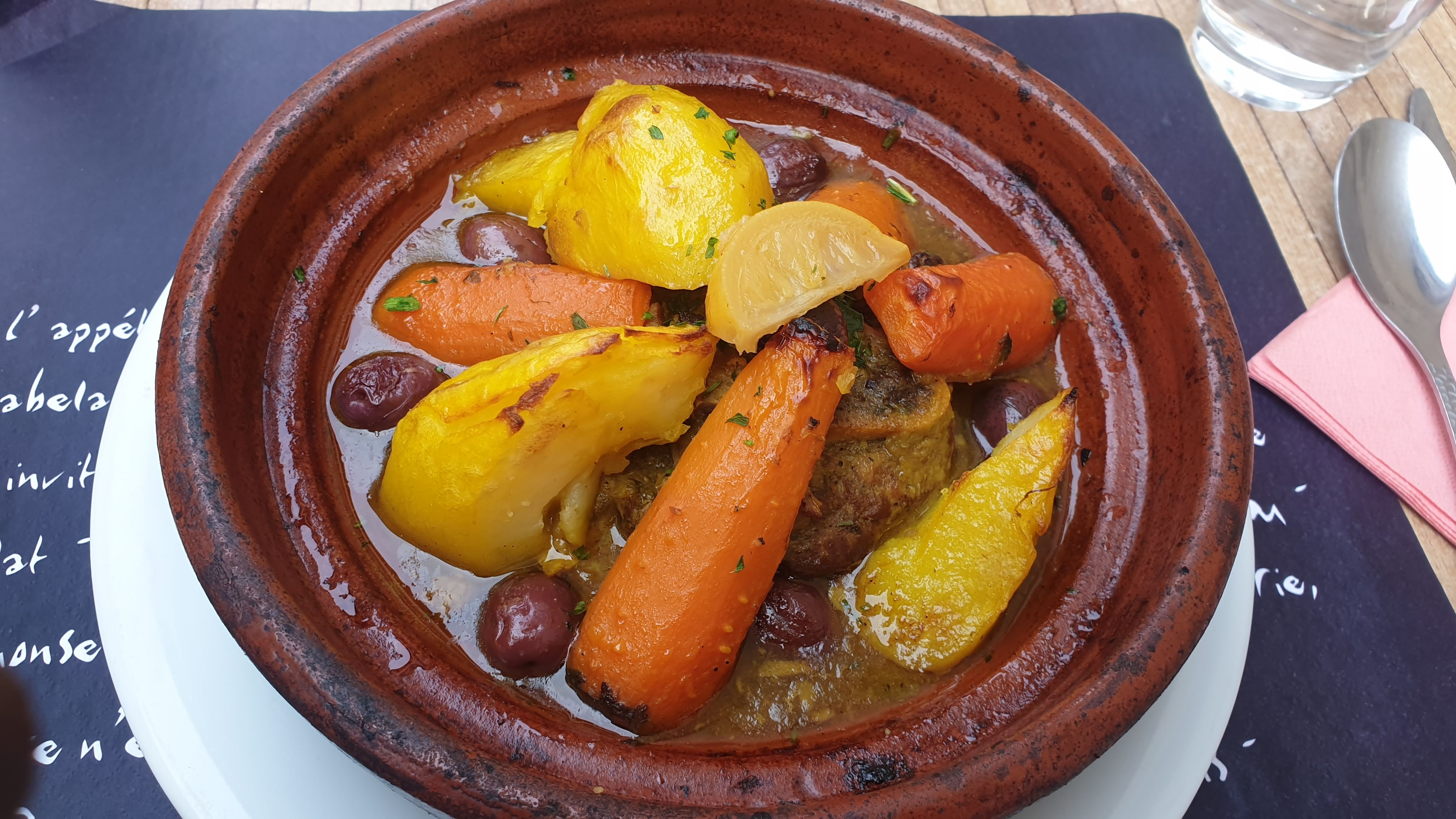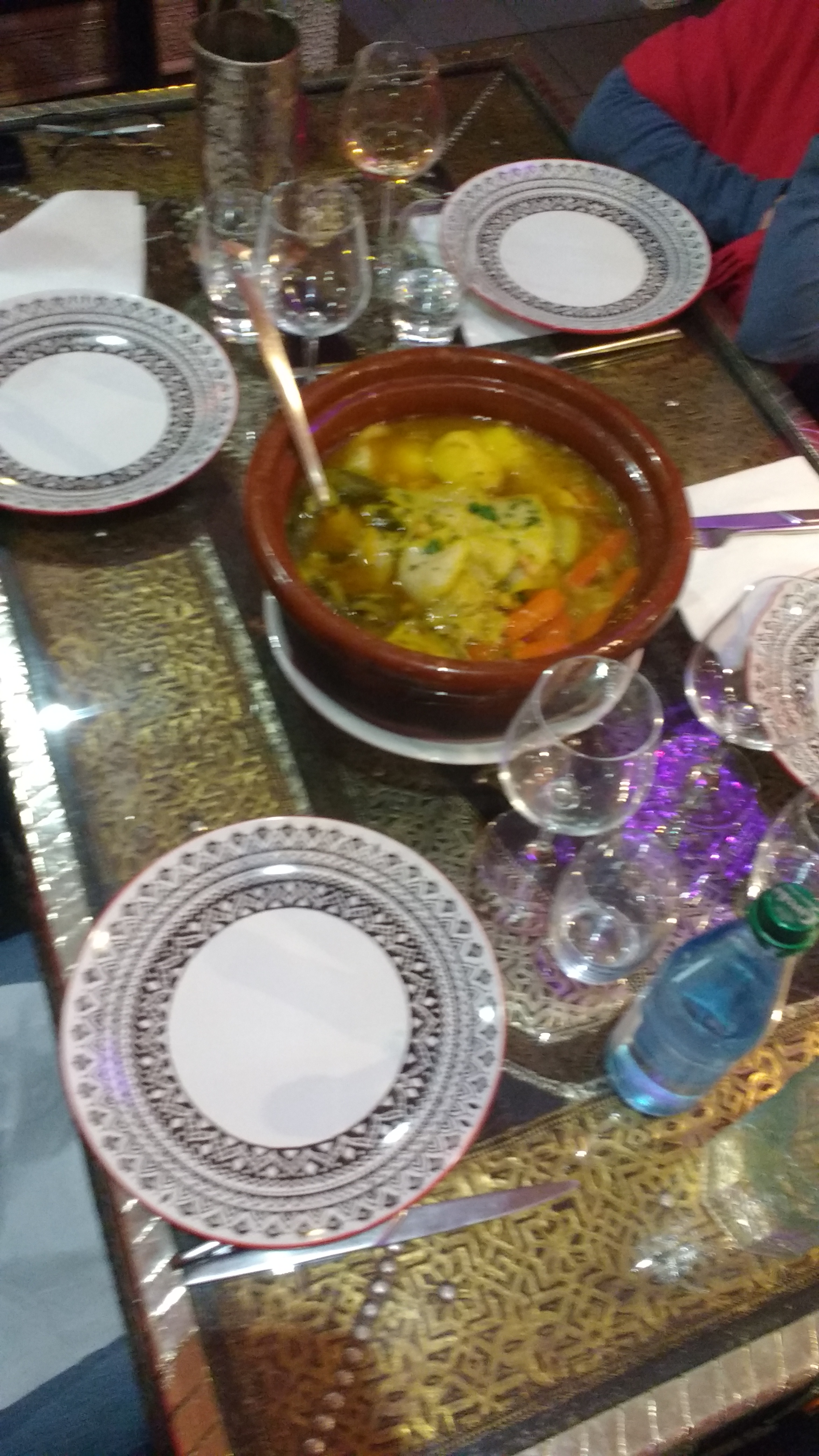 Assez déçu de mon plat (Tajine poulet, citron confit). En dehors du poulet qui était sec (j'en ai parlé à la serveuse) c'était correct. Mais ce qui fait que j'ai mangé une patate et une carotte dans une sauce au citron confit et des olives. A plus de 18 euros le plat ça fait cher tout de même. Le thé à la menthe était bon...