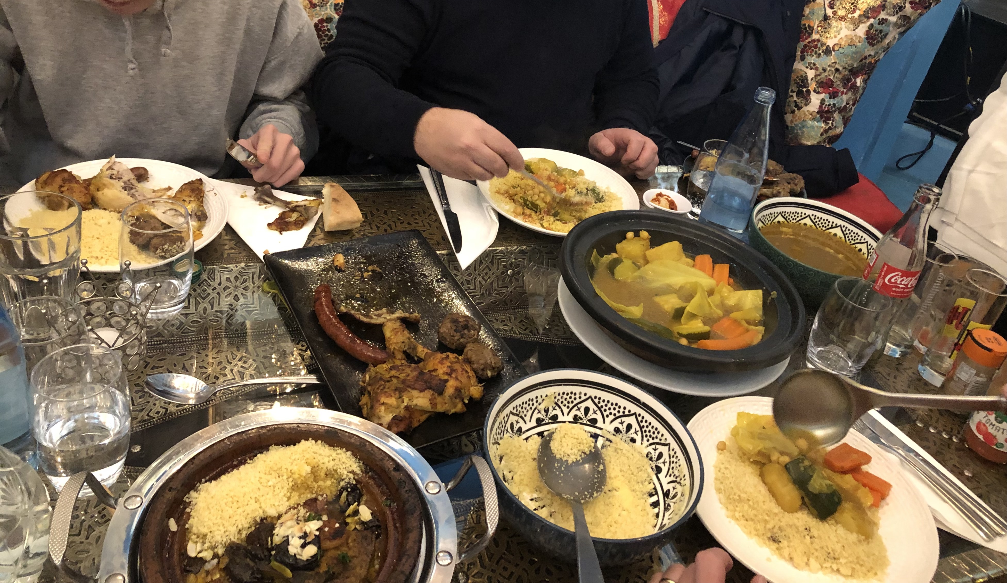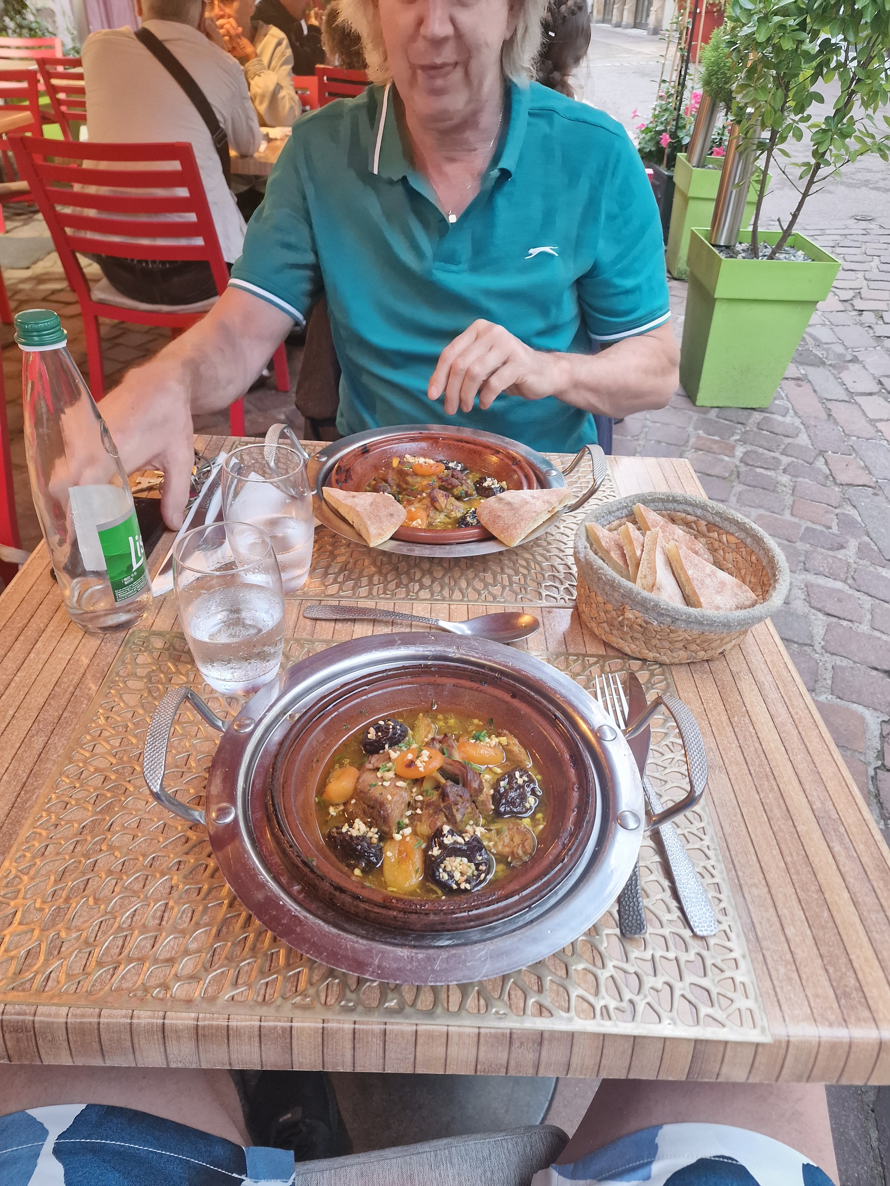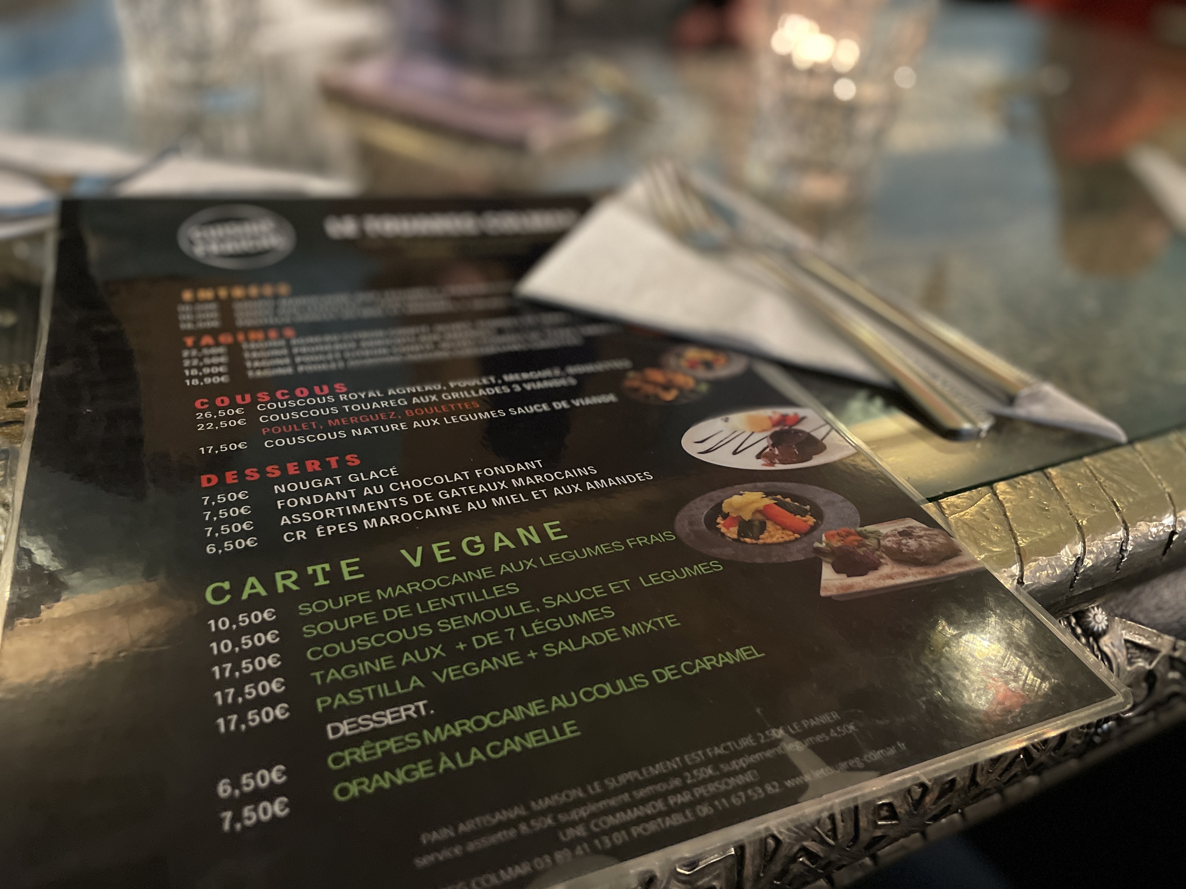 Nous avons été reçus avec beaucoup de gentillesse. La commande a été prise rapidement. Nous avons attendus juste ce qu'il faut pour voir arriver des plats bien chauds avec des légumes pas trop cuits, légèrement croquants et savoureux pour les tajines (poulet citron confit ou végan) ou les couscous, salade royale. De bons produits (légumes, viandes). Personnel à l'écoute pour les régimes particuliers (sans gluten, lactose, protéines animales). Une ambiance typique, conviviale et agréable (décor, musique). Petit plaisir pour terminer le repas avec les pâtisseries et le thé royal. Personnel honnête (porte-feuille perdu avec beaucoup d'argent et restitué en intégralité). Nous avons mangé 2 fois et gardons de beaux et bons souvenirs. Petit bémol en hiver pour le courant d'air glacial venant du dehors chaque fois que la porte s'ouvre (passage en décembre) d'où seulement 4 étoiles sur 5. Nous reviendrons avec plaisir si nous passons de nouveau par Colmar.