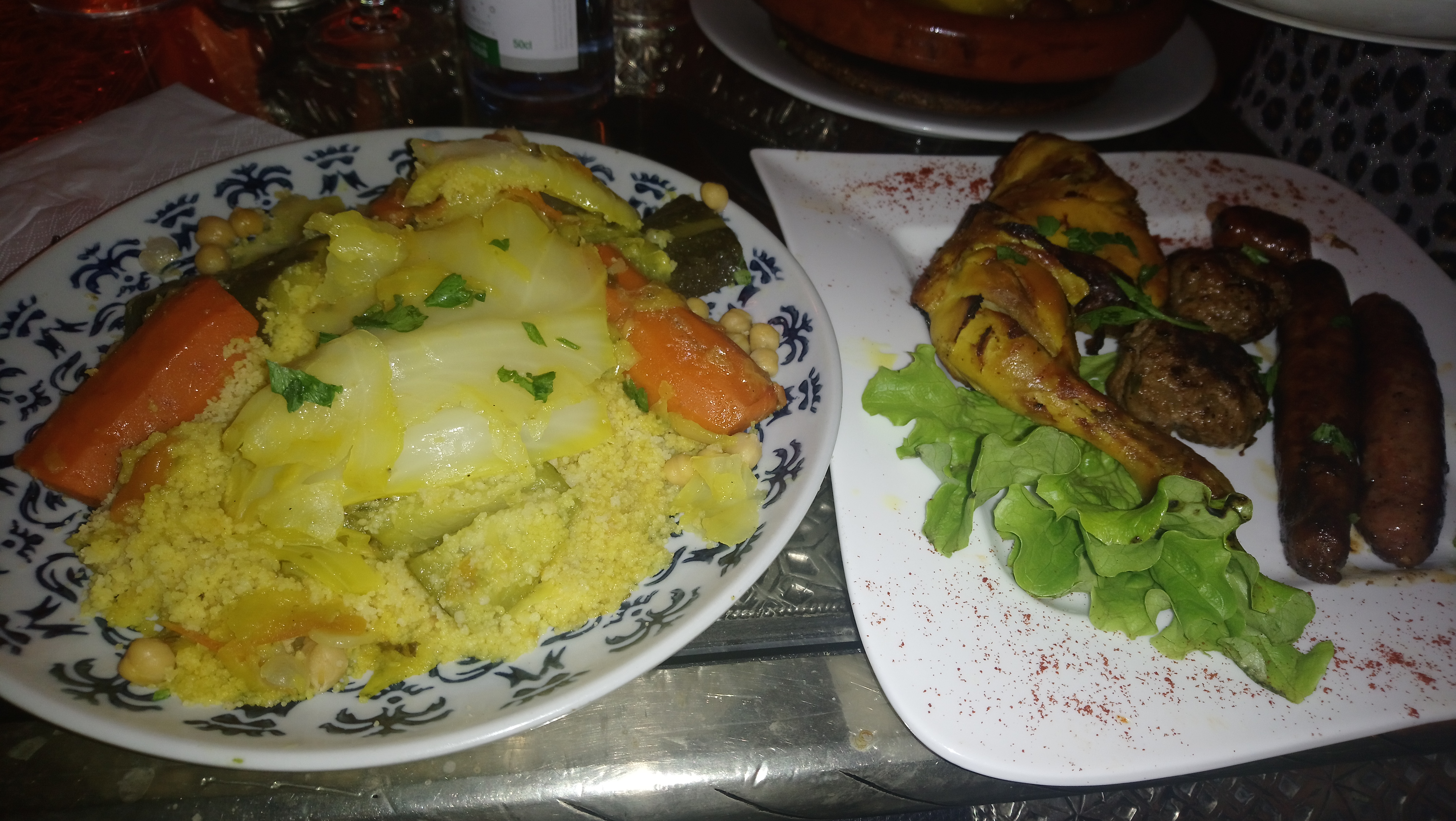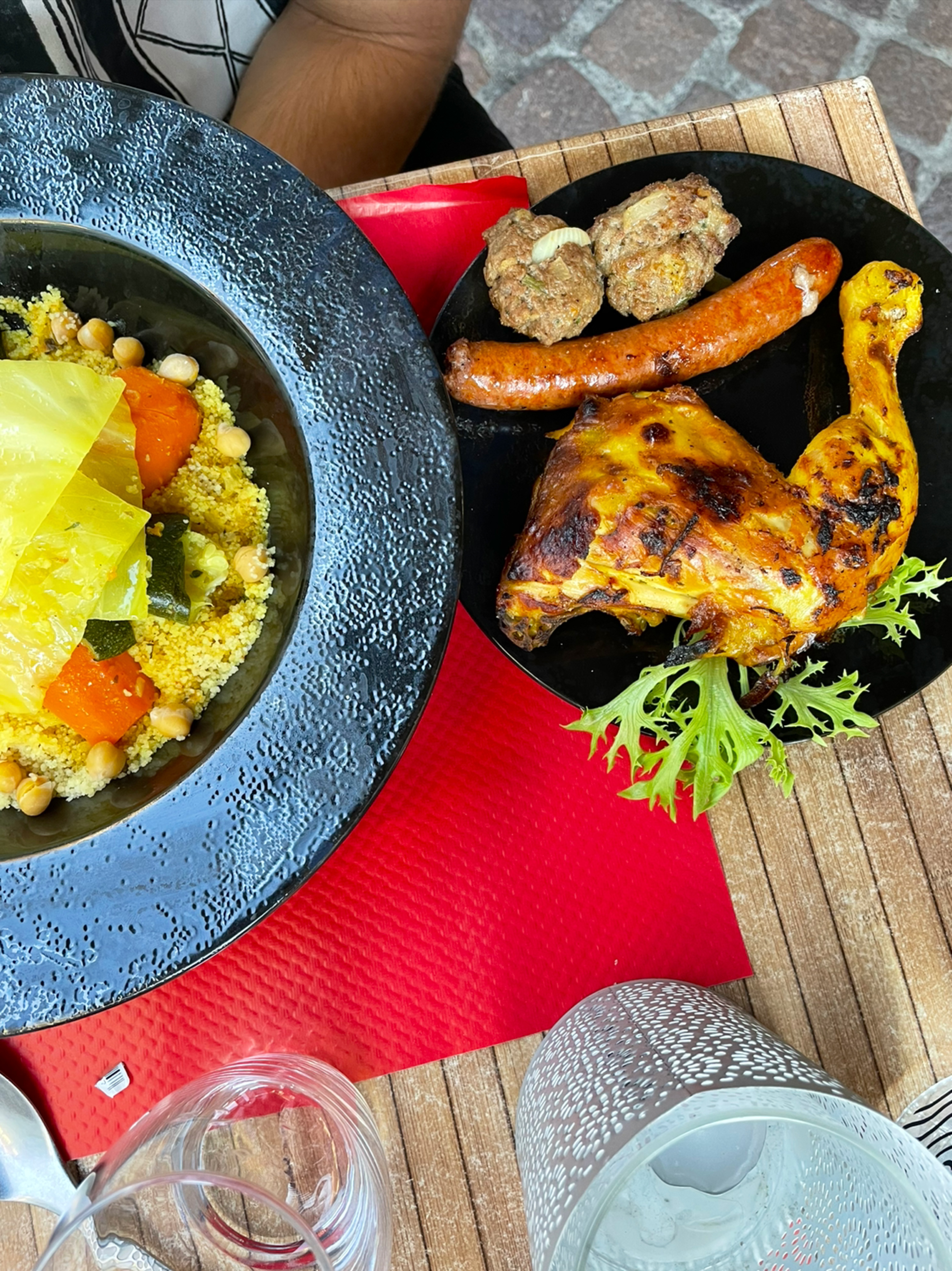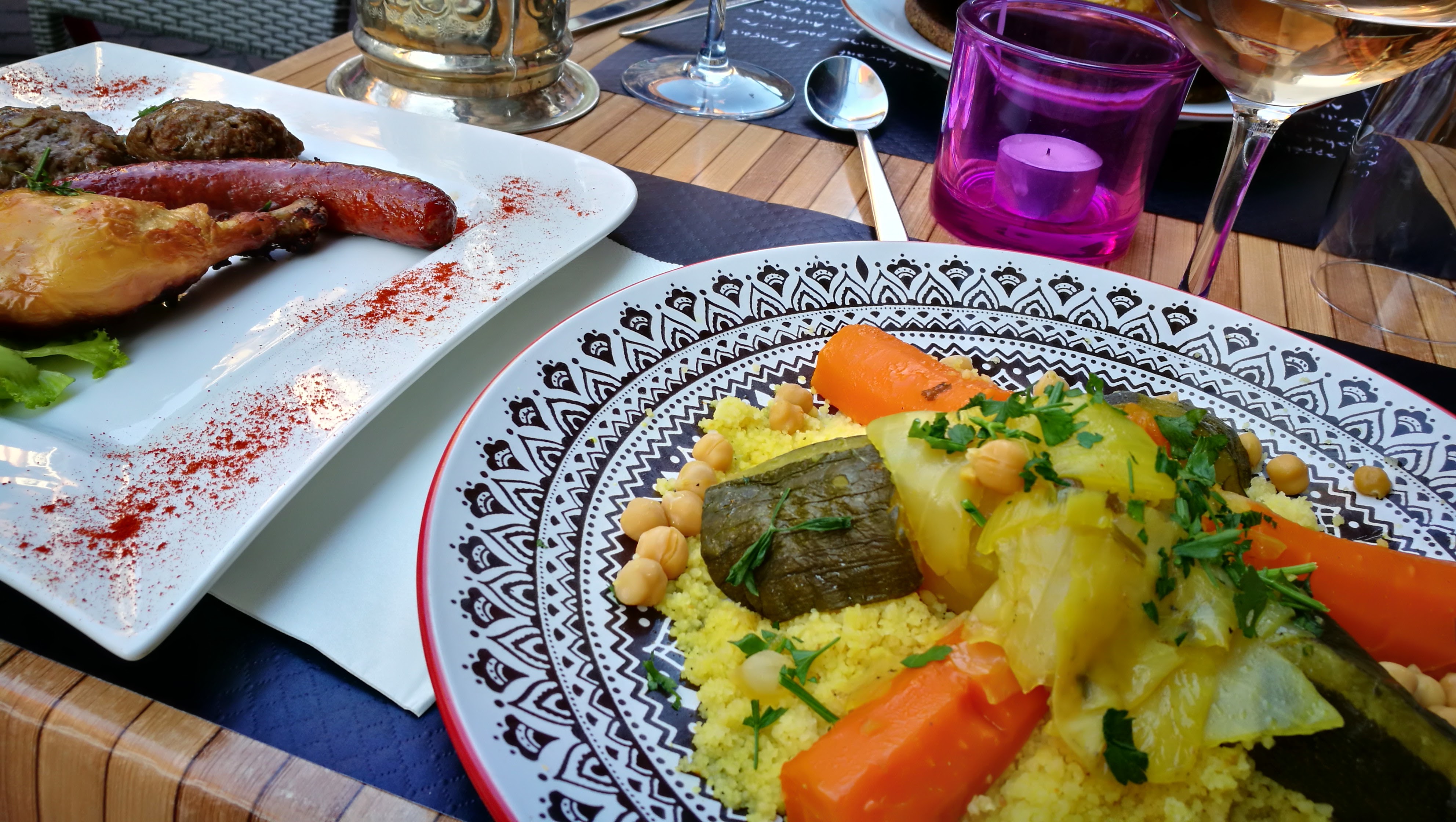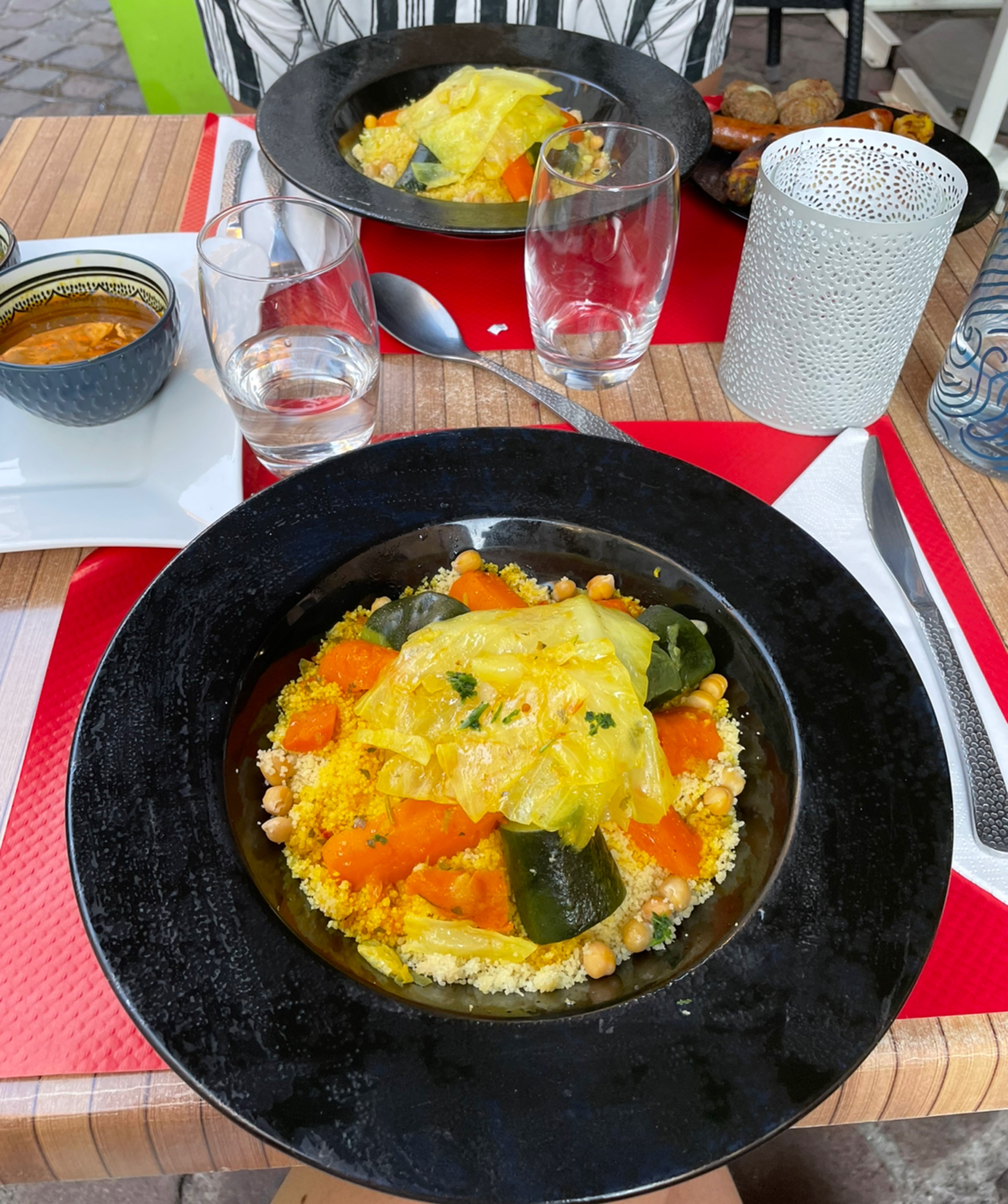Dans un premier temps, ce restaurant nous a en quelque sorte sauvé la vie, dans la mesure où trouver à manger à Colmar un dimanche soir du pont du 14 juillet à 22:00 relevait de la mission quasi impossible. Or, alors que deux tables étaient encore occupées, mais en étaient au dessert ou s’apprêtaient à régler leur addition, on a accepté sans sourciller de nous accueillir en nous informant que des plats manquaient à la carte à cette heure. Dans un second temps, le couscous était de qualité avec une graine cuite à point : le serveur nous a informés que deux calibres de graines constituaient la semoule. Par ailleurs, les légumes (chou, carotte, courgette, navet et pois chiche) n’étaient non plus pas trop cuits et même si le choix de viandes était réduit au poulet, comme on nous l’avait fait savoir, ce dernier, sans être du poulet fermier, n’était pas celui qu’on trouve dans nombre de restaurants et je ne cible pas ainsi que des dits restaurants des grandes firmes multinationales de la restauration rapide. Enfin, la cerise arriva sur le gâteau, lorsque, après l’avoir réglé puis encore remercié pour son accueil et la qualité tant de son assiette que de son service, le serveur nous appris que la maison était marocaine, ce qui a achevé de ravir l’ancien immigré que je fus, pendant 3 ans, au royaume chérifien.
