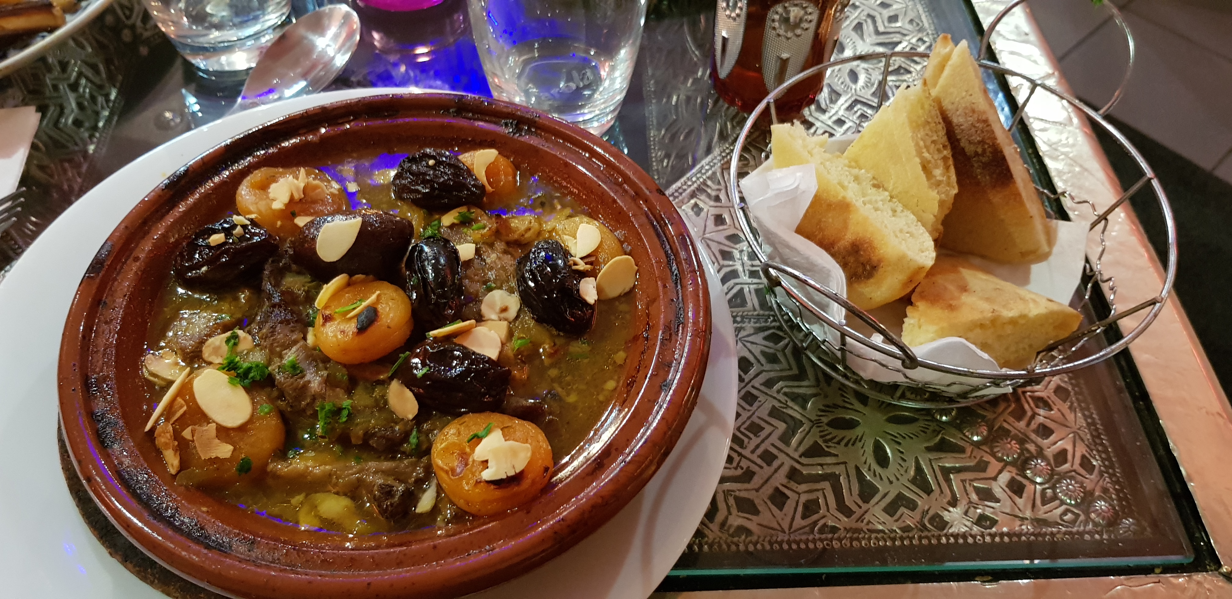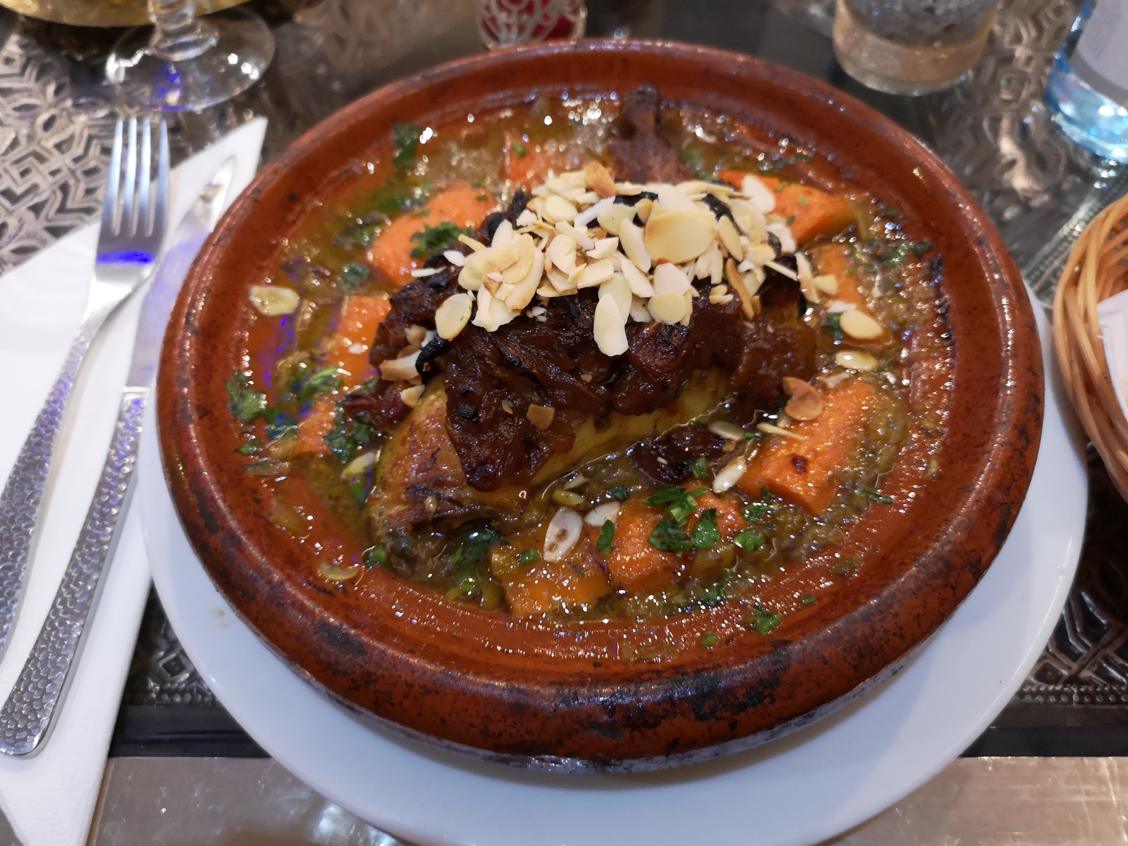 Le soir de la finale de l’Euro de foot, l’ambiance n’était pas très locale, mais j’ai vu le début du match ... Nous avons pris des tajines de poulet aux raisins secs et amandes. C’était très bon ! Le service etait très sympa. Le serveur était rapide et drôle ... Un bon moment... La prochaine fois, j’essaierai la pastilla de poulet au miel et amandes. Ce que j’ai vu sur le plat d'un autre client semblait plein de promesses.