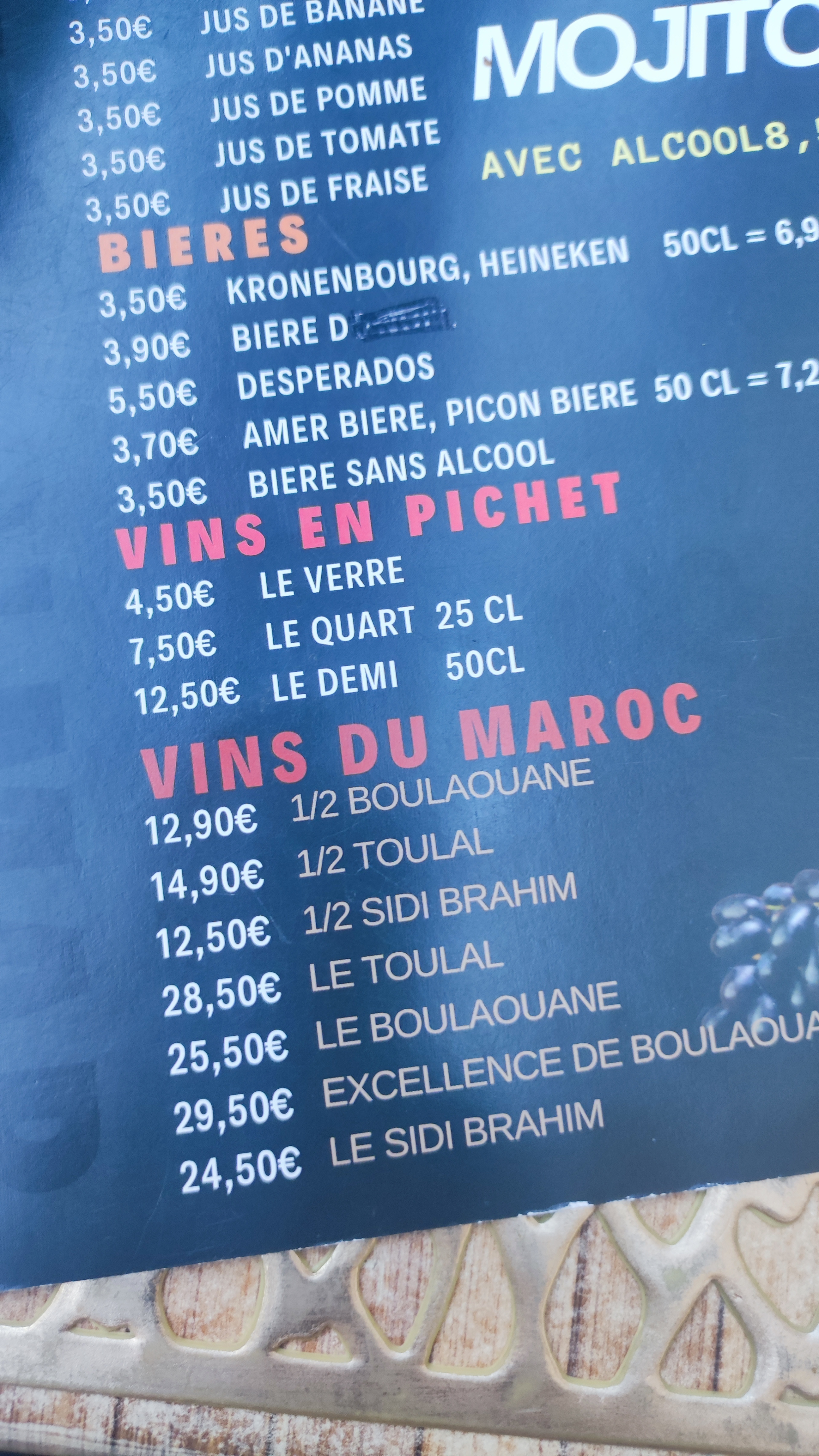 Bonjour, attention aux photos qui ne reflètent pas la réalité de votre assiette , couscous servi avec peu de présentation , très déçu par la viande mal ou trop cuite pas de goût sauf si on rajoute de la sauce et du piment. Dommage le cadre est dépaysant . Tajine un peu cher pour la quantité .