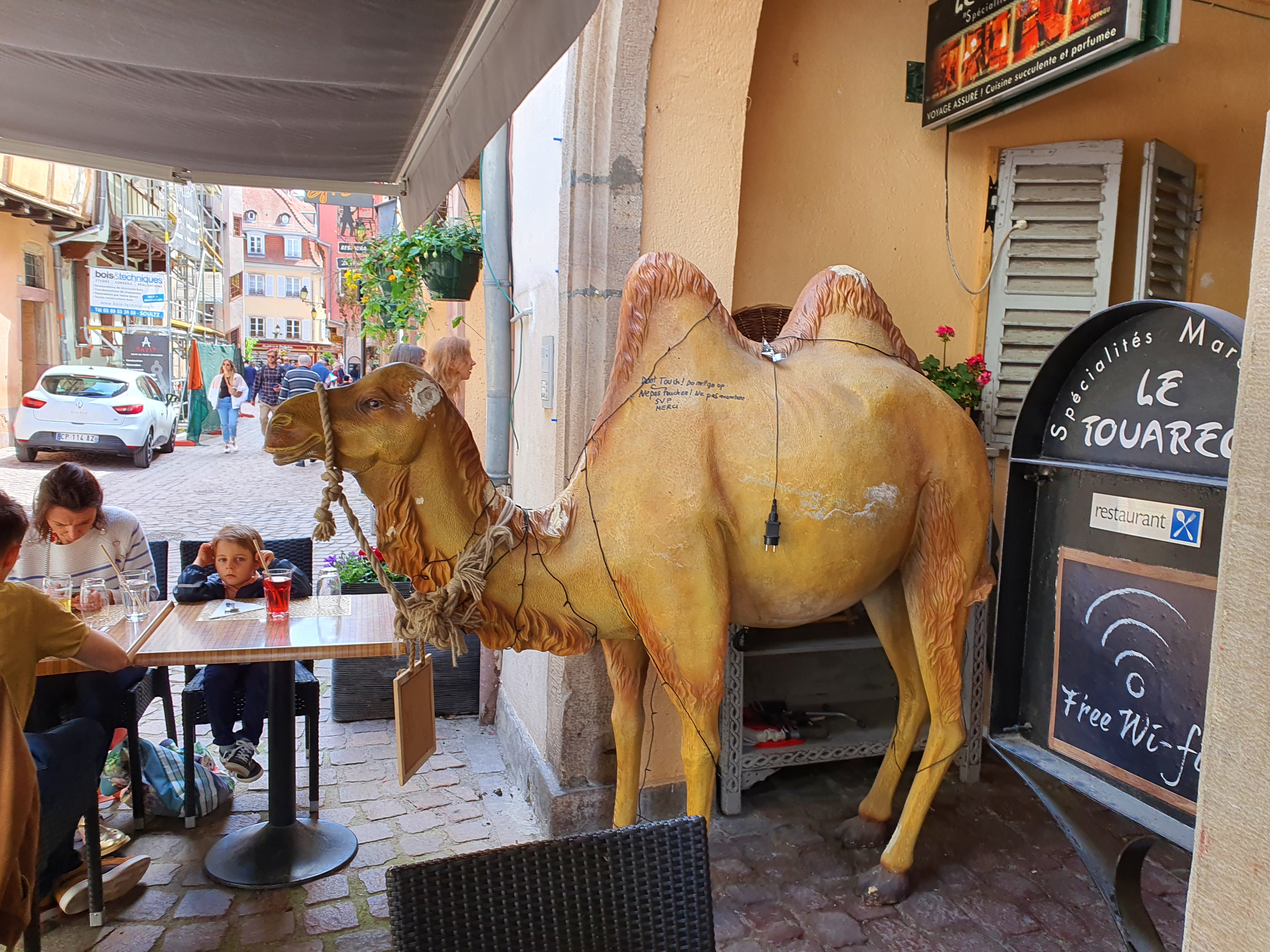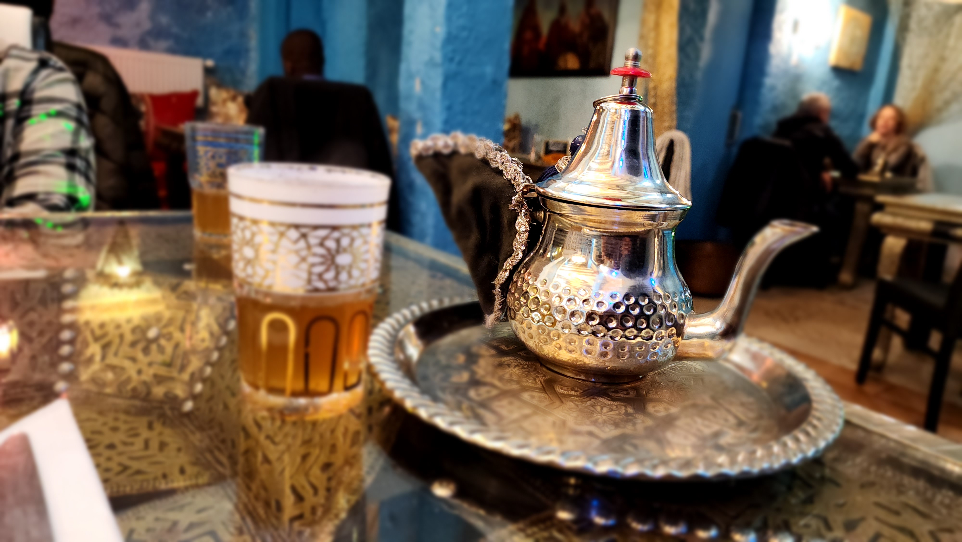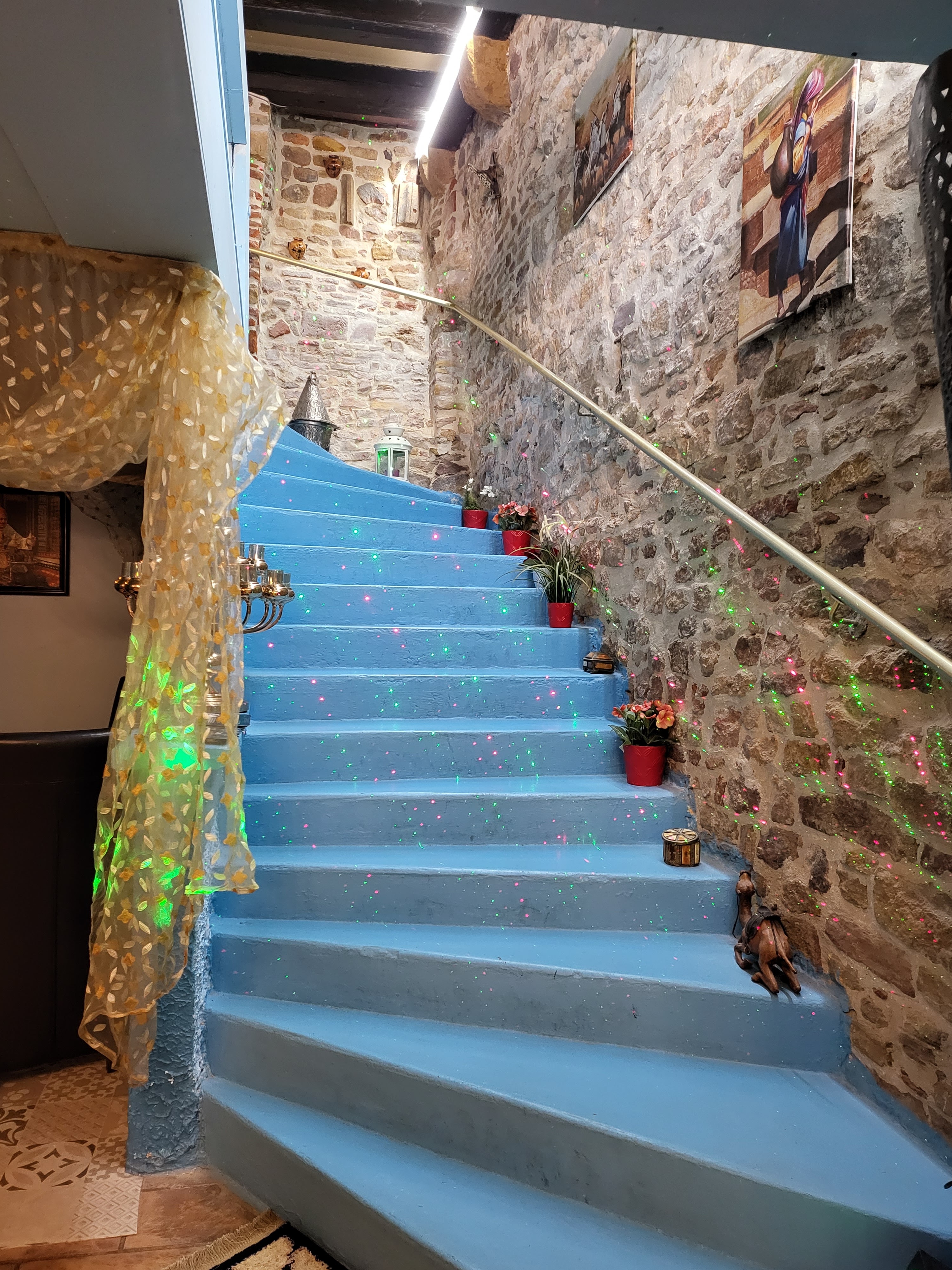Un petit bout de Maroc en plein centre ville de Colmar, et ça fait plaisir de déguster de la vraie cuisine, faite maison comme là bas :) La soupe de lentilles était délicieuse, succulente : bien épicée, bonne texture, bonne huile d'olive. Le thé à la menthe servi dans sa jolie théière traditionnelle était lui aussi parfait : parfumé avec je pense une pointe de fleur d'oranger. Il faisait beau, la petite terrasse avec le chameau décoratif est très sympa pour se poser. En bas du restaurant il y a une super salle typique salon marocain traditionnel pour fêter anniversaire, mariage et avec le matériel (platines dj) ! :) ça valait le coup de descendre ces quelques marches bleues de Chefchaouen et ça donne envie de revenir surtout avec un Personnel aussi gentil.