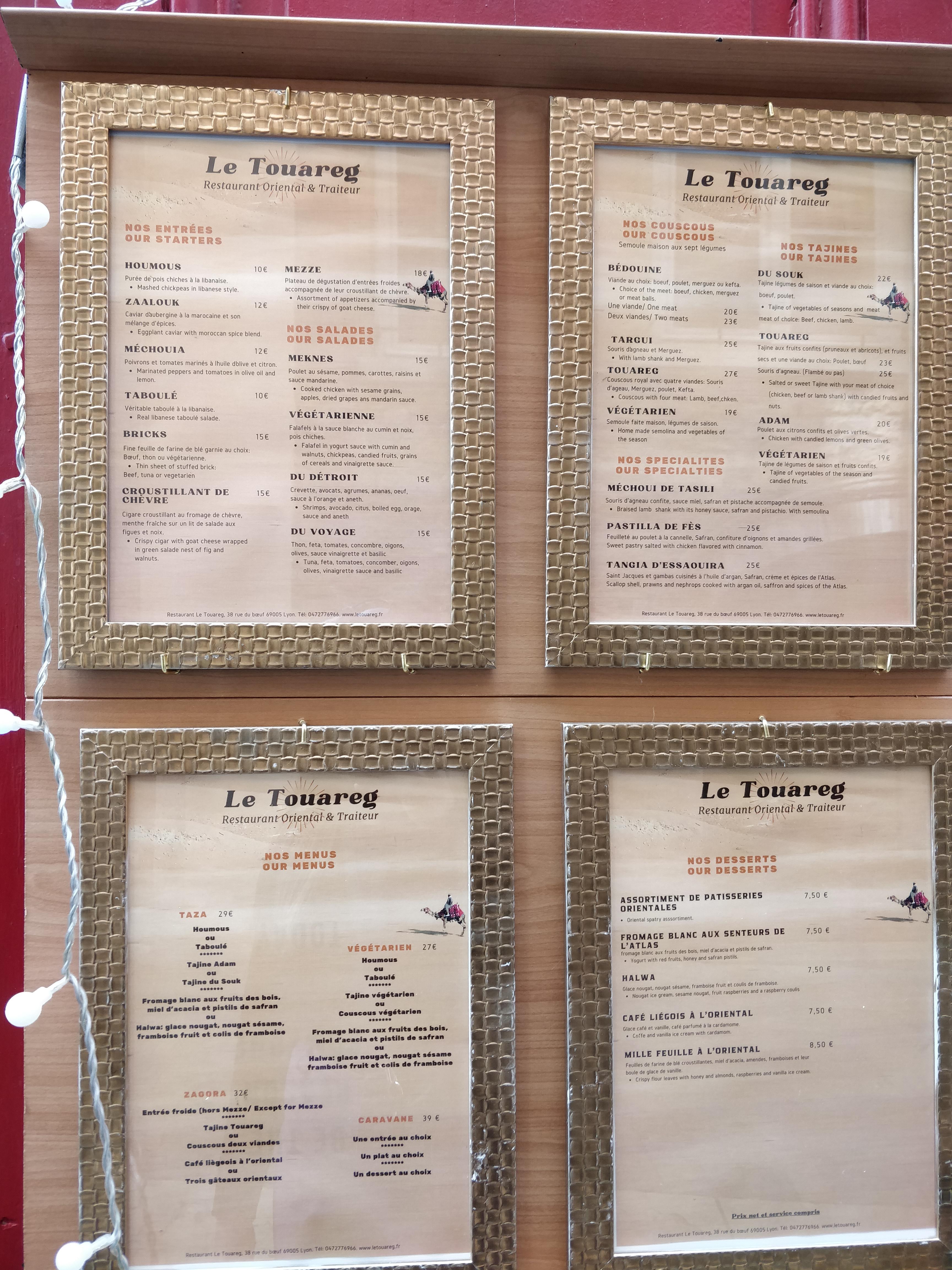 De passage à Lyon pour 2 jours, nous avons découvert le restaurant Le Touareg par hasard et nous en avons été vraiment enchanté, les plats, le service, l'ambiance tout était formidable. J'y retournerai volontier si l'occasion se présente.