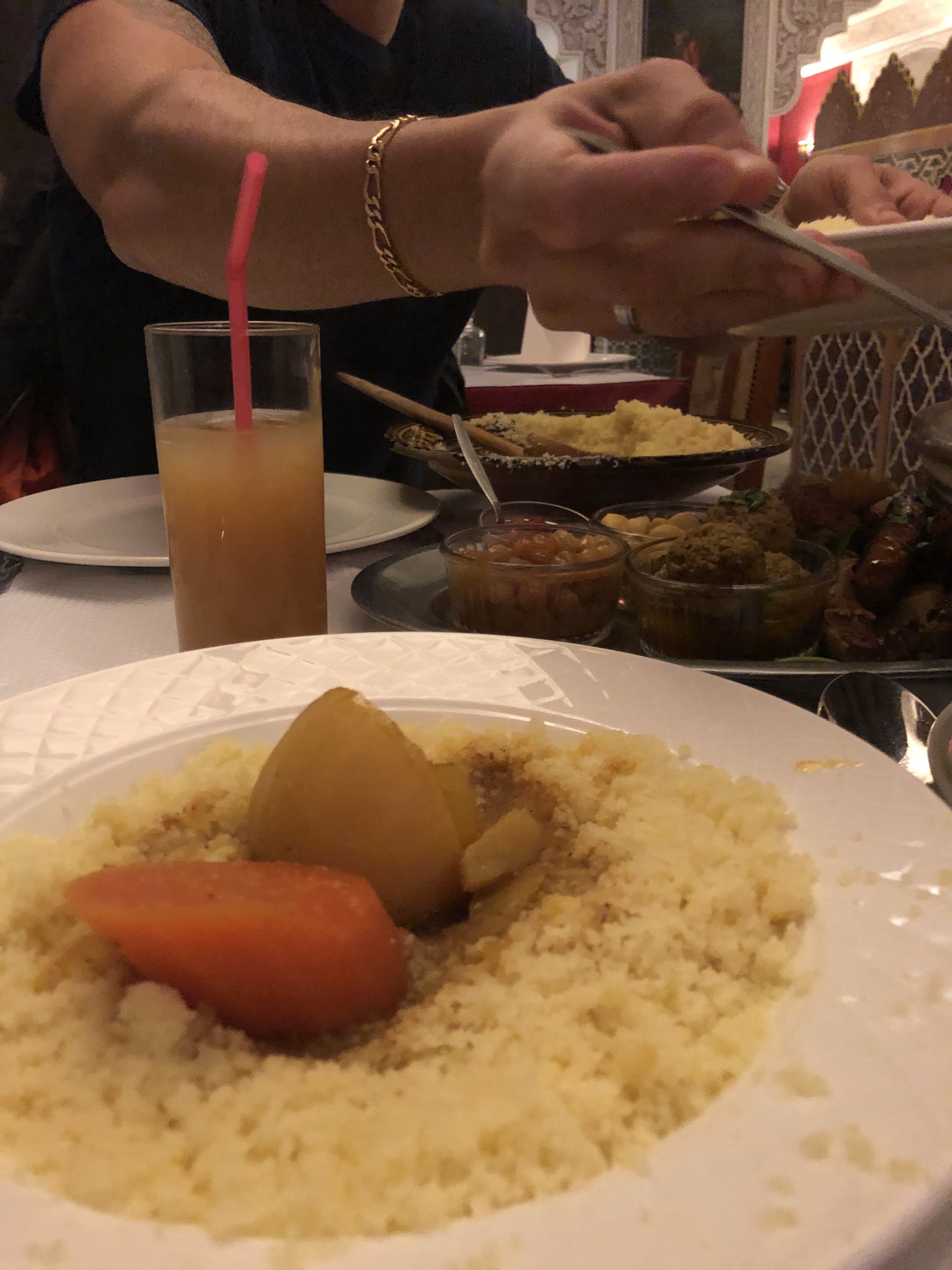 Agréable soirée aux couleurs des milles et une nuit🌟 Repas très copieux. Nous avons pris un couscous pour 2 mais il y en avait pour 4 facile. On nous a même offert le digestif au moment de l'addition. Je recommande ce resto car bon rapport qualité/ prix.