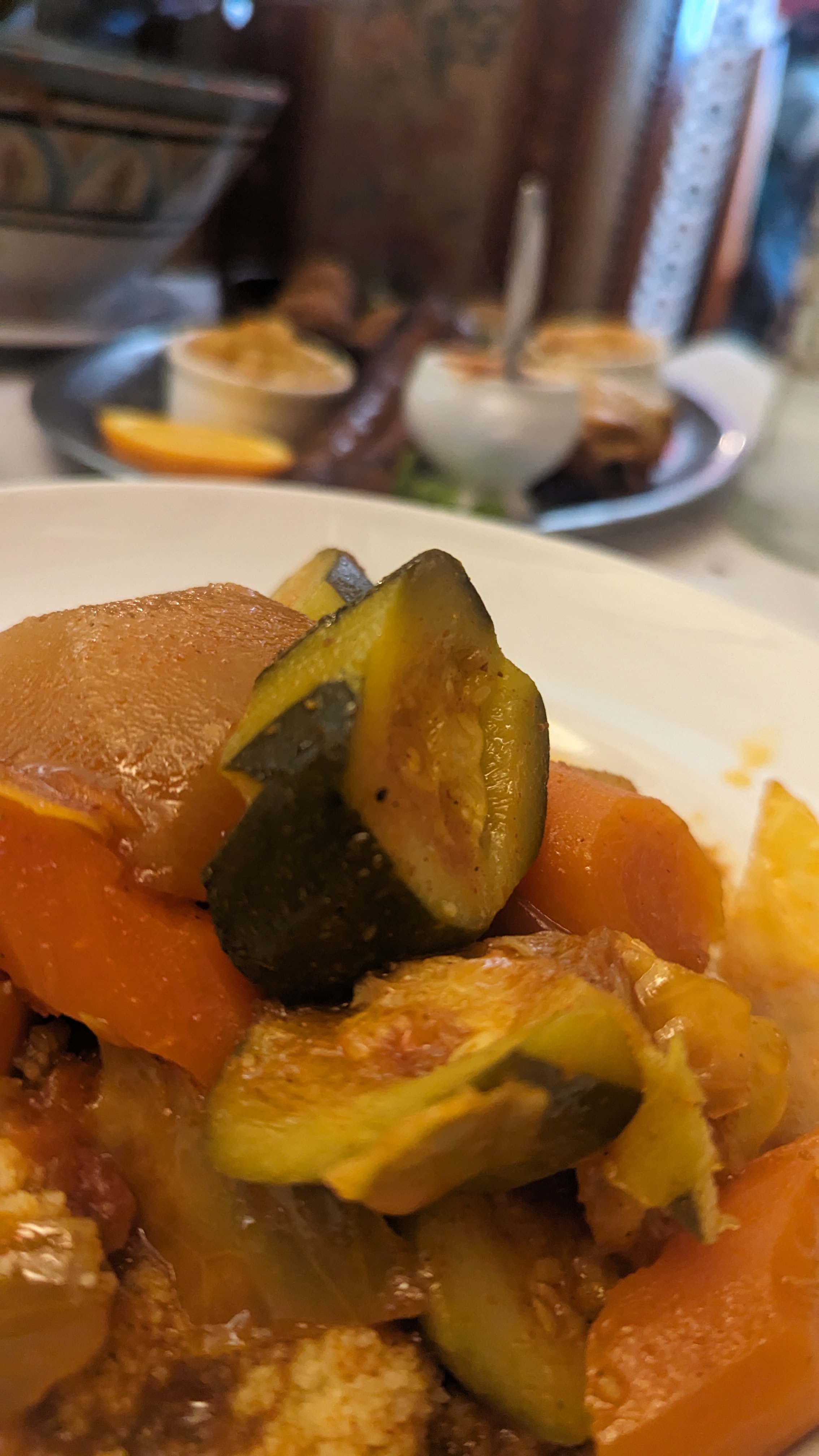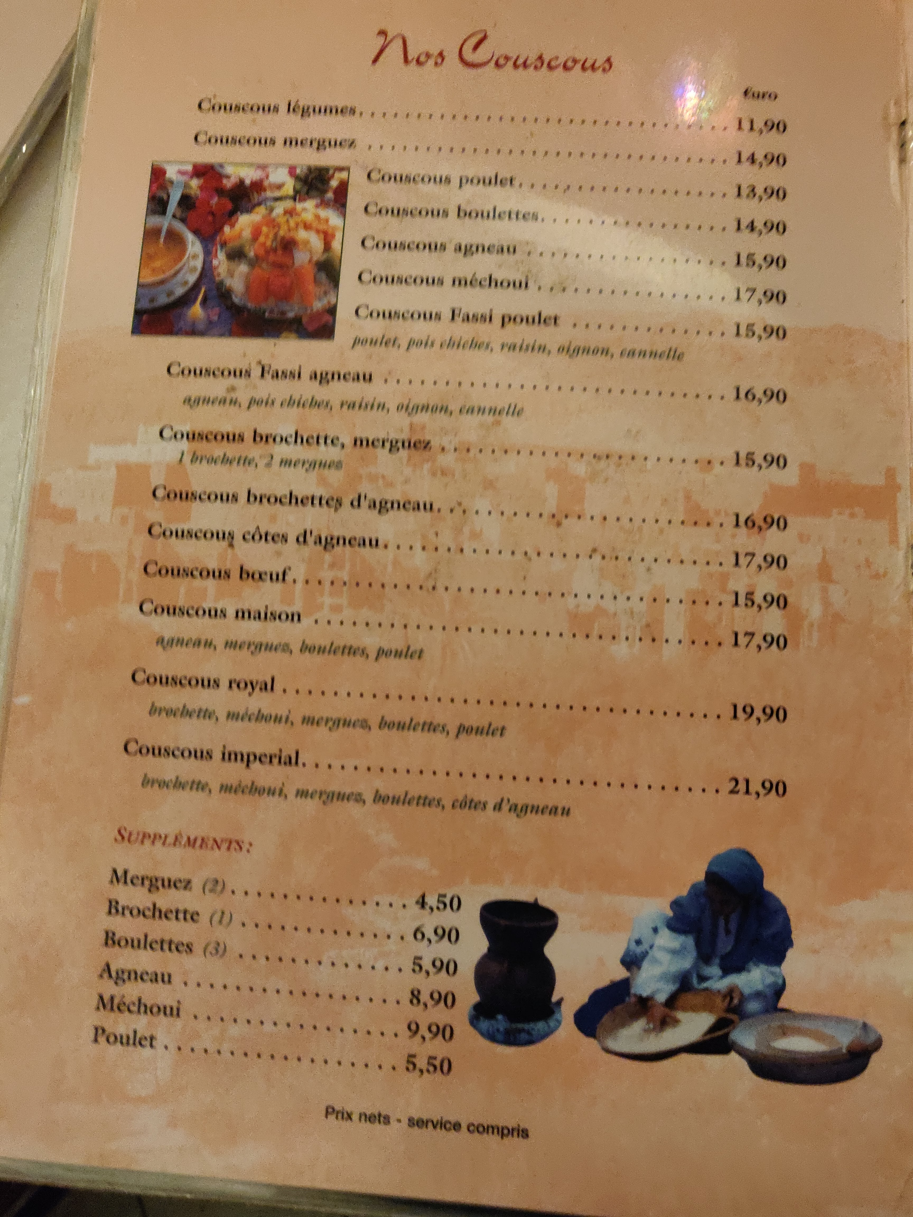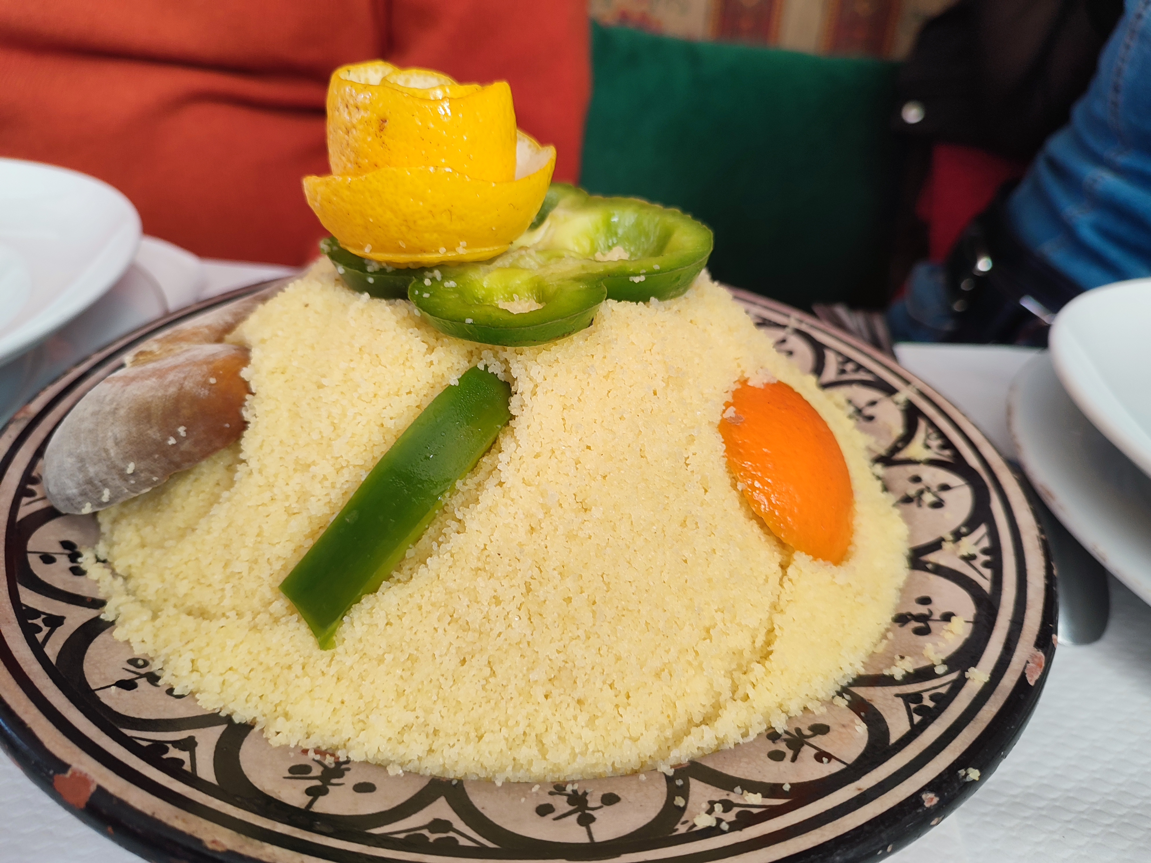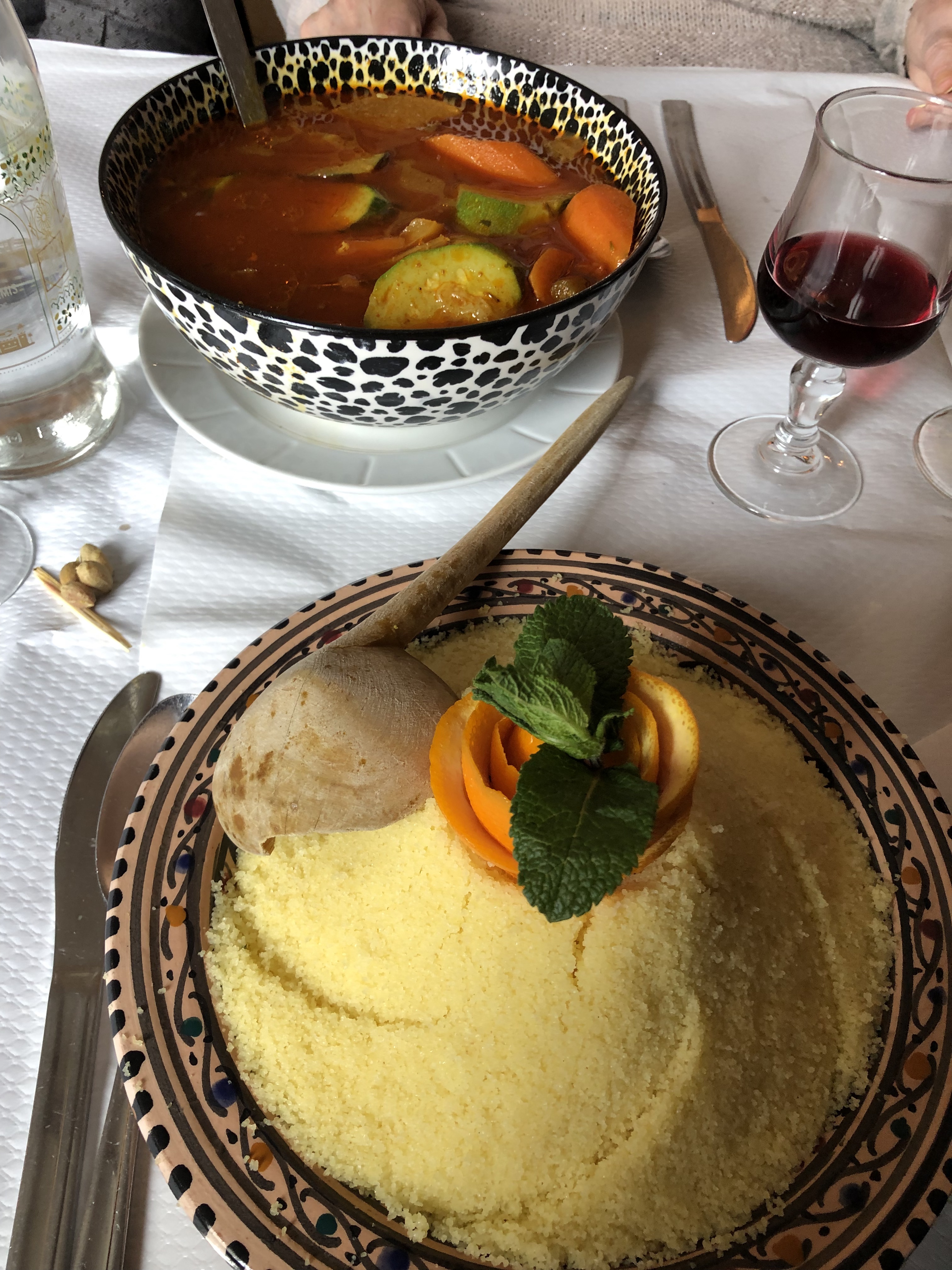 Dommage, décor travaillé, service très présent et compétent, par contre dans l'assiette bof bof bof, présentation très passable, le couscous laisse a désirer, légumes mal cuits, viandes au goût étrange, et pas cuite pour certains morceaux, j'ai connu bien meilleur. Il y a longtemps que je n'avais pas mangé de couscous, j'ai été déçu...