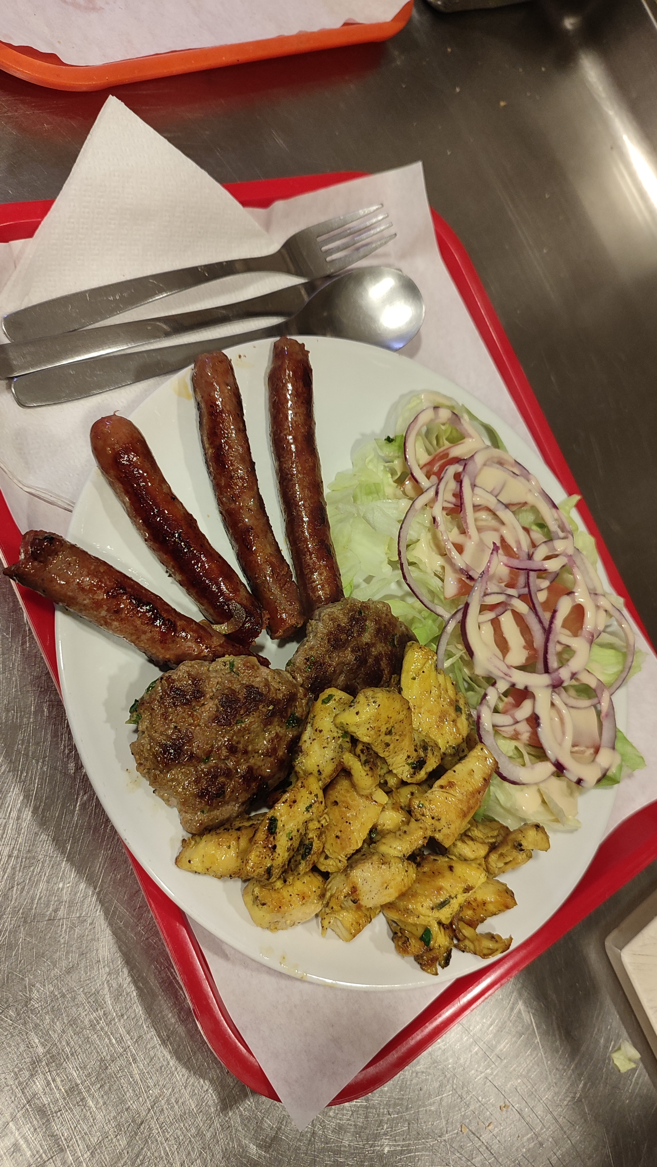 J'ai pris l'assiette mixte kefta merguez oeuf avec frites et salade. Franchement trop bon. Par contre arrivée à la maison, j'ai vu qu' ils ont oublié l'oeuf. Prévoir de l'attente car ils sont victimes de leur succès. Patron et staff très sympas. Continuez comme ça