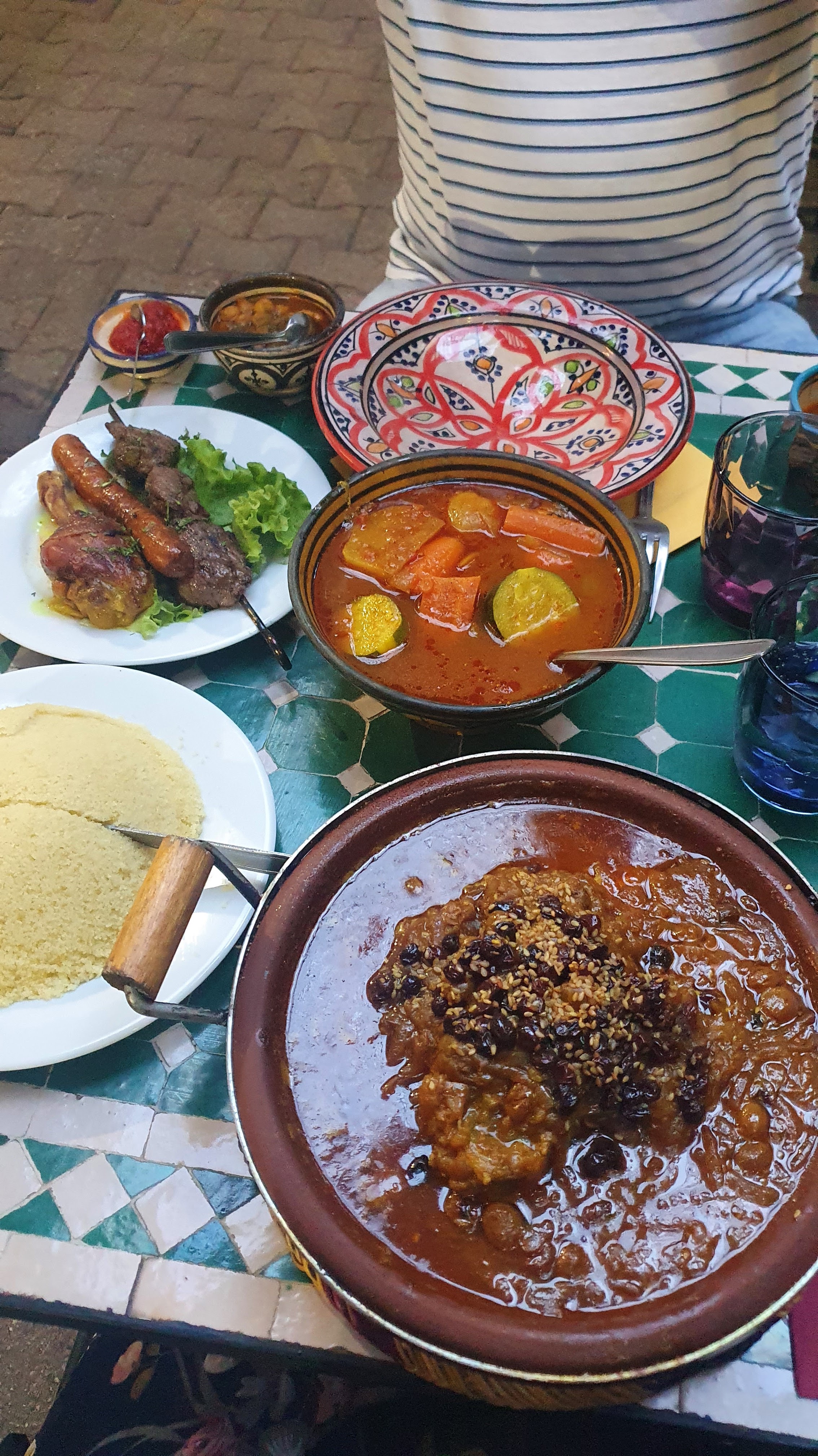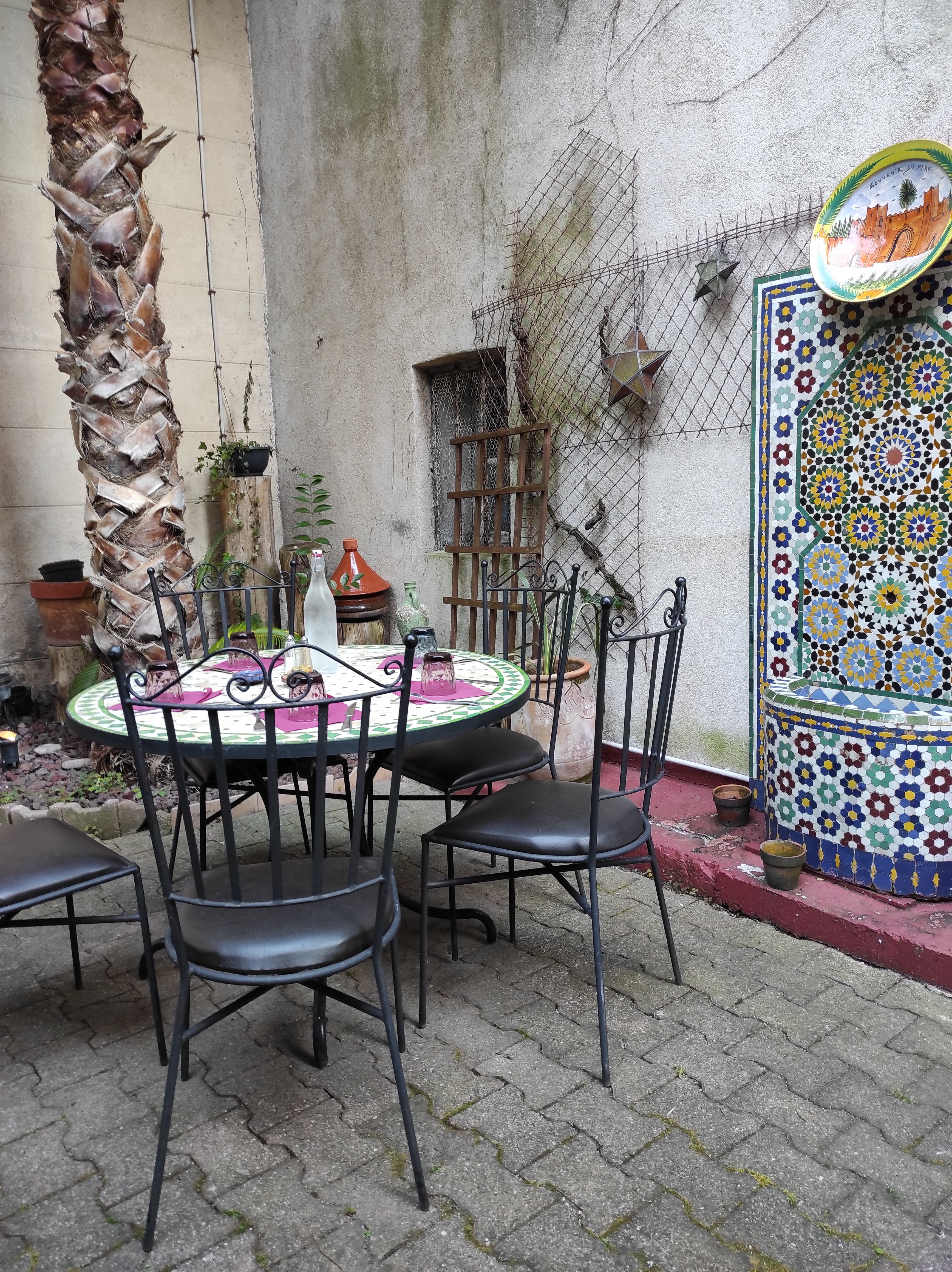 Terrasse ombragée l'été, nombreux plats faits minutes,pour les tajines aller sur leur site lors de la réservation de la table passer commande sinon un peu d'attente,viandes et légumes excellents,le tout assiettes ,plats marocain,manque seulement la musique marocaine.le chef vient prendre des nouvelles de sa cuisine