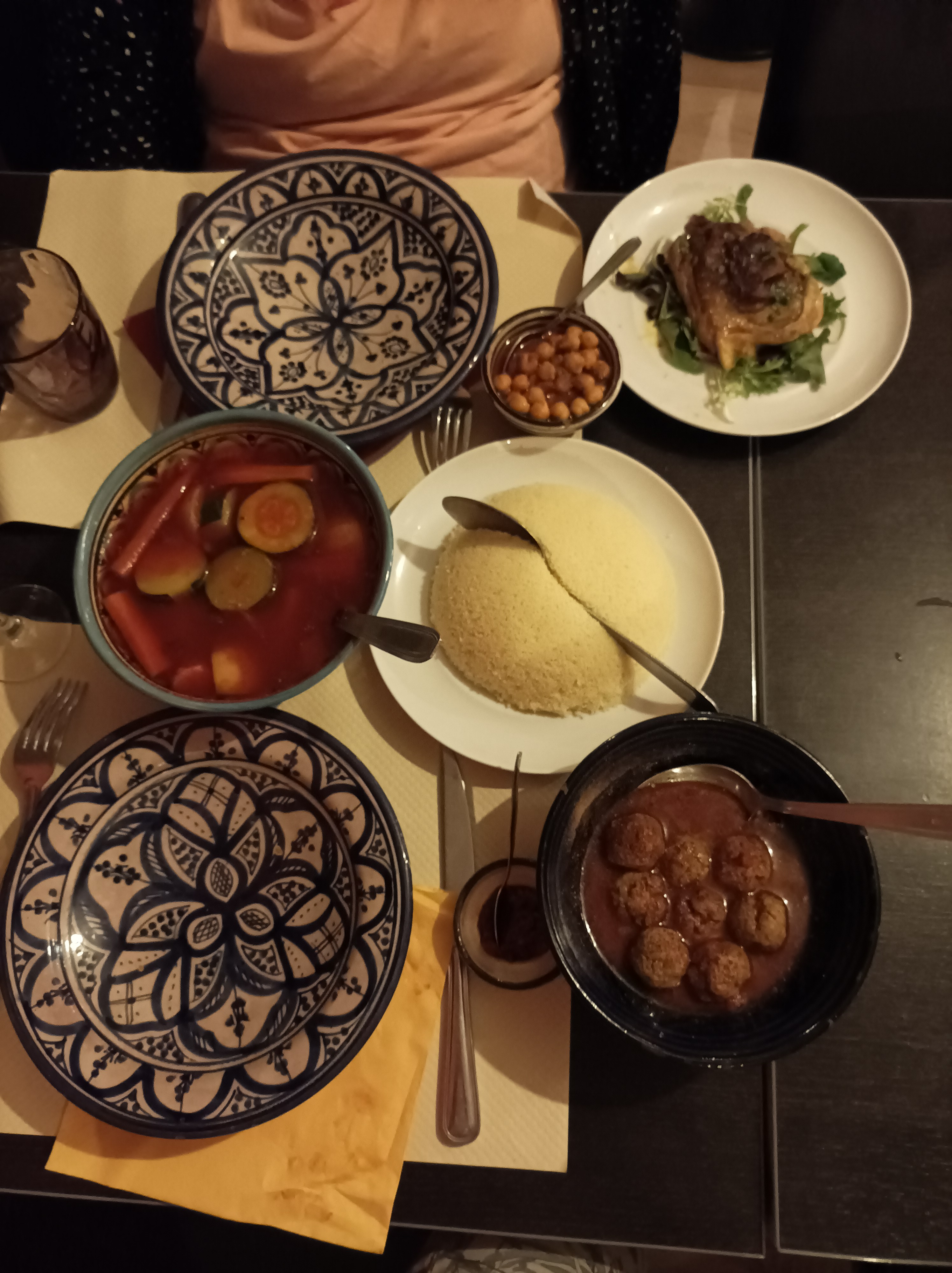 Couscous correct avec semoule goûteuse, manque de légumes et de pois chiches Dessert pas terrible, les pâtisseries orientales ressemblent à des petits morceaux coupés et prix pour la quantité onéreux.