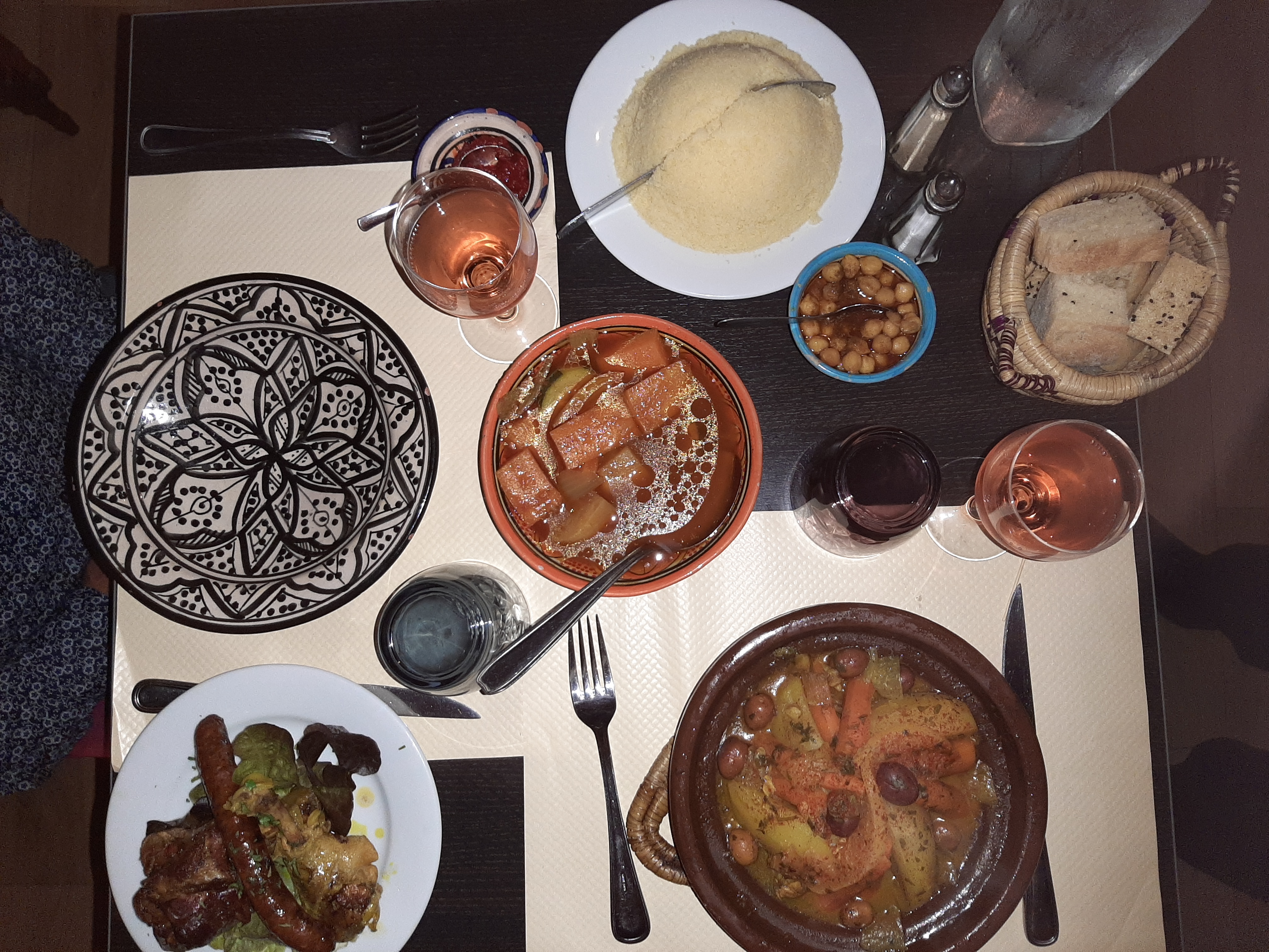 Ne veux pas en une réservation pour 2 personnes. On ne savait pas que en réservant il fallait réserver les tajine. Donc obligé de prendre un couscous .car sur les 4 sorte de brochette ,juste mouton disponible. Lorsqu'on commande une carafe de rosé il y a plus de rosé. Légumes très bien cuisiné. Prix 16 € pour un morceau de mouton des légumes, et de la semoule ultra fine.