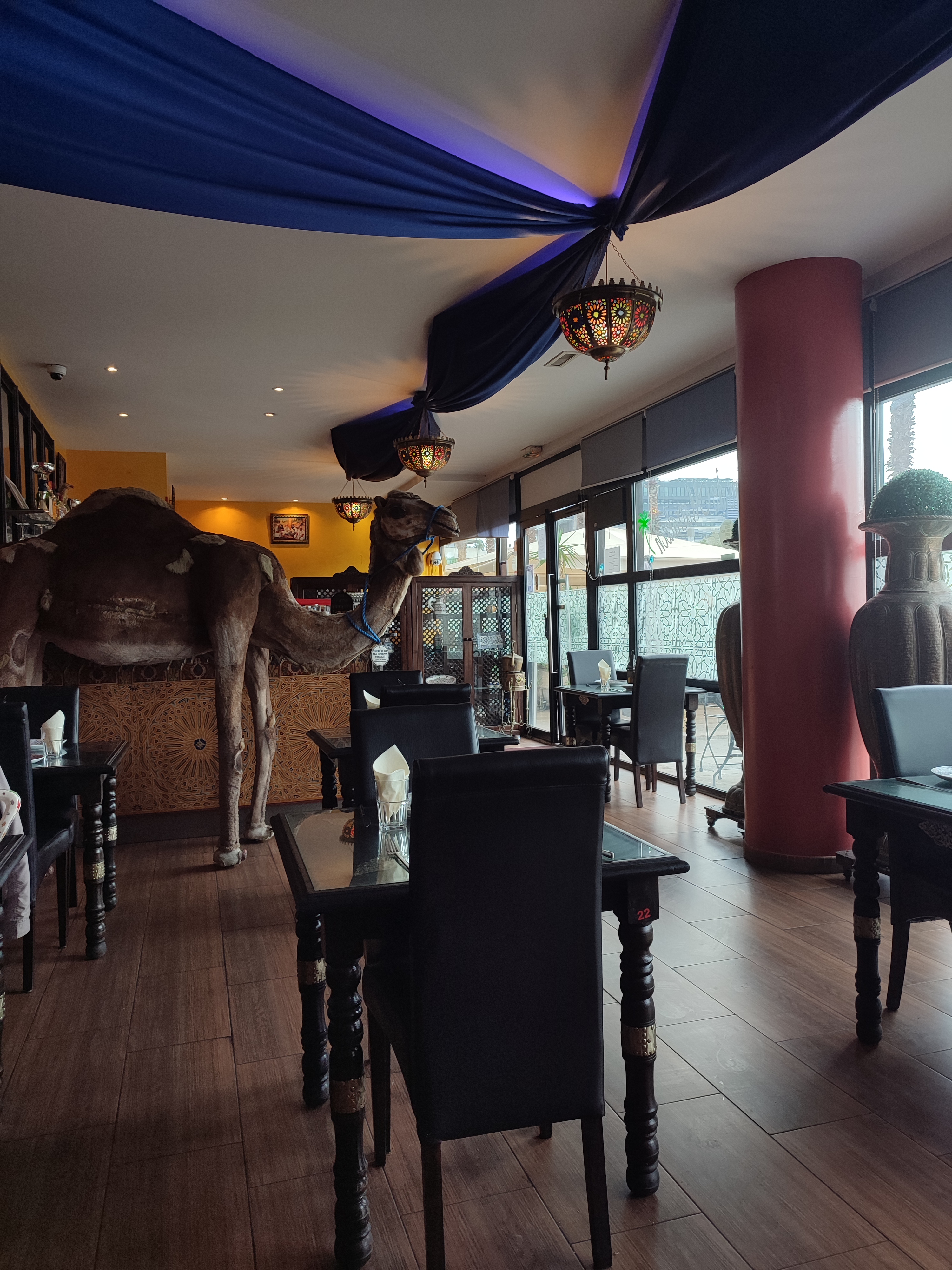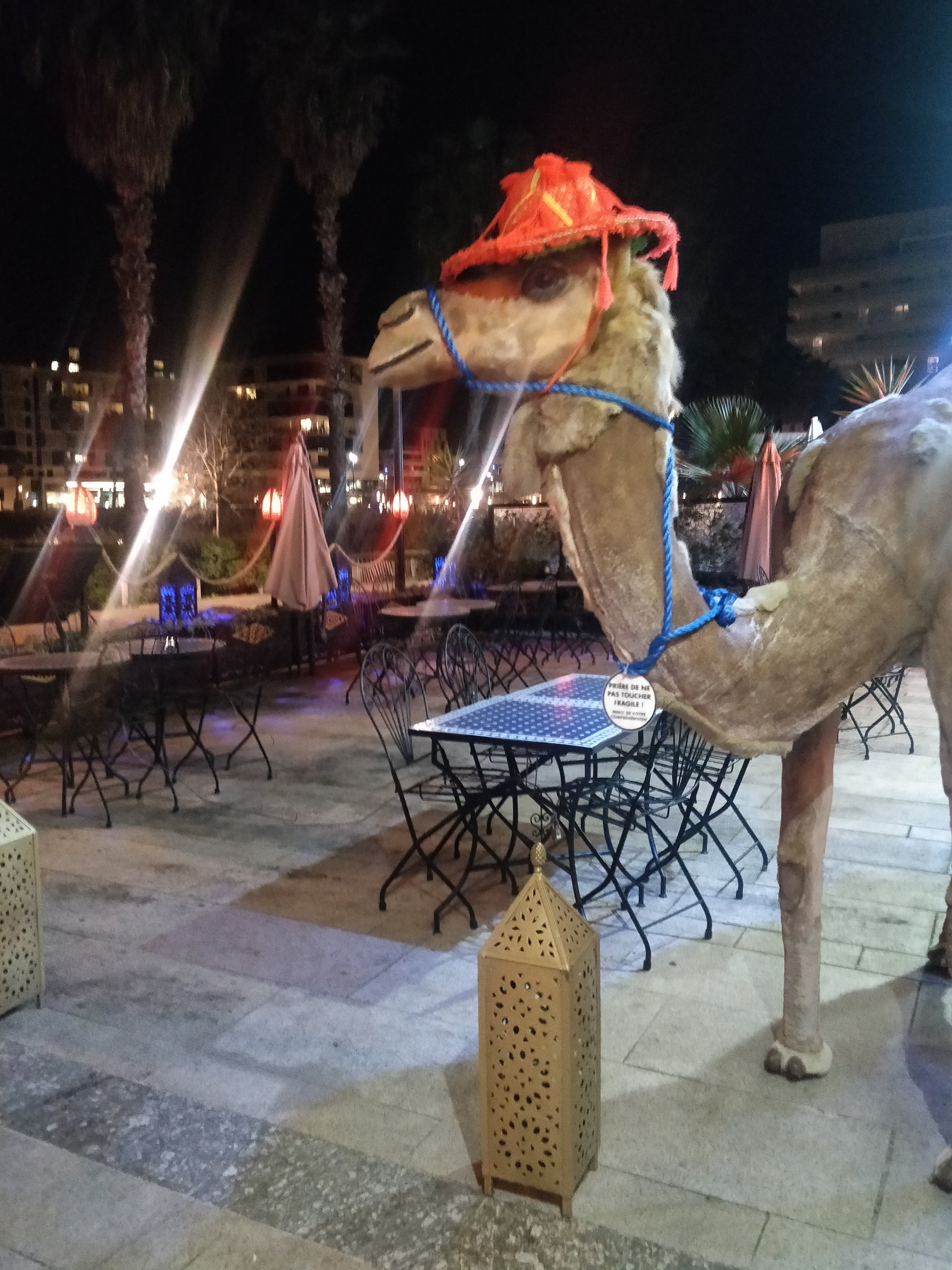 une fois passé le dromadaire en plastique grandeur nature sur la terrasse à l'entrée, la déco à l'intérieur n'a rien d'exceptionnel. Le personnel est plutôt accueillant, mais ça ne compense pas tout ce qui suit : Nous commandons une entrée qui arrive relativement rapidement. Il s'agit de poivrons au four tout à fait ordinaire, accompagné sur le coté d'une feuille de laitue et de 2 rondelles de carottes posés là, le tout sans sauce. Ensuite nous attendons 1h pour notre plat (plusieurs autres clients autour commencent à râler, ce qui semble déclencher l'arrivée des plats.. ) : un tajine de légume et un couscous légume, les 2 ayant exactement le même goût, peu raffinés. a fuir absolument