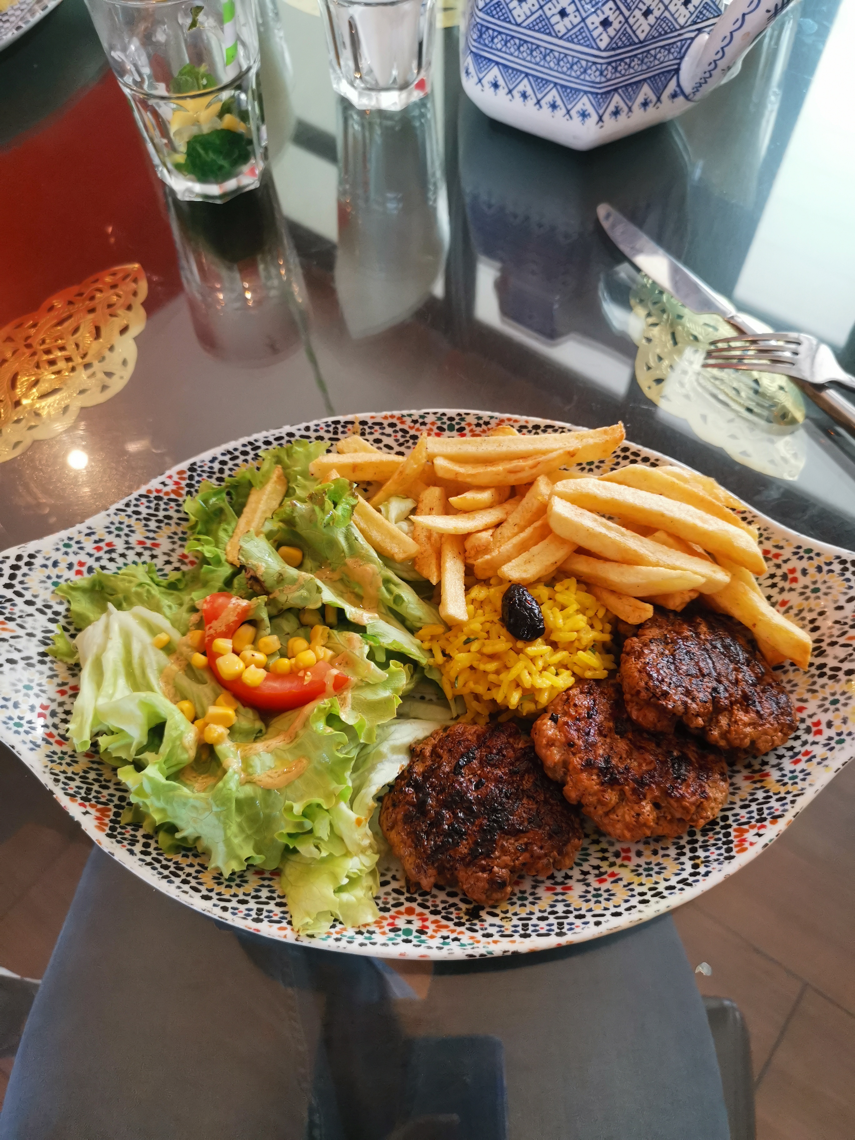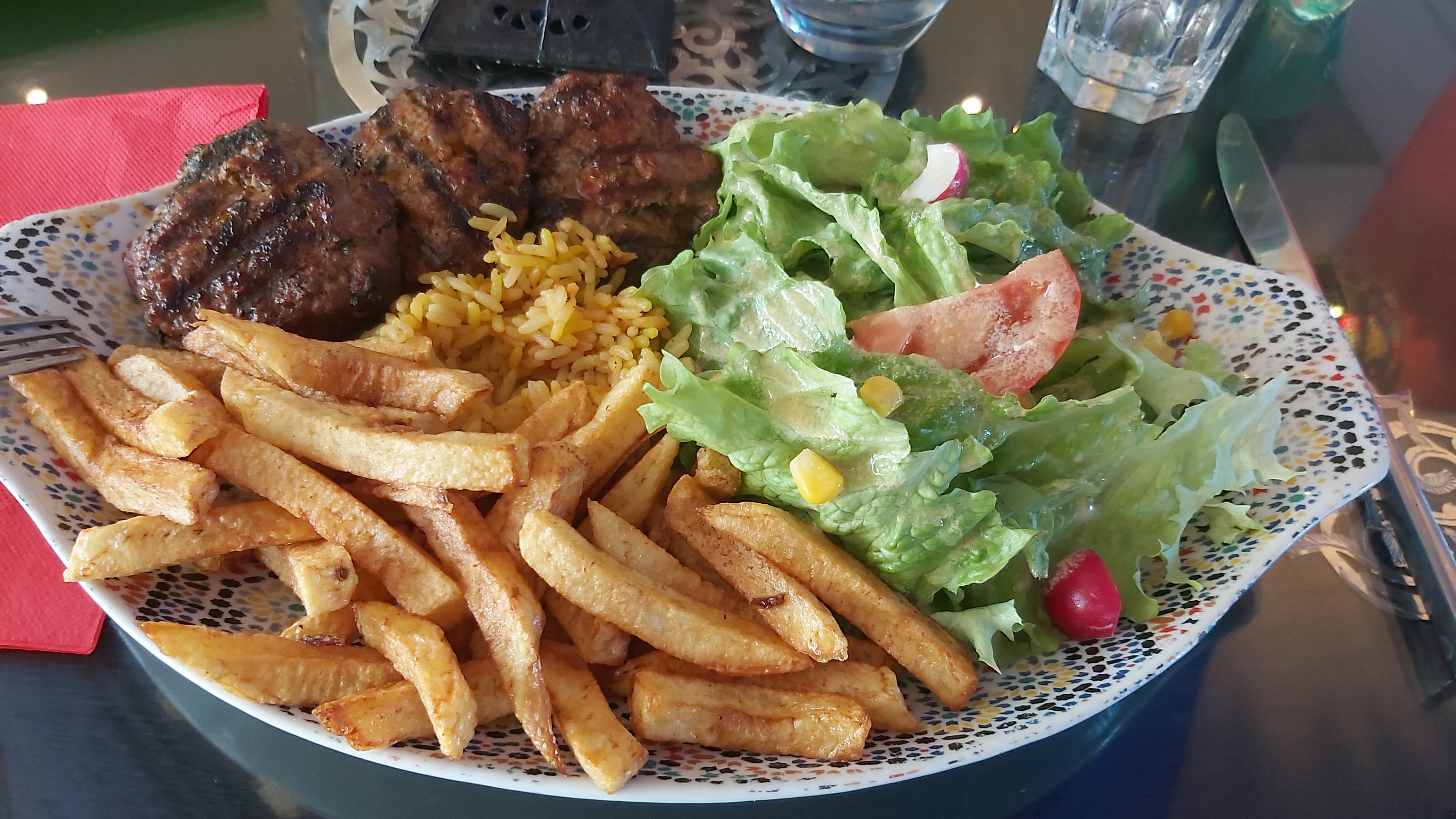 Table à moitié mise. Assiette ébréchée. Service de midi très long. kefta sèche comme une semelle.. bof dommage personnel aimable cela dit.