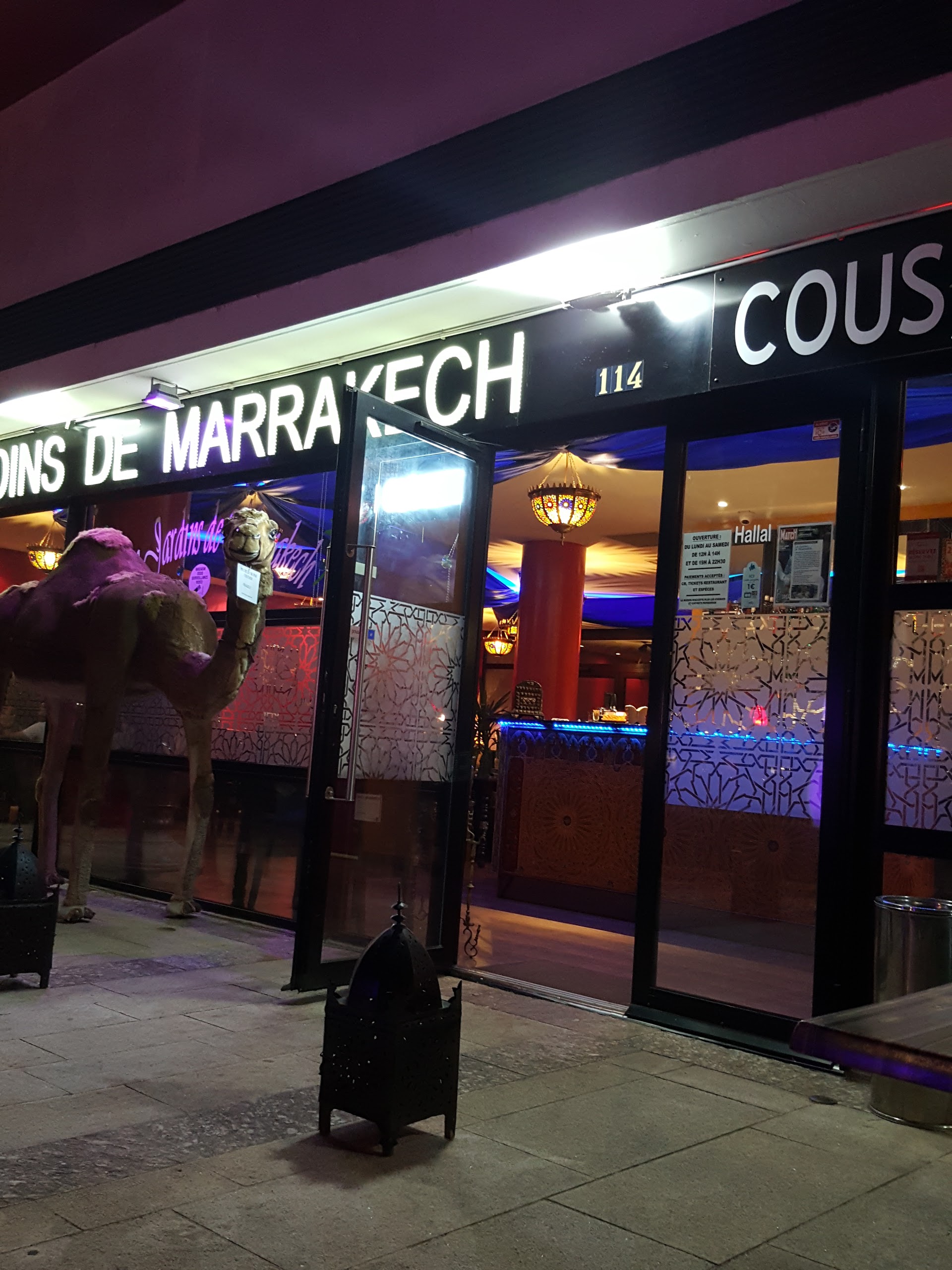 Resto à éviter accueil 0 un seul serveur les plats de couscous froid et pois chiches dure trop cher pour rien et j ai pris un plat poulet ognon et raisin sec et un bou de slata machewiya avec deux trois salade et un petit morceau de tomate et avec dessert 2 veille boule de glace 24€ et en plus il y a de l alcool je l ai vu quand j ai payé je l aurai vu avant wallah j aurais pas mangé soit disant ( halal) allez même pas là-bas un conseil