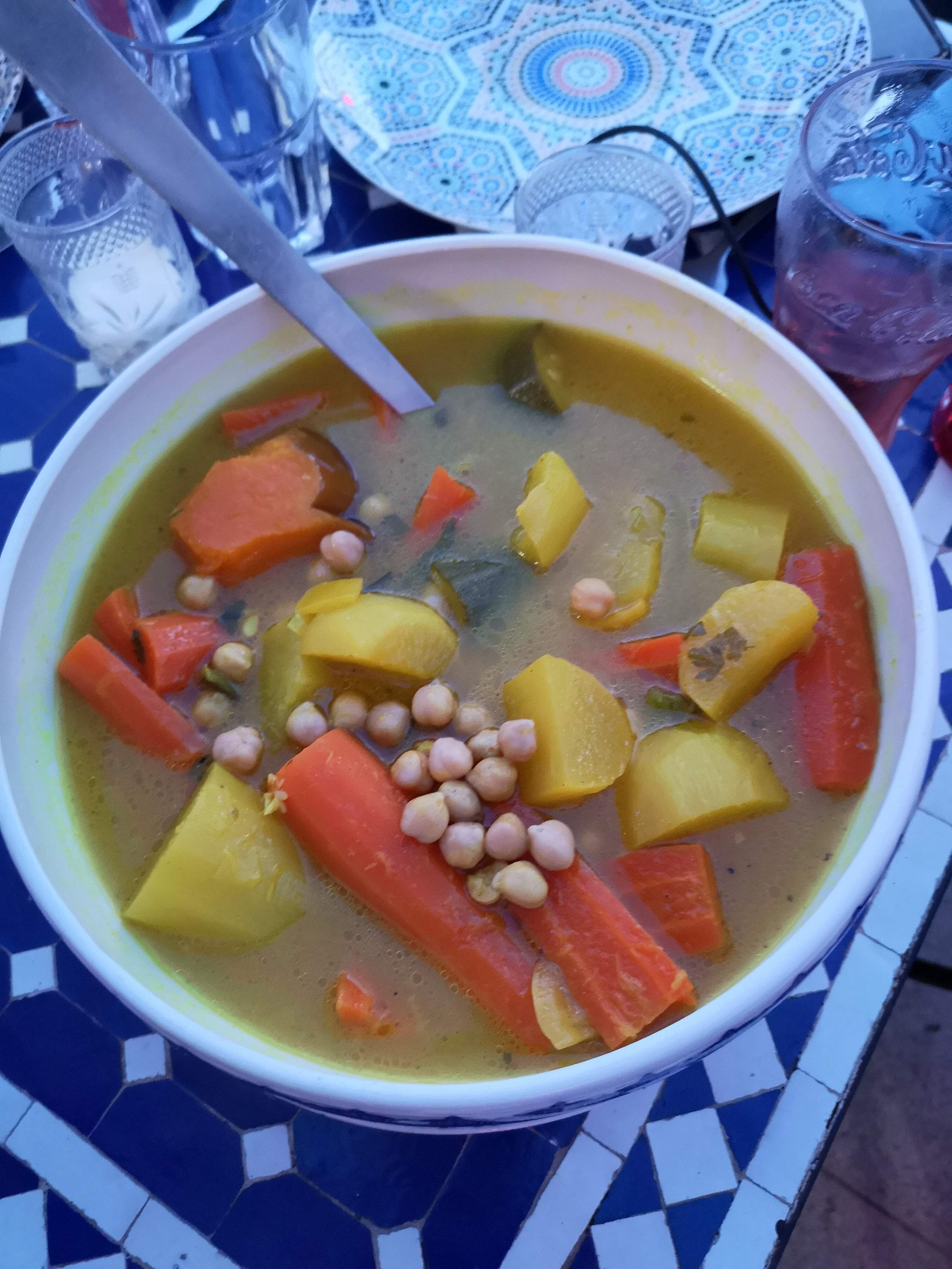 Restaurant simplement à fuir. 55 min d’attente pour les plats, et 1h pour les boissons (que nous avons dû réclamer) avec en prime une erreur dans les boissons. Aucune organisation au niveau du service. La serveuse est venue nous voir 1 fois avec des plats qui n’étaient pas les nôtres, 1 fois pour savoir si c’était nous qui avions commandé tel plat (3 autres tables ont eu cette questions également), et finalement notre plat a été baladé à travers toute la terrasse avant de finir sur notre table ENFIN! Grand choix de plats sur la carte, sauf qu’il en est tout autre en réalité car beaucoup de produits sont manquants. Nous n’en sommes informés que très tard, après la commande, lors de l’attente. Le couscous est de bonne proportion, en revanche il n’a aucun goût. Les tajines sont ridiculement petits, 4 olives, une toute petite cuisse de poulet, une demi pomme de terre, et un tout petit peu de sauce. Le pain était rassis. Ce qui était meilleur dans notre repas c’était les boissons. Les 2 tables qui étaient à côté de nous de plaignaient également, ce qui prouve que c’est un problème assez répétitif.