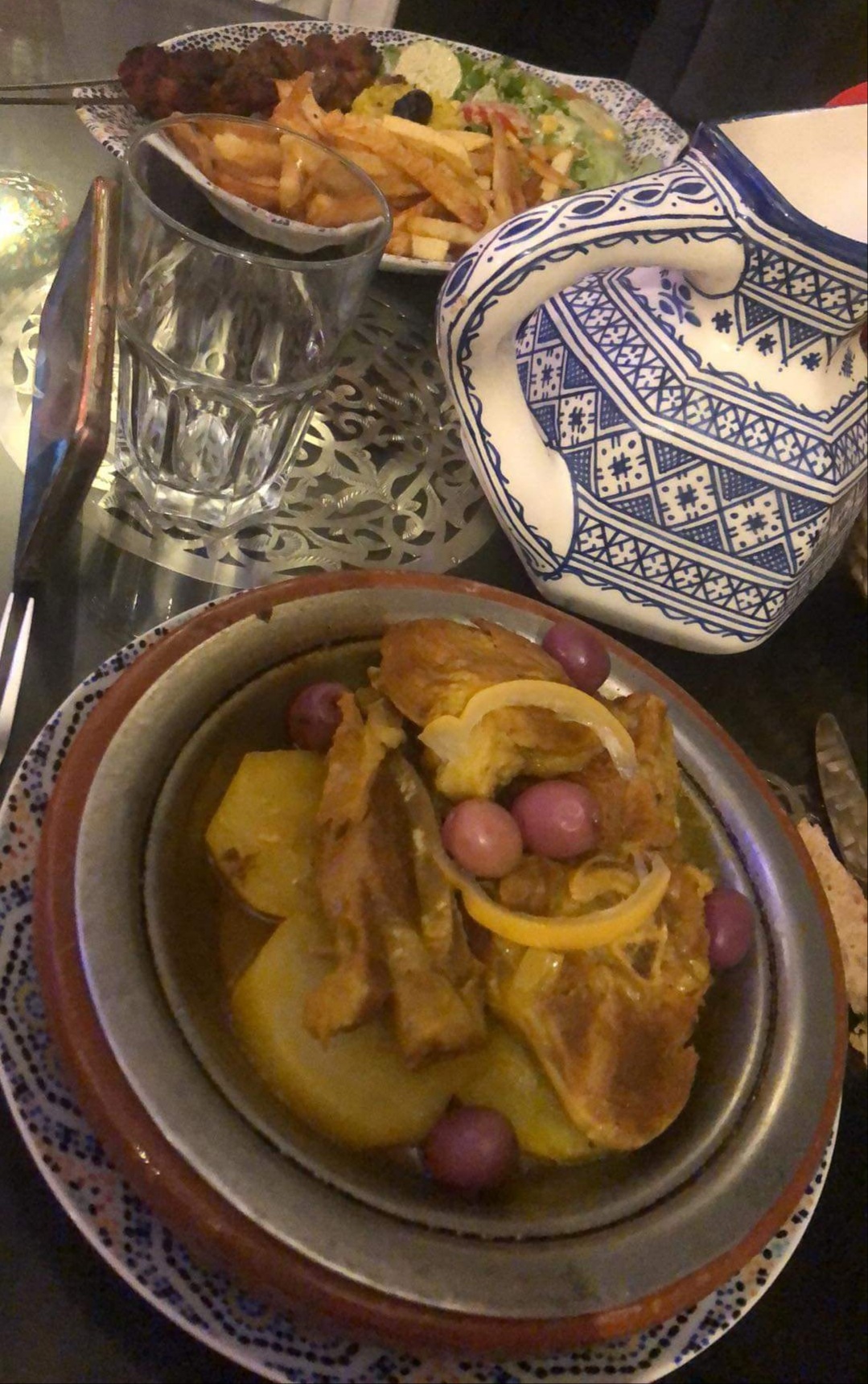 Tajine de poulet aux olives : 4 olives , 1 morceau de poulet , 1/2 pommes de terres pas cuite en rondelle dans 500ml de sauce enfin de l’eau coloré.Vaisselles pas dans un super état. Quand on signal que le plat est peu rempli pour le prix la réponse est : c’est une moyenne , c’est pour la dégustation. Non recommandé.