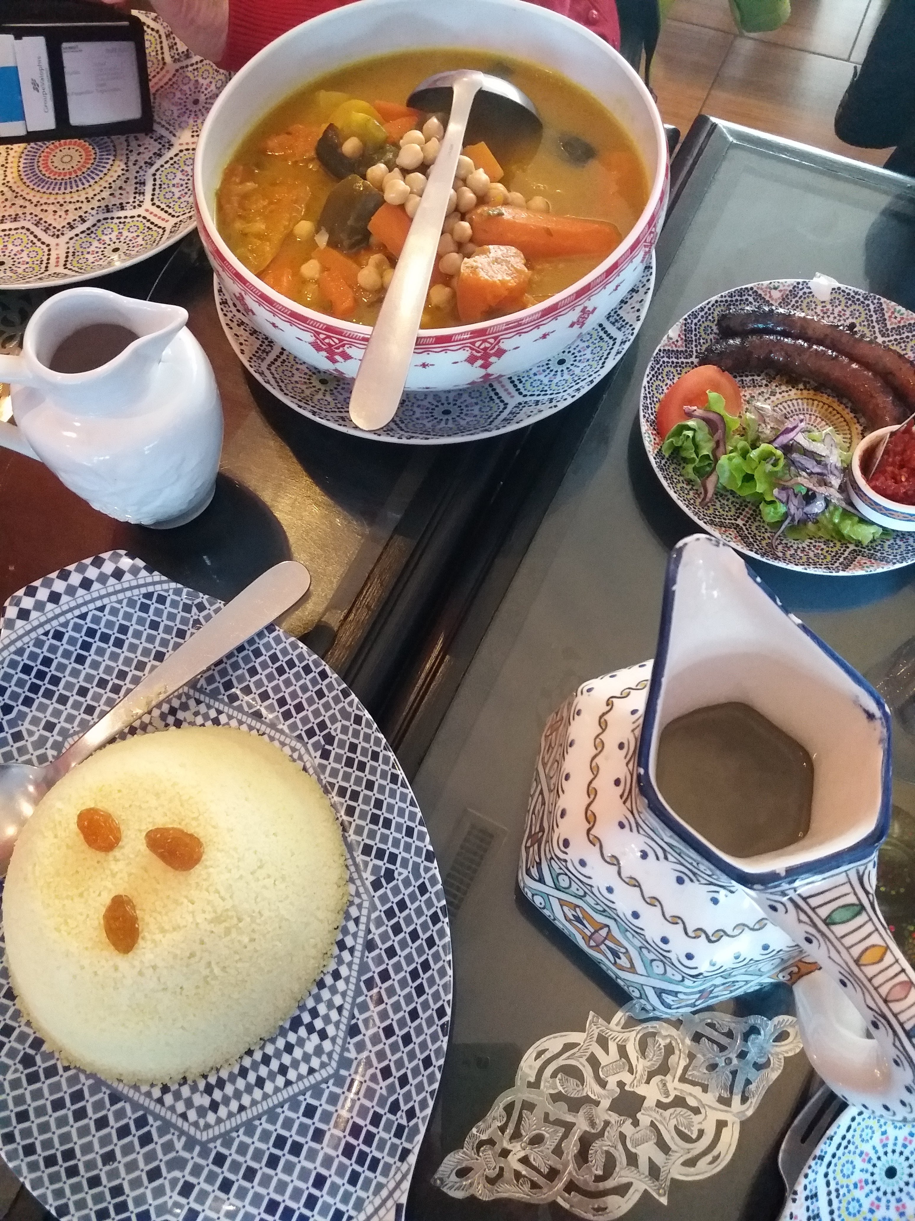 Joli cadre mais le couscous... Viande desséchée et fade, dont on dirait qu'elle a cuit plusieurs fois au micro ondes, légumes sans goût, pas d'oignons ni de raisins secs et même le bouillon est light et fade.... Quant aux quantités ! Ce n'est pas là que vous prendrez du poids! Le pire couscous de ma vie ! Et j'ai vécu 10 ans au Maroc !