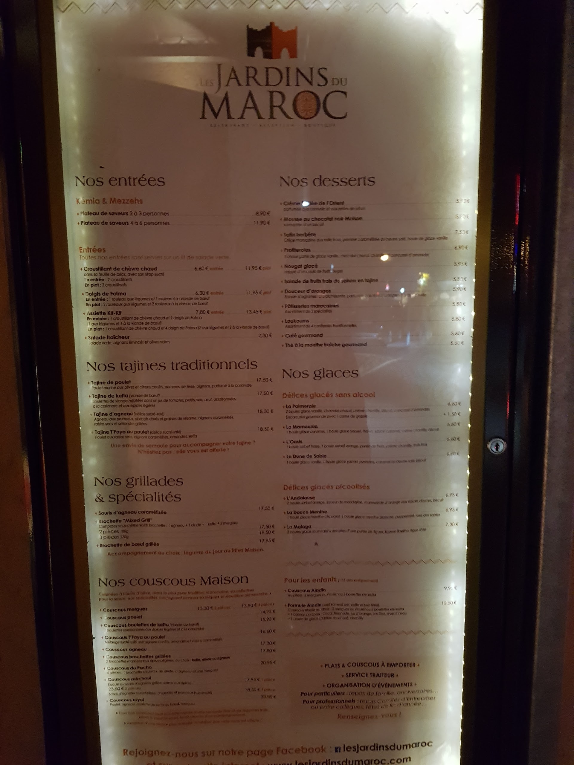 Décevant C'était un bonheur à l'idée d'y partager un couscous méchoui et un tajine agneau, depuis les 2-3 ans que nous avions découvert avec ma femme les Jardins du Maroc. La bonne adresse que nous étions fiers de transmettre à nos amis. Cadre somptueux, mets délicats, assiettes bien remplies, personnel attentionné. Hélas ce n'est plus le cas depuis quelques mois (sauf pour le personnel): portions chiches (comme les pois du même nom qui ont disparu) qui laissent presque sur sa faim, alors qu'auparavant elles étaient si copieuses que l'on repartait avec ce que l'on n'avait pas pu avaler...et que celà nous faisait un repas de plus à la maison. Maintenant, c'est tout juste si on mange à sa faim, la qualité a baissé, le prix explosé: 70 € pour un couscous, un tajine et un verre de vin, dont 8 € pour un supplément méchoui... se limitant à un os. Dommage qu'une bonne adresse disparaisse. A tirer trop sur la ficelle, les clients fidèles se lassent.