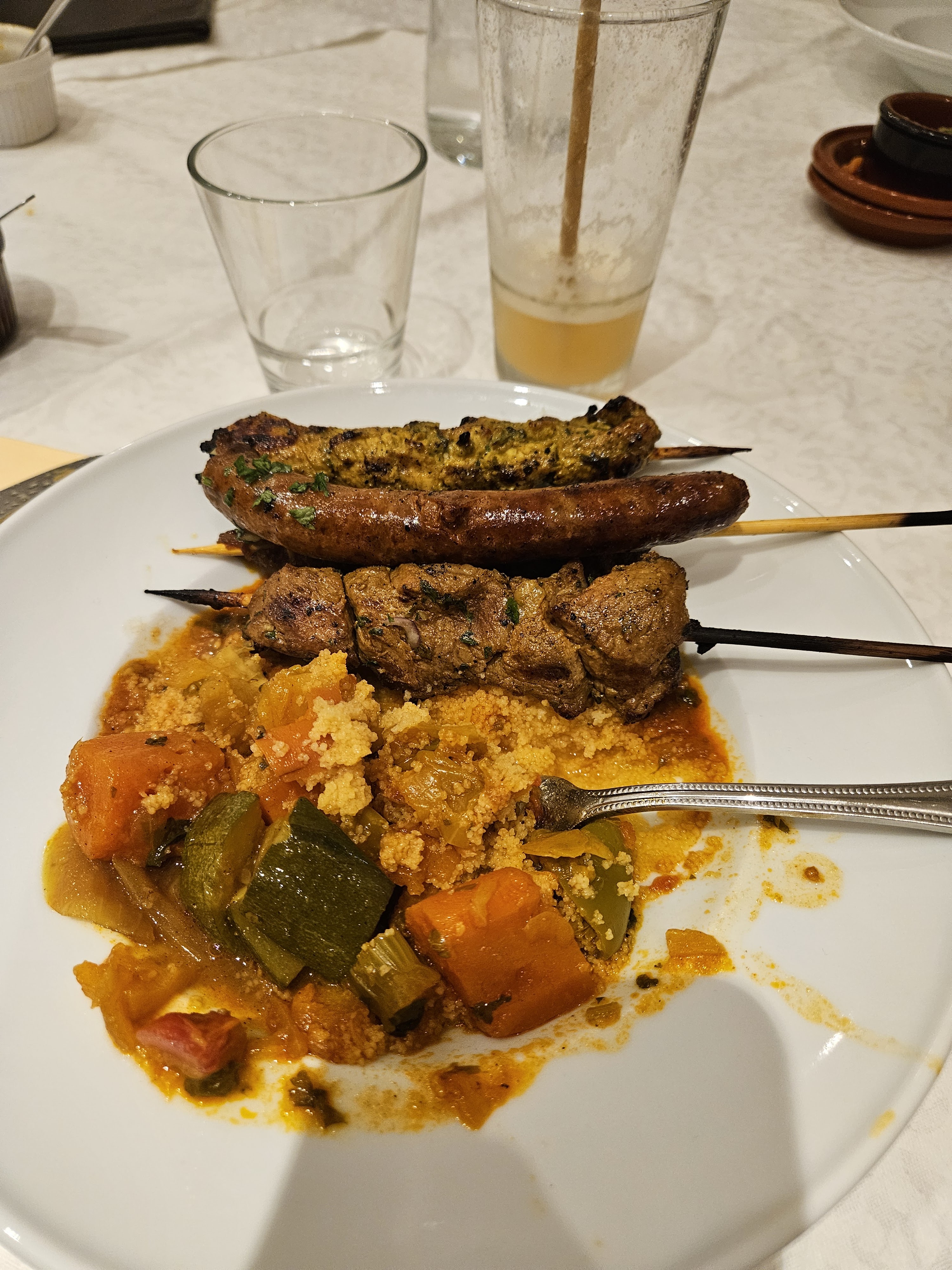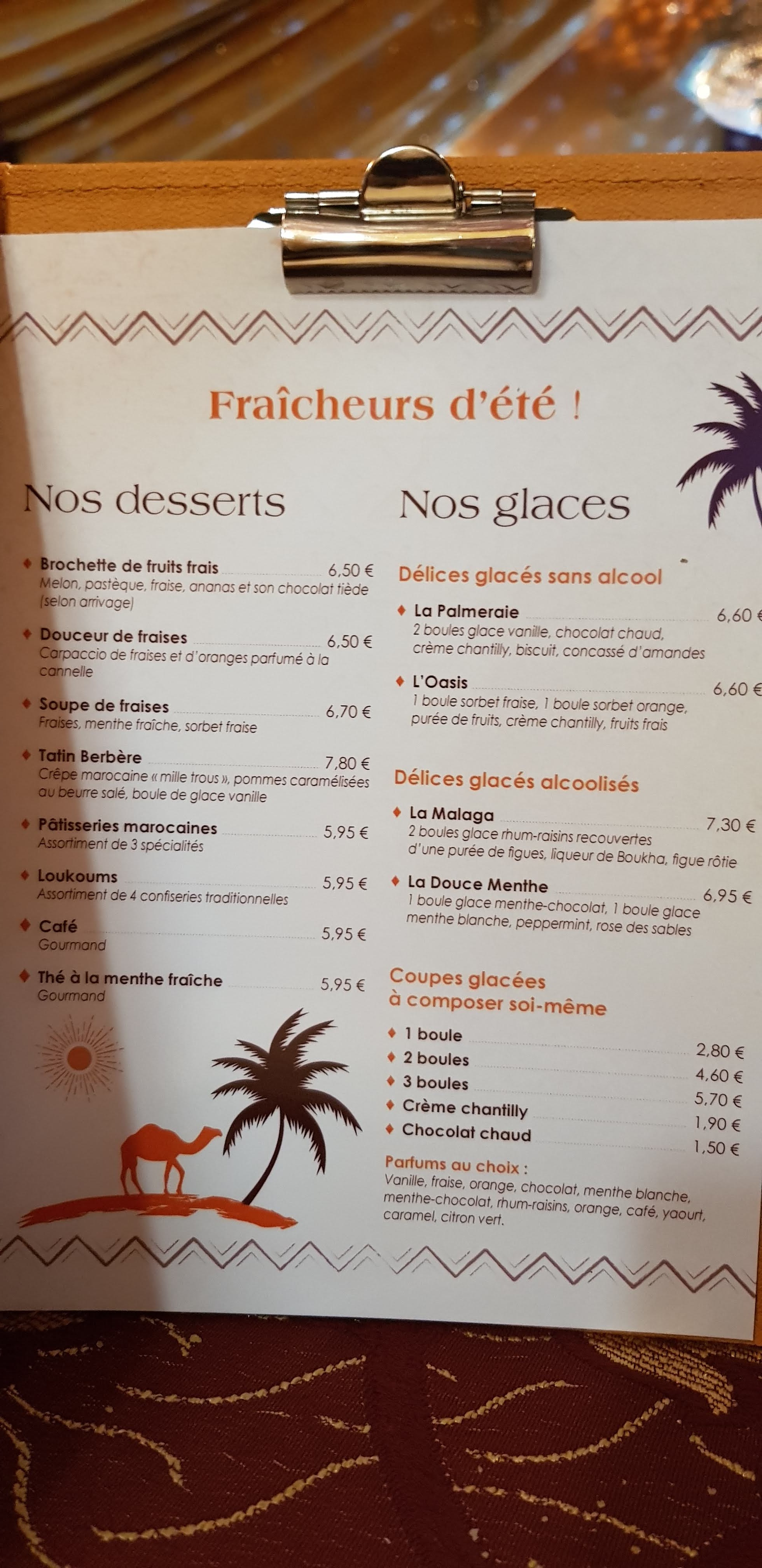 Couscous royal délicieux et très copieux. Le cadre est une imitation d'un restaurant marocain avec musique traditionnelle (personnellement j'aime pas trop). Service rapide et cuisine gourmande (ça j'aime beaucoup). Prix de 27 euros pour un bon couscous royal (4 viandes) tout à fait correct. Dessert entre 7 et 8 euros un peu cher, mais très bon.