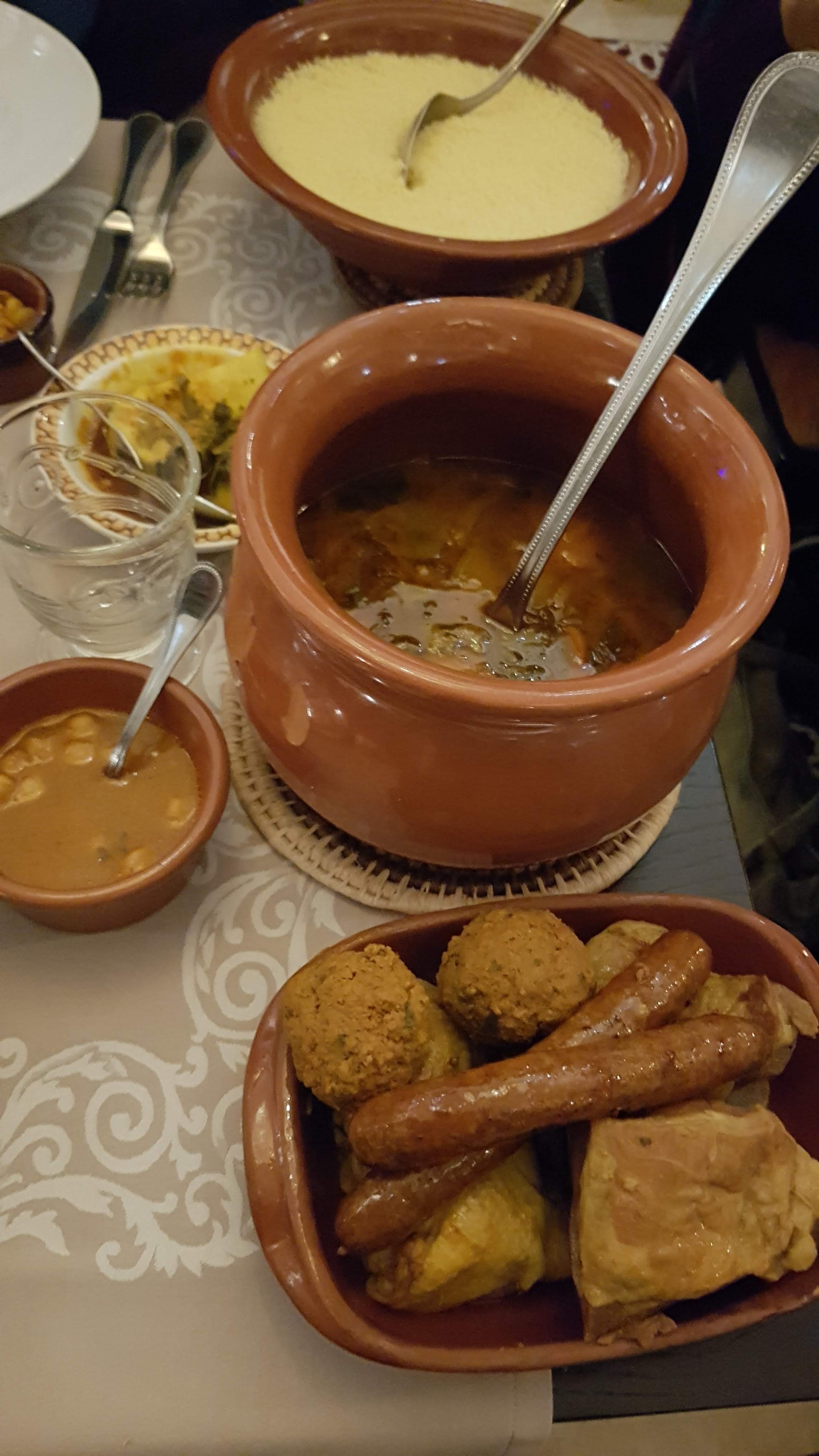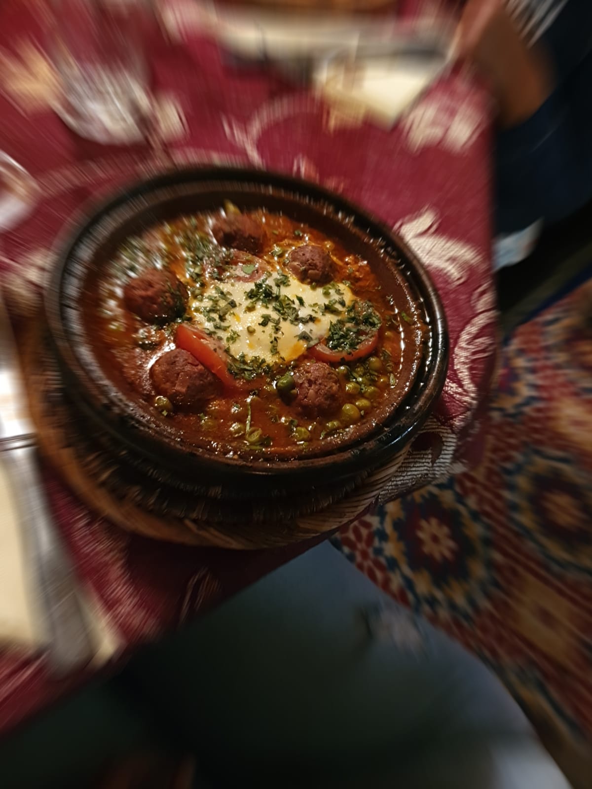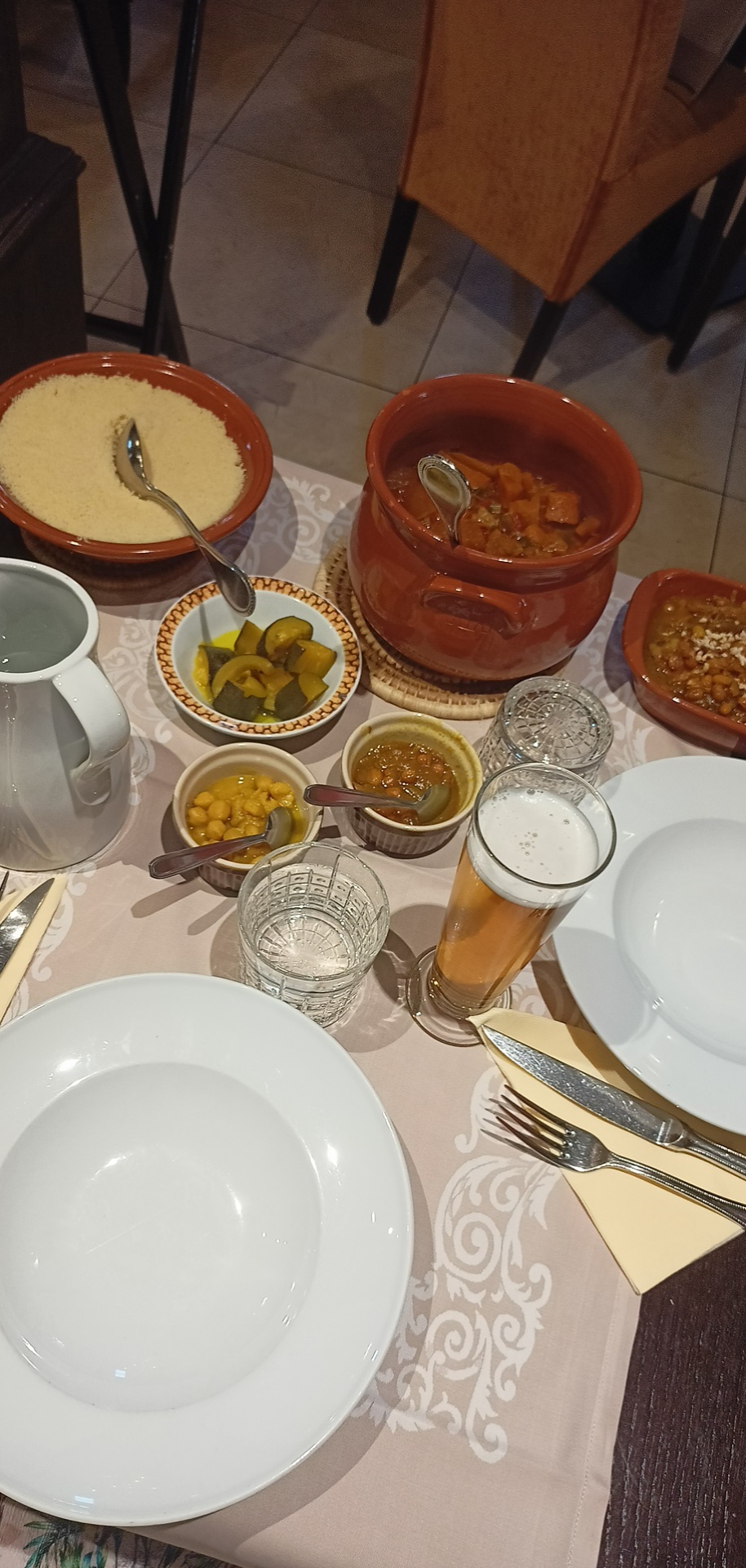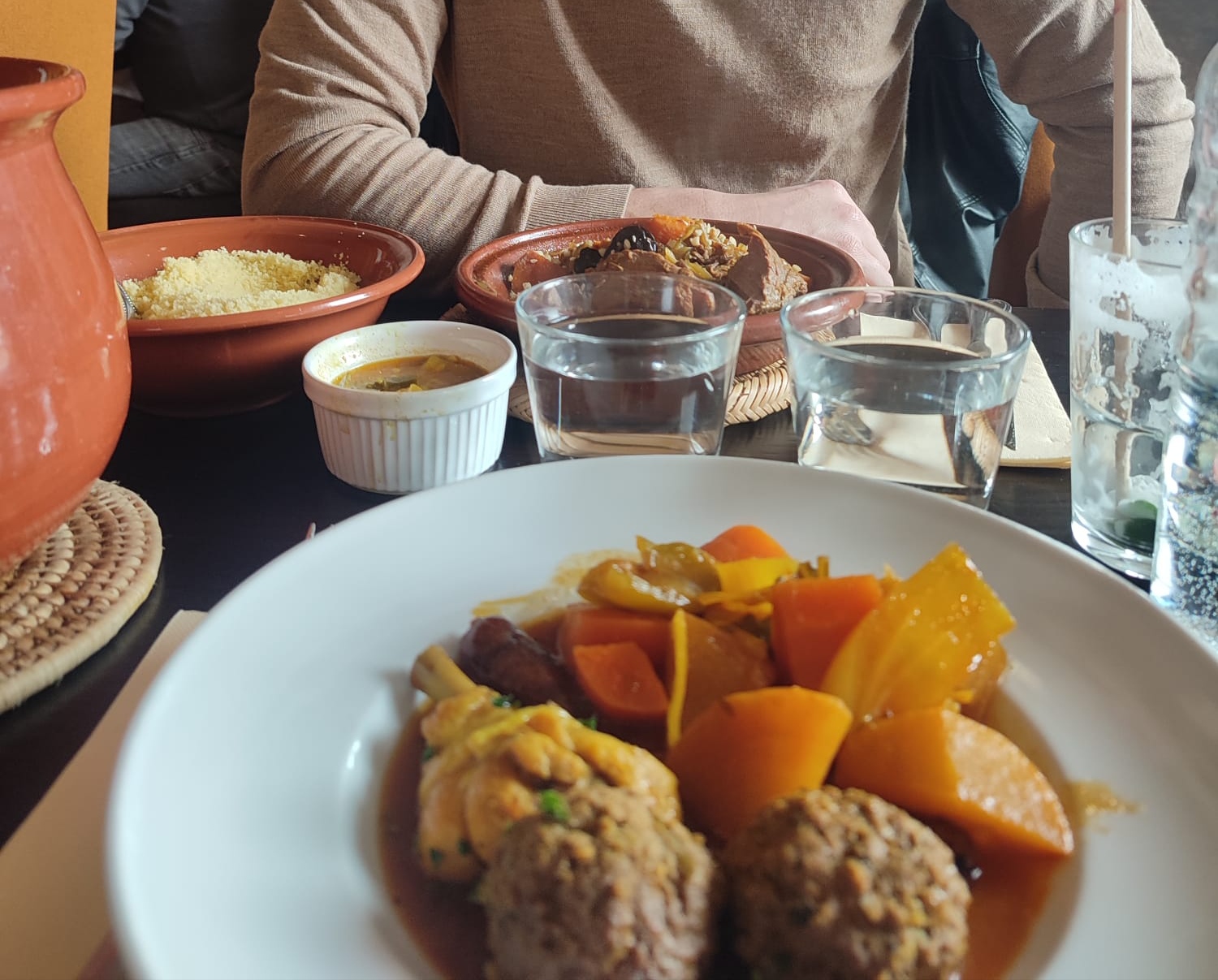 Bilan très mitigé. Le gros gros point noir c'est l'attente. Plus d'1h15 !!!!!!!! Inadmissible ! Des personnes arrivées après nous mais moins nombreuses ont même été servi avant. Autant vous dire mon agacement. Ensuite, au niveau de la qualité du service : trop trop speed. Obliger tout le temps de réclamer. On en vient au plus important le repas : déjà pas de menu, donc cher (notamment les entrées) ensuite si les assiettes étaient bien chargés, le tajine kefta était bien bien trop salé, nous avions à peine 2 bouts de pain par personne, on a même eu du pain qui n'était pas décongelé. Alors qu'un kefta se mange avec beaucoup de pain. Pareil pour les carafes d'eau. 2 petites pour 12 personnes. Obligé de réclamer encore. Sinon, le thé à la menthe manquait de sucre. Enfin, seuls points positifs ; Les portions de couscous en revanche étaient généreuses et le dessert c'était mieux. La déco est sympa aussi. Pour résumé, c'était à tester mais je ne reviendrai pas.
