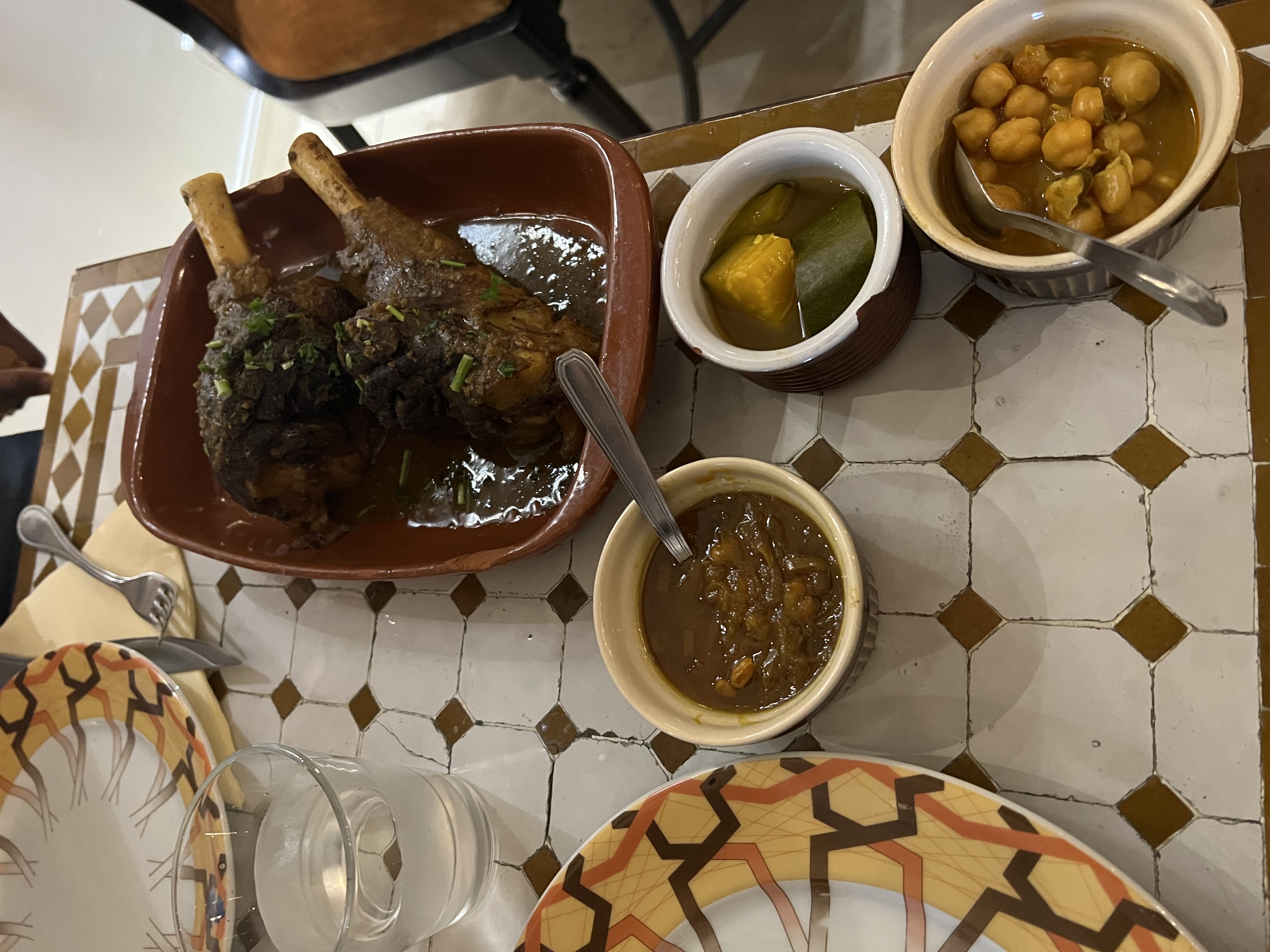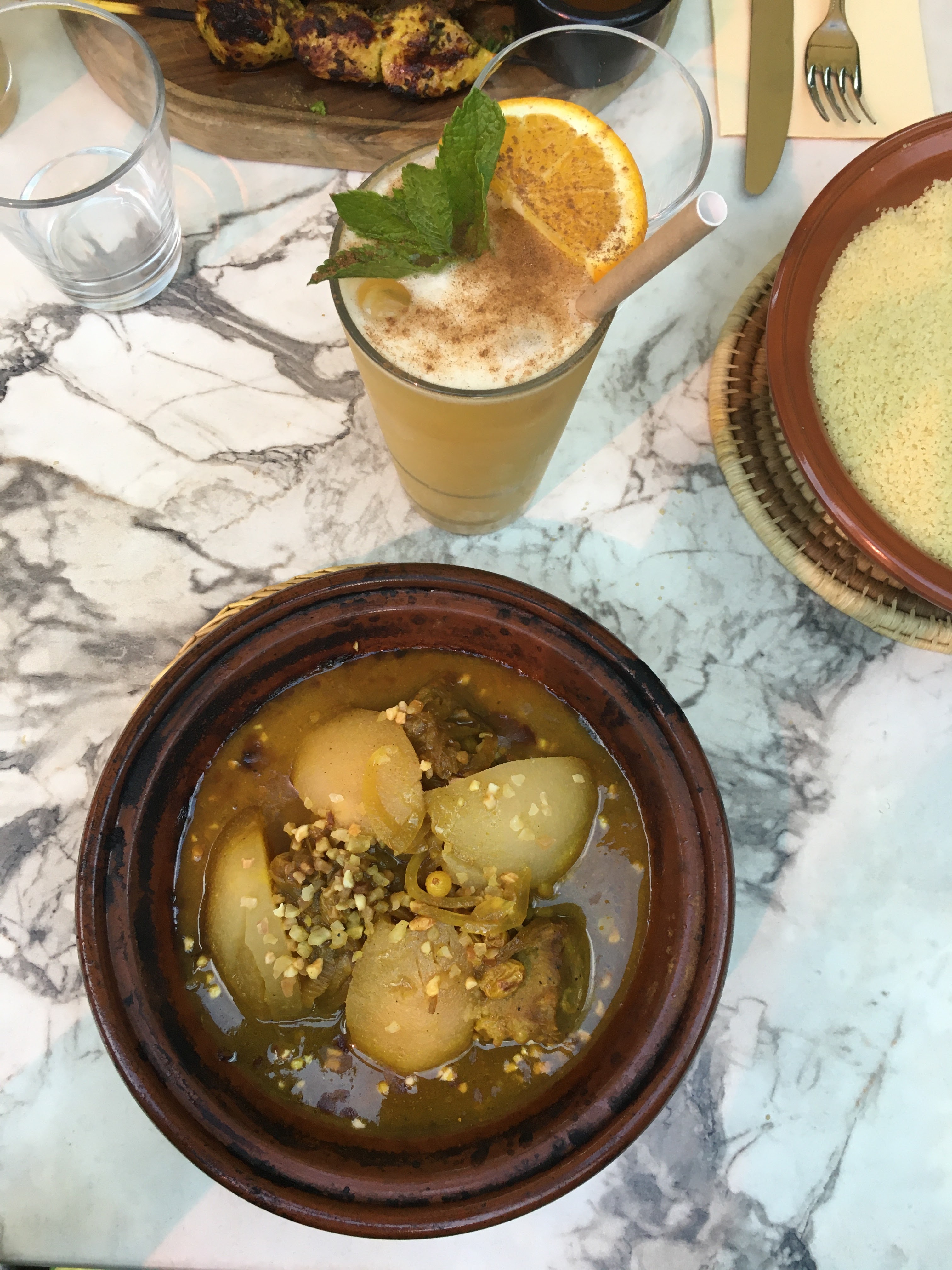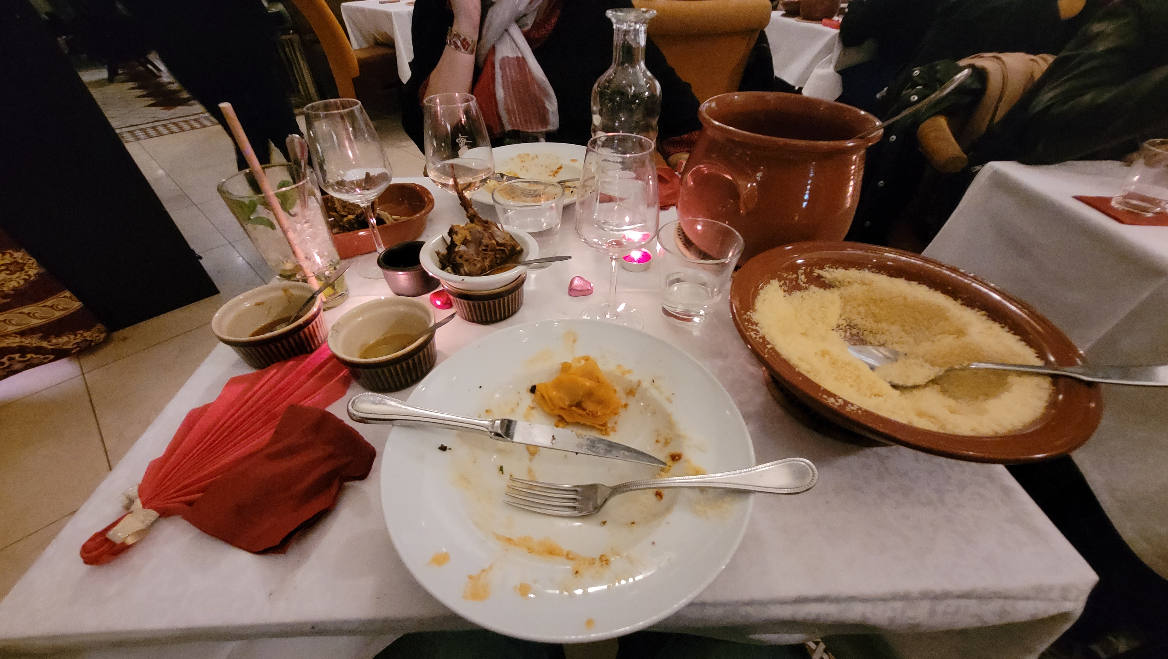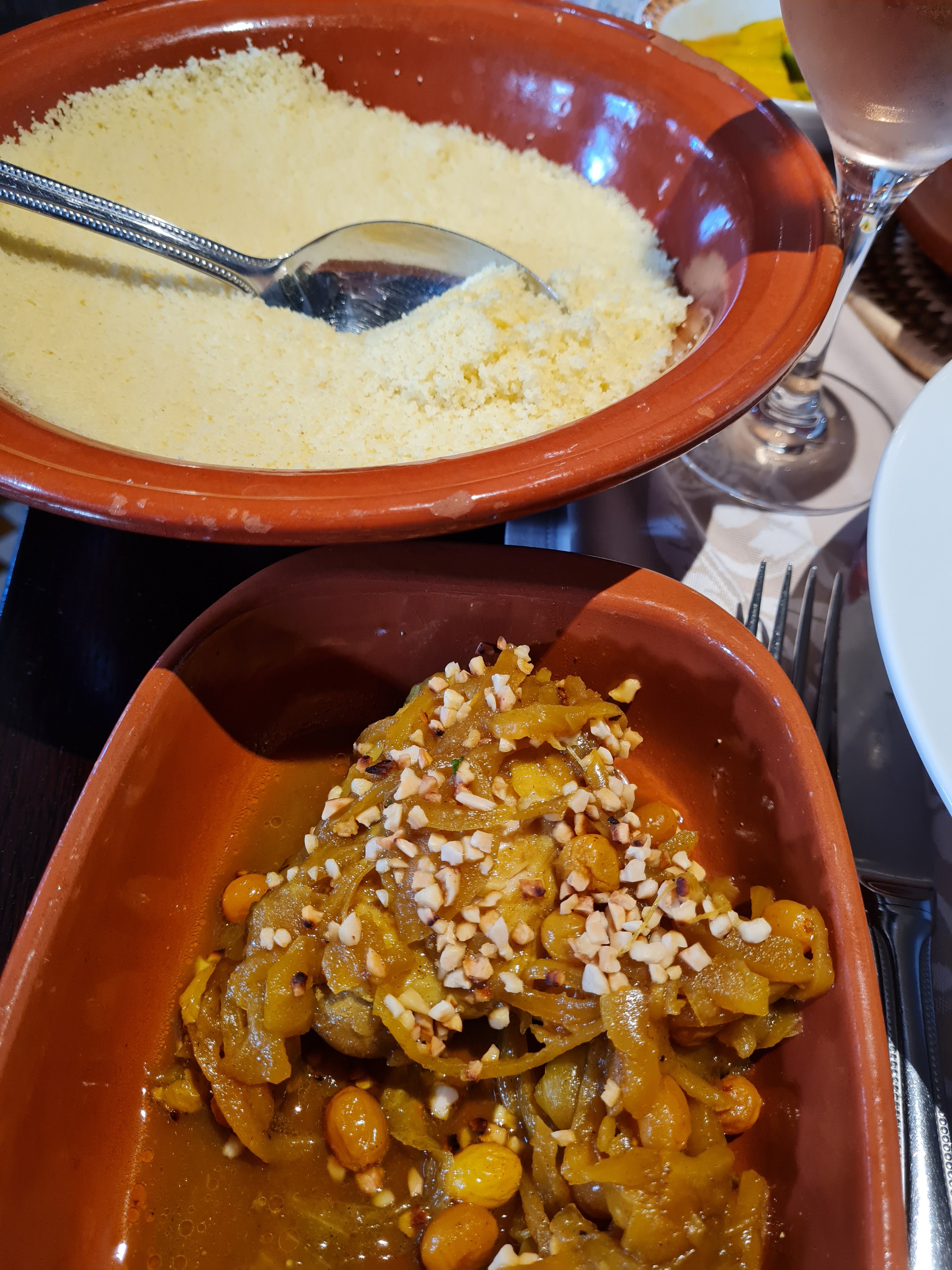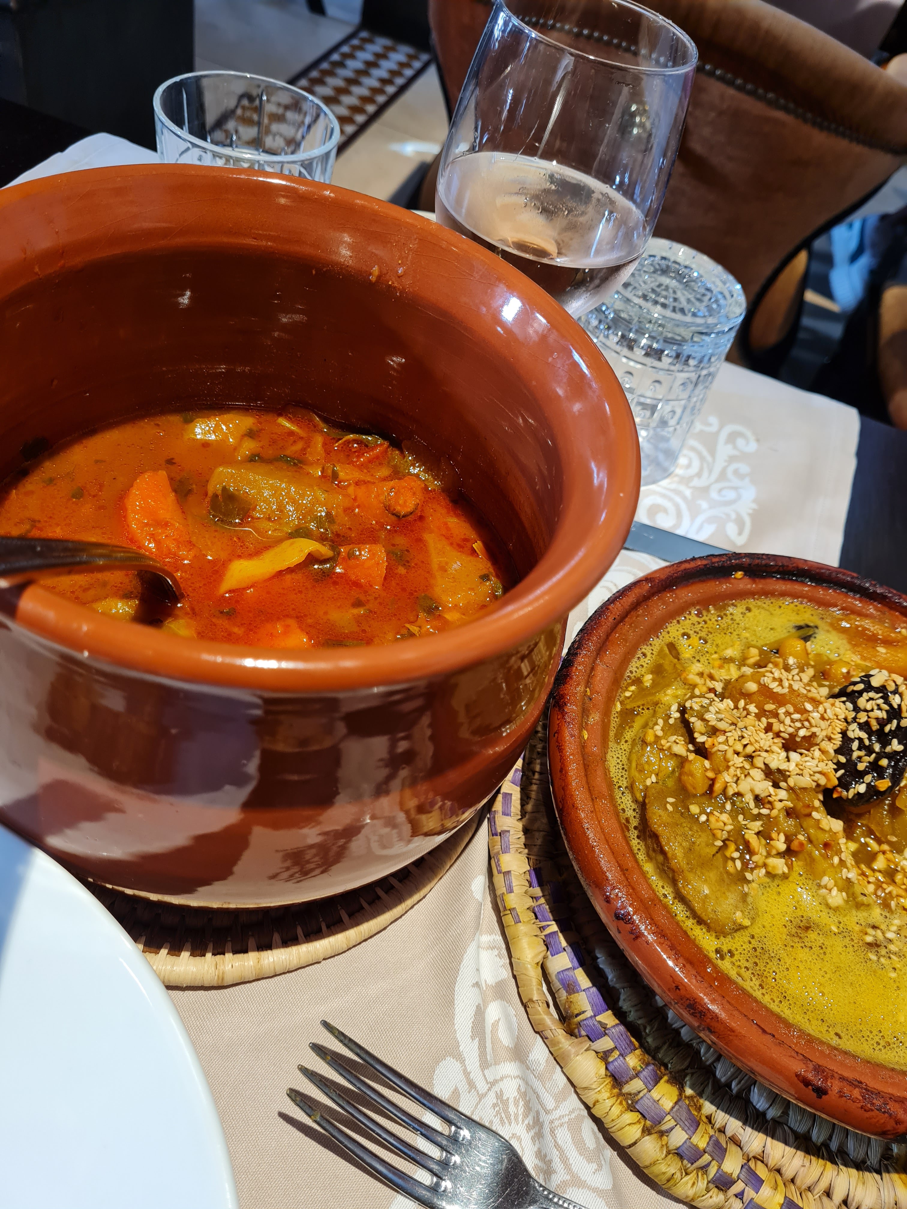 Nous avons passés une très bonne soirée dans l'établissement. Vraiment rien à redire sur le service, ultra rapide et souriant, l'ambiance est excellente. Pour un repas contenant le plat, dessert et vins, nous avons payé environ 30-35€ par personne. Pour ma part, j'ai choisi un Tajine du chef, agneau, pruneaux. Dès l'ouverture du couvercle c'est l'enchantement des saveurs, c'est ultra parfumé et on voyage instantanément. Petit plus la semoule est à volonté, c'est agréable. J'ai pu goûter au Couscous kefta également, qui pour moi était clairement en dessous et j'ai trouvé la viande un peu sèche à mon gout. A choisir, privilégiez les tajines. Nous avons fini ce repas par un très bon thé à la menthe mais les mignardises de la version gourmandes sont tout juste passables. Cette note d'amertume et d'inachevé en fin de repas me fait retirer une étoile.