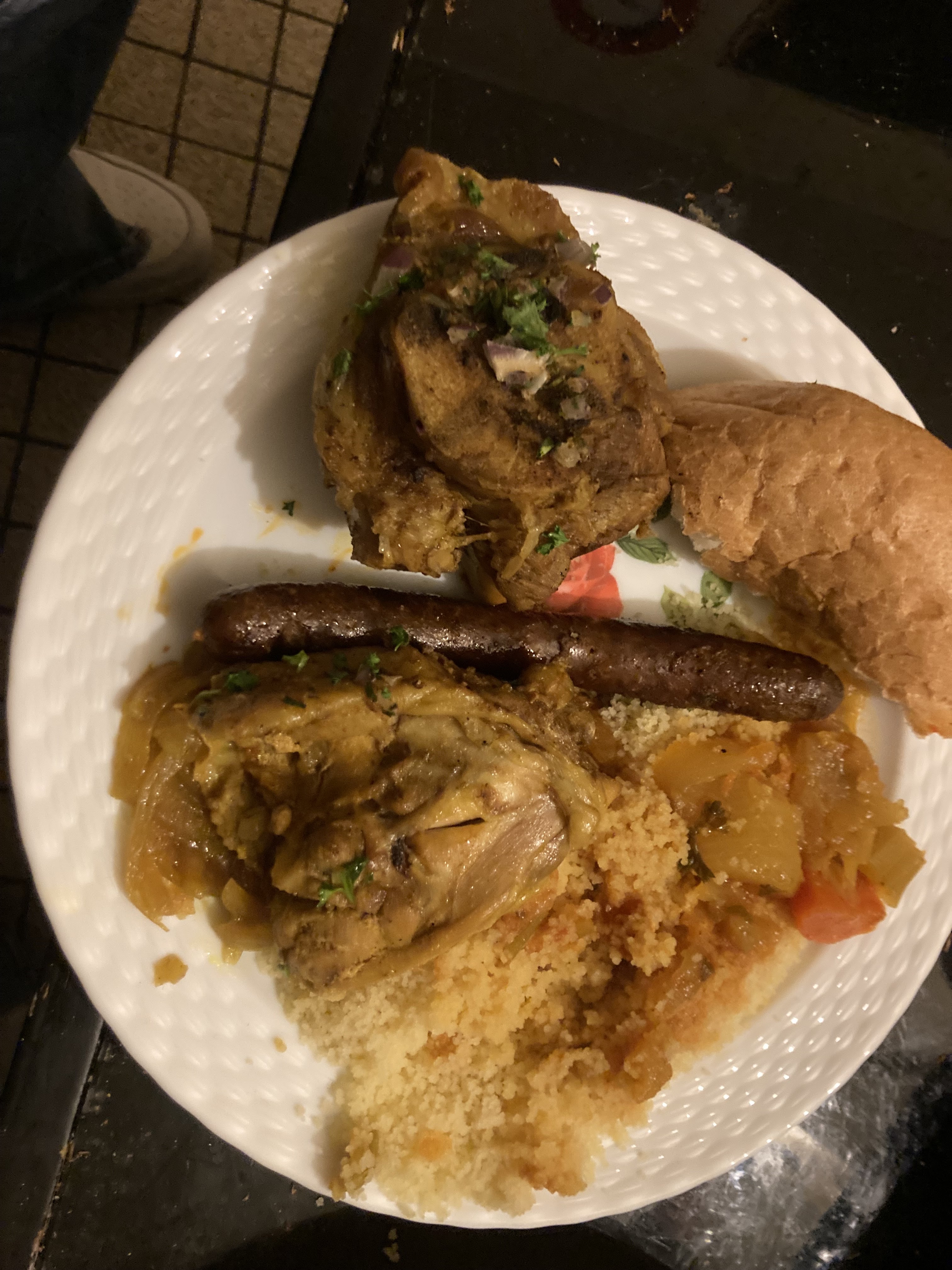 Un coucous sent goût. Manque de goût pas d'épice. Du poulet industriel comme les merguez sans conter un agneau méchoui qui a l'eau. Les pois chiche qui aussi a l'eau. Après il apporte des aubergines cuites aussi à l'eau. Au mois de novembre c'est une honte de servir de légumes qui ne sont pas de saison. Quant au bouillon aucun goût. C'était un coucous insipide. Et je vous le dis c'est pas du vrai coucous. Ma famille est pied noir.