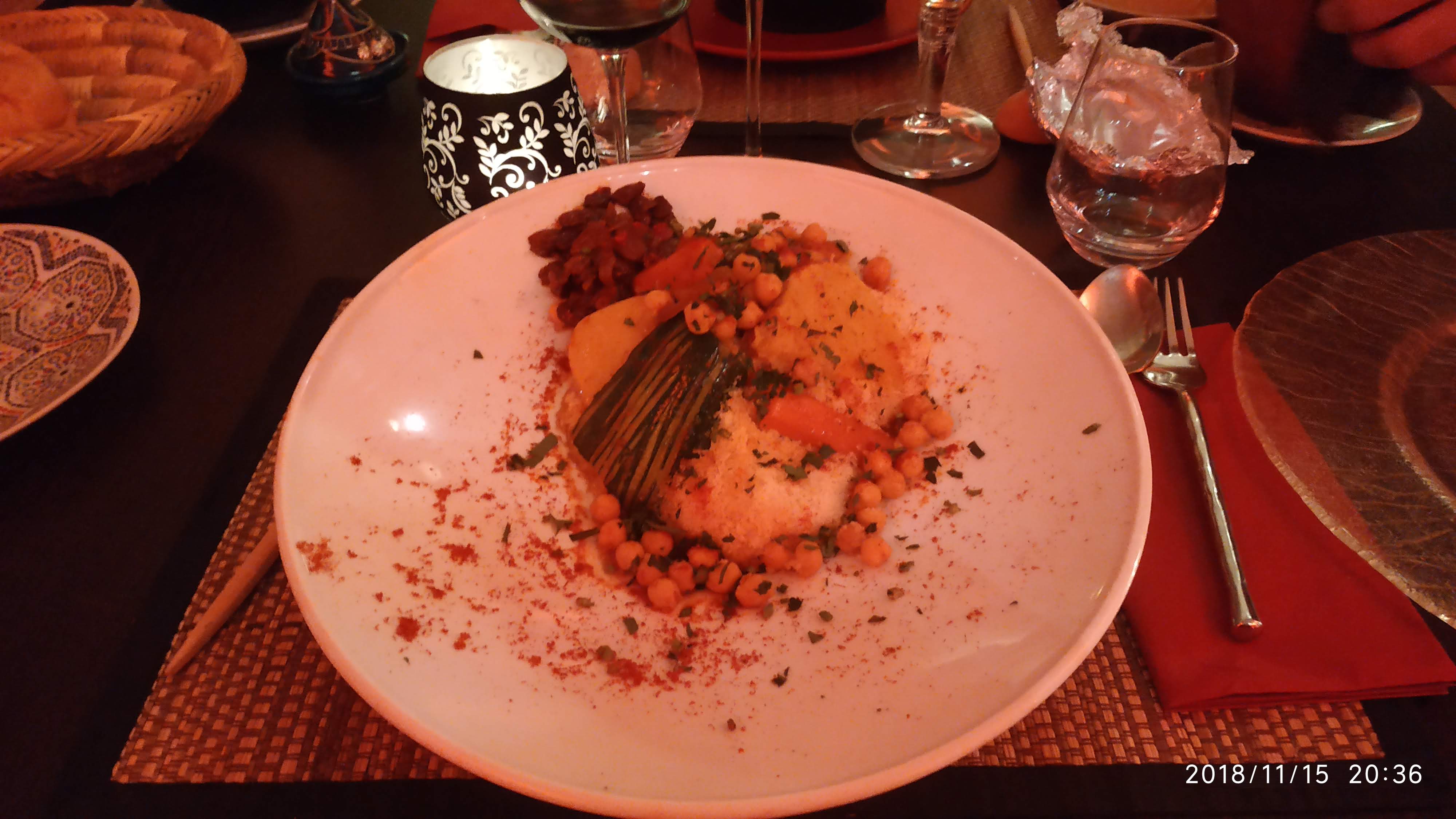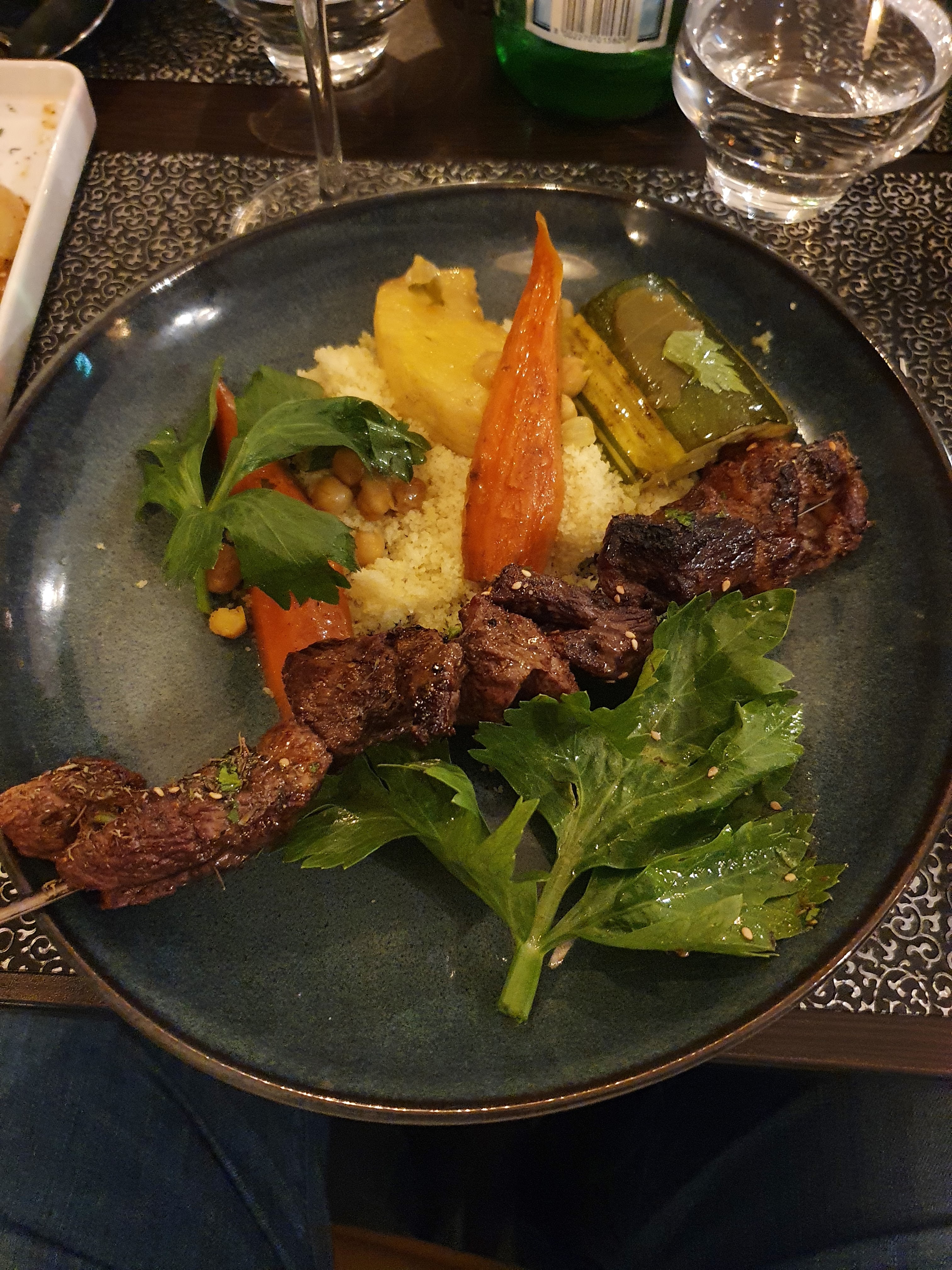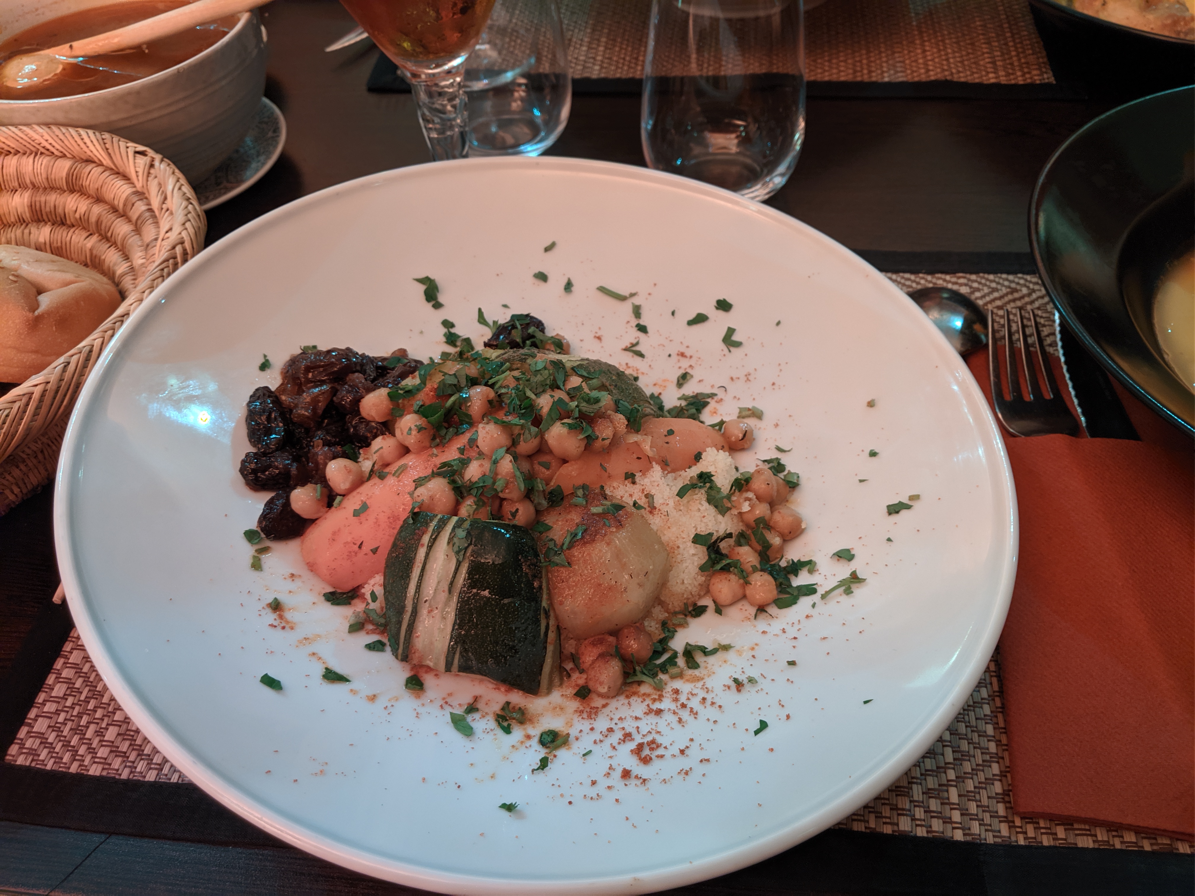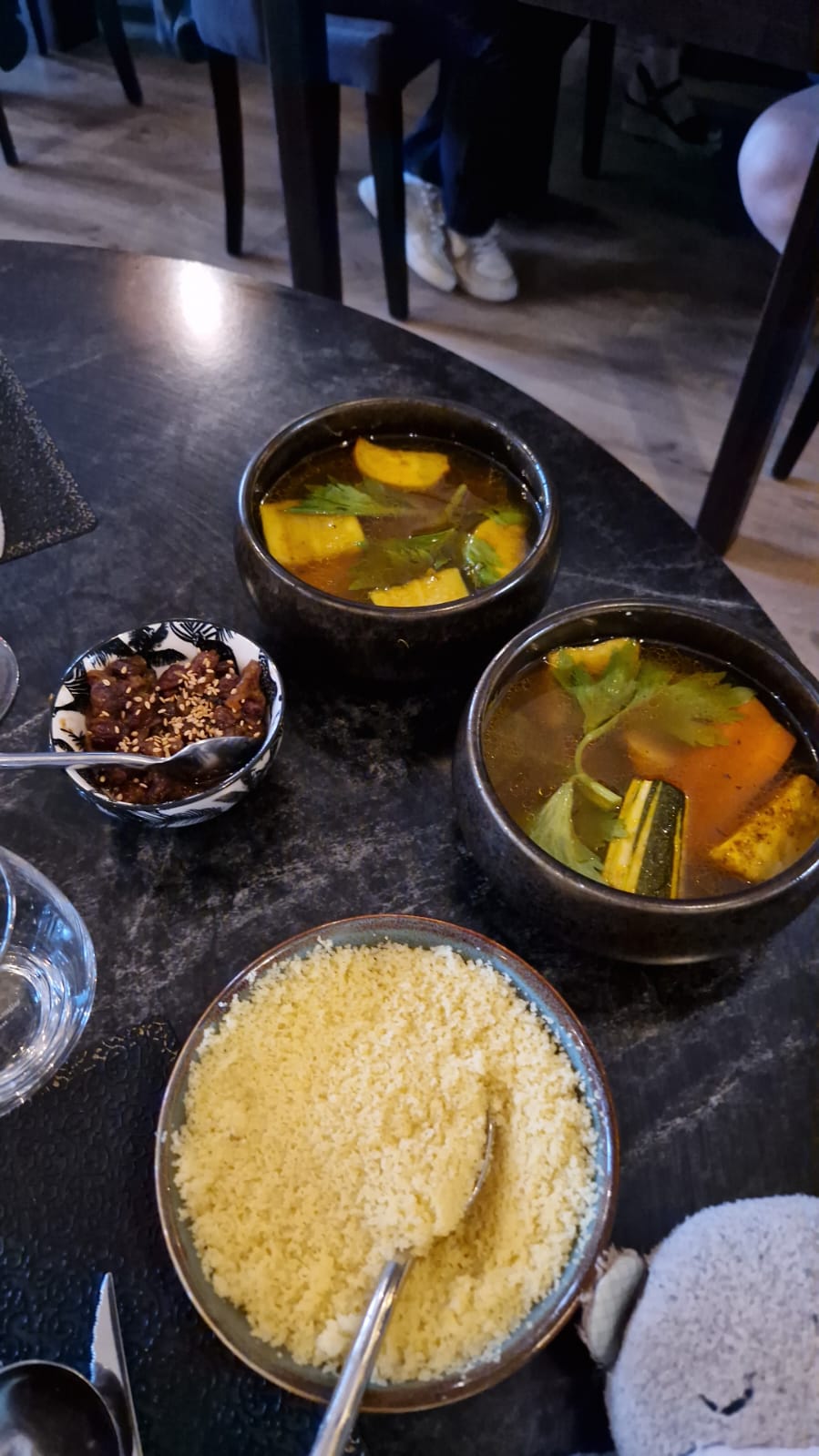 Tout était IMPECCABLE. Nous étions 3 copines qui découvraient ce resto. Nous avons été très bien accueillies , l ambiance est chaleureuse... le personnel sympathique et souriant... Entrée à partager délicieuse ! Les plats sont exquis...pour ma part c etait couscous miel et safran, j'étais réticente sur la côte d agneau et la merguez mais j ai juste ADORÉ ! Ensuite petit thé a la menthe servi sur place au plateau.... et pour finir en beauté nous avons goûté un digestif à la figue. ... un pur bonheur. .! Nous avons passé une excellente soirée..et nous y reviendrons ! Je recommande cet établissement les yeux fermés !