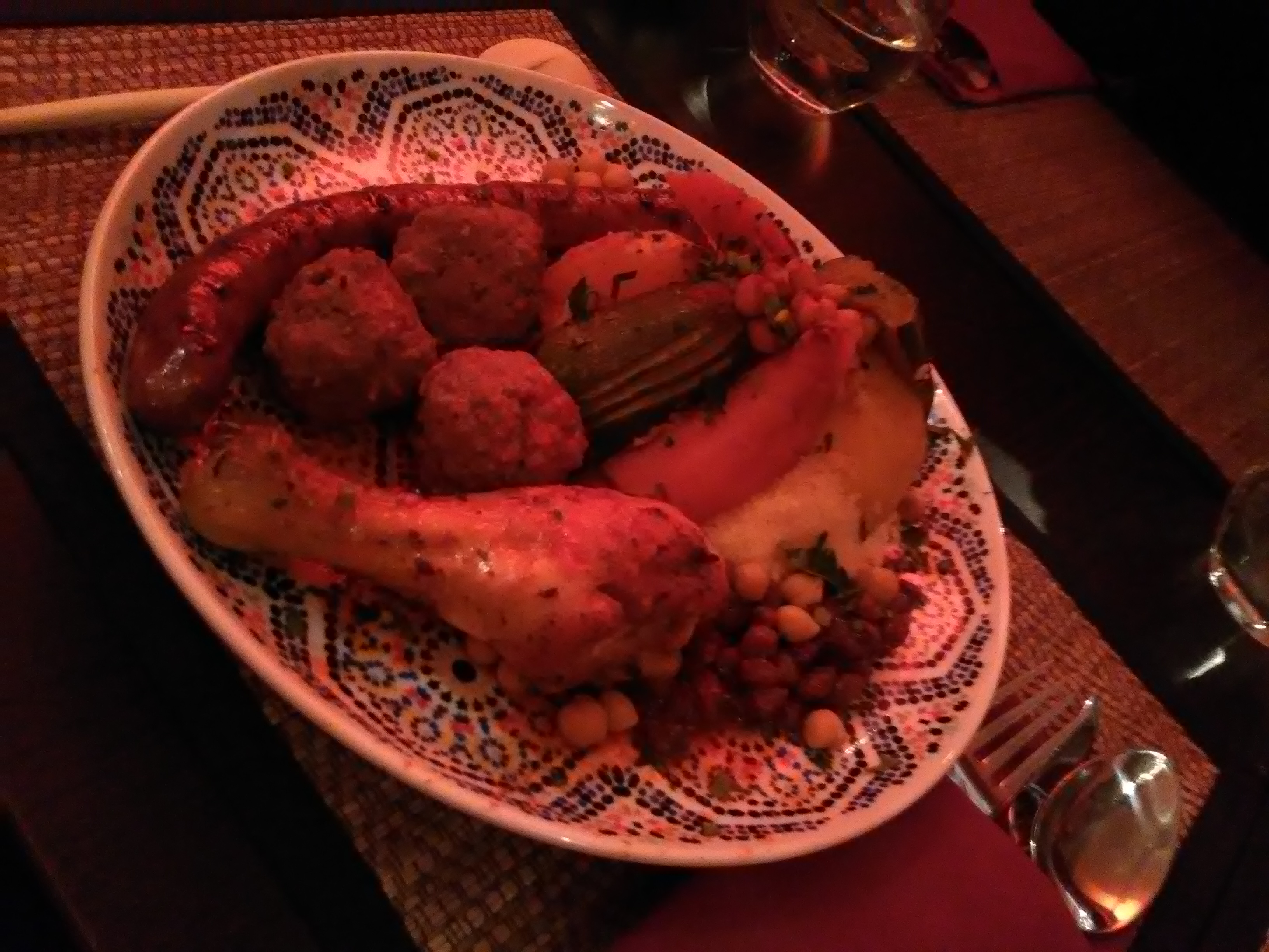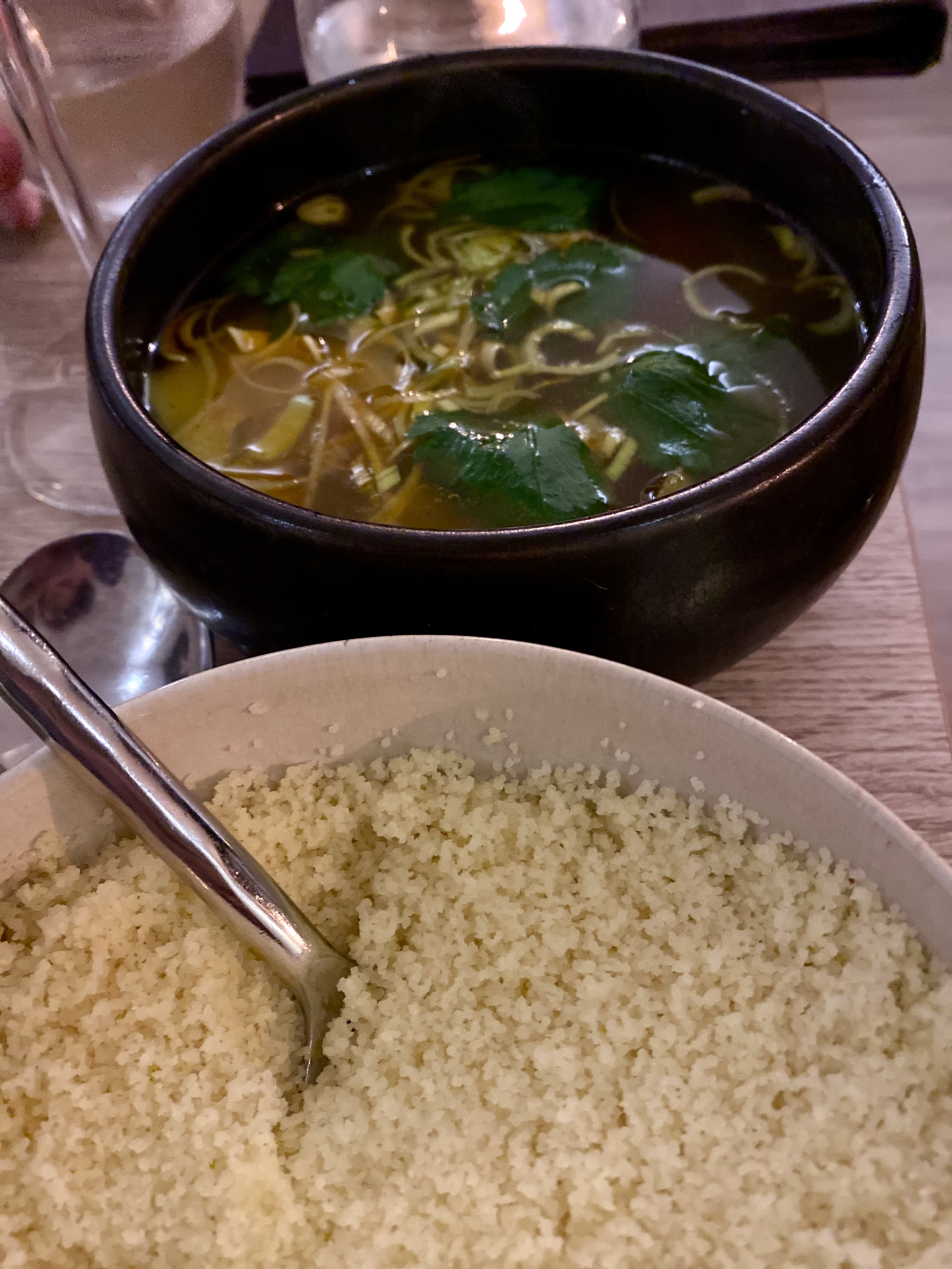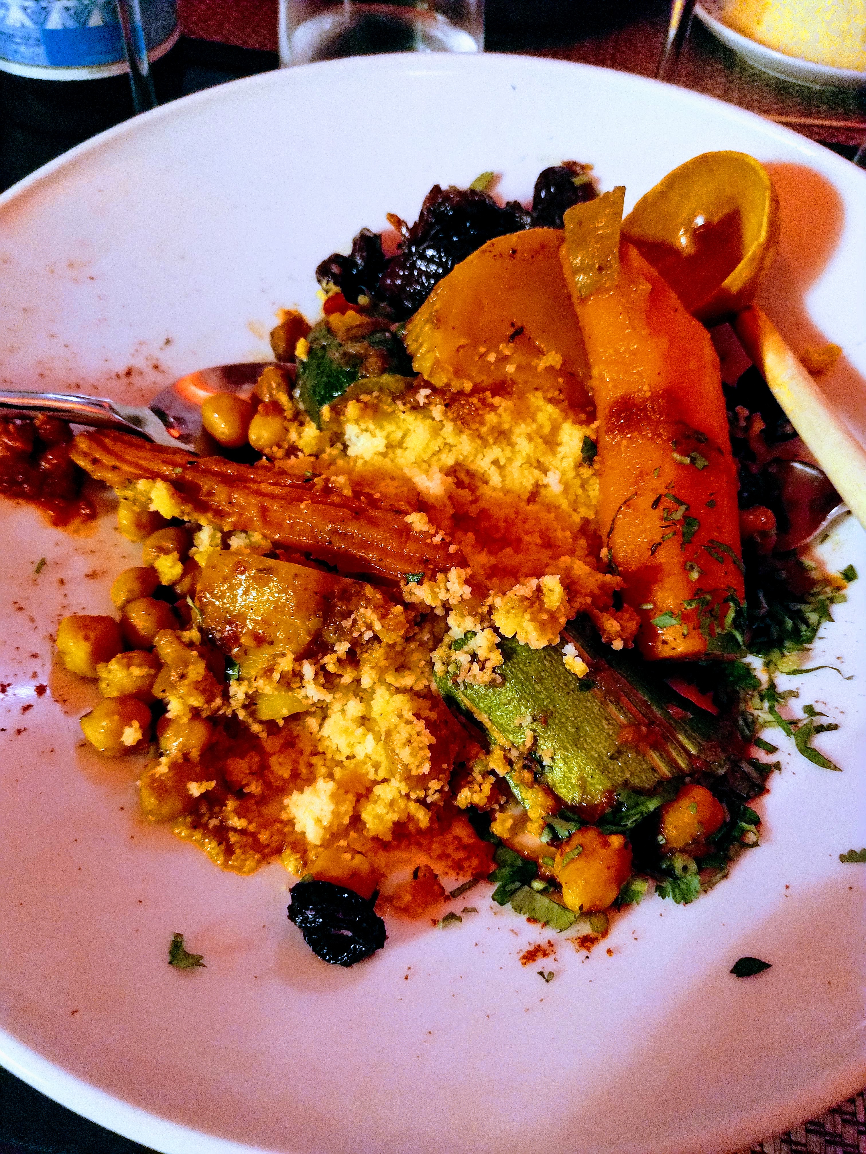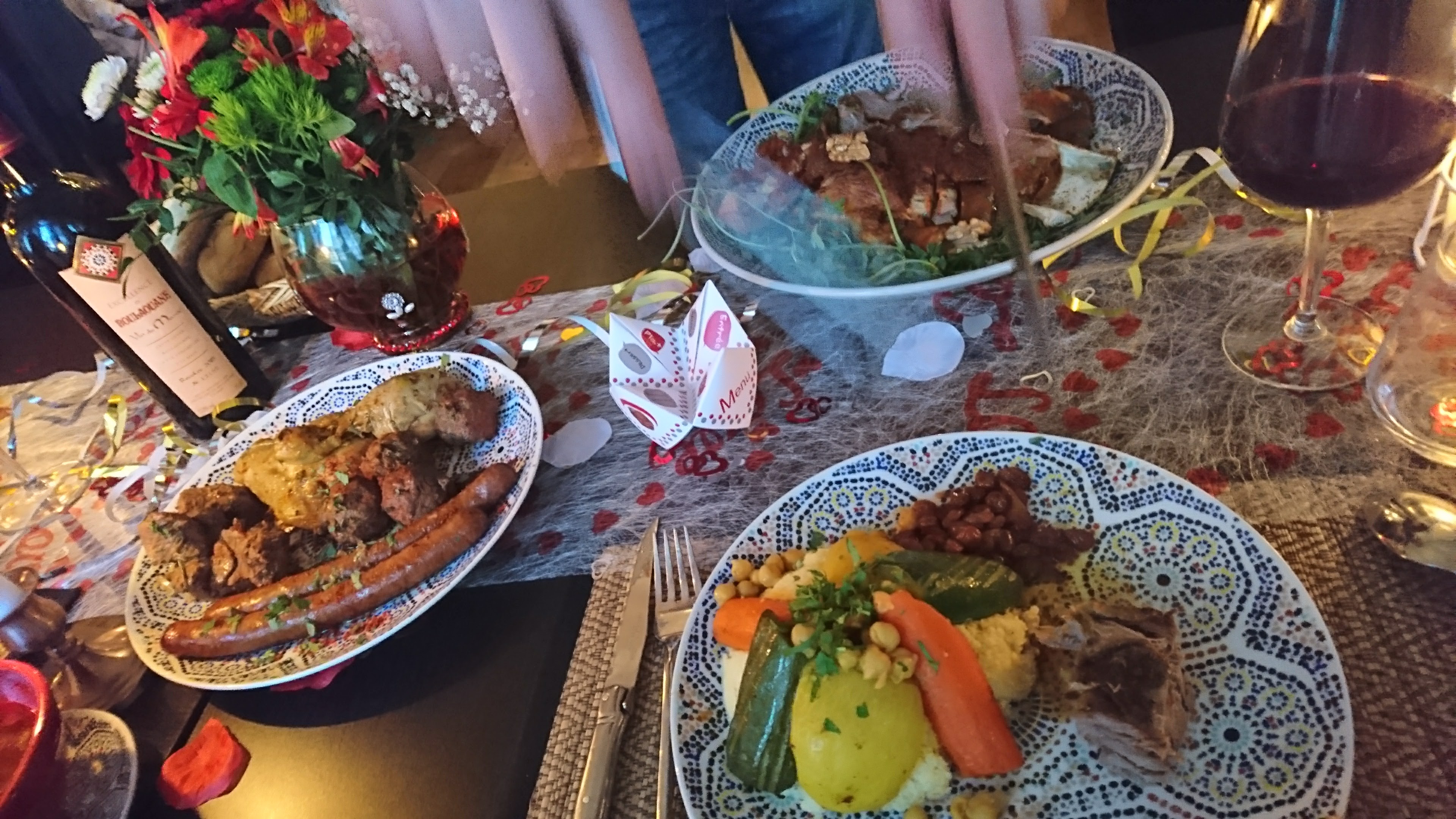Tout était IMPECCABLE. Nous étions 3 copines qui découvraient ce resto. Nous avons été très bien accueillies , l ambiance est chaleureuse... le personnel sympathique et souriant... Entrée à partager délicieuse ! Les plats sont exquis...pour ma part c etait couscous miel et safran, j'étais réticente sur la côte d agneau et la merguez mais j ai juste ADORÉ ! Ensuite petit thé a la menthe servi sur place au plateau.... et pour finir en beauté nous avons goûté un digestif à la figue. ... un pur bonheur. .! Nous avons passé une excellente soirée..et nous y reviendrons ! Je recommande cet établissement les yeux fermés !