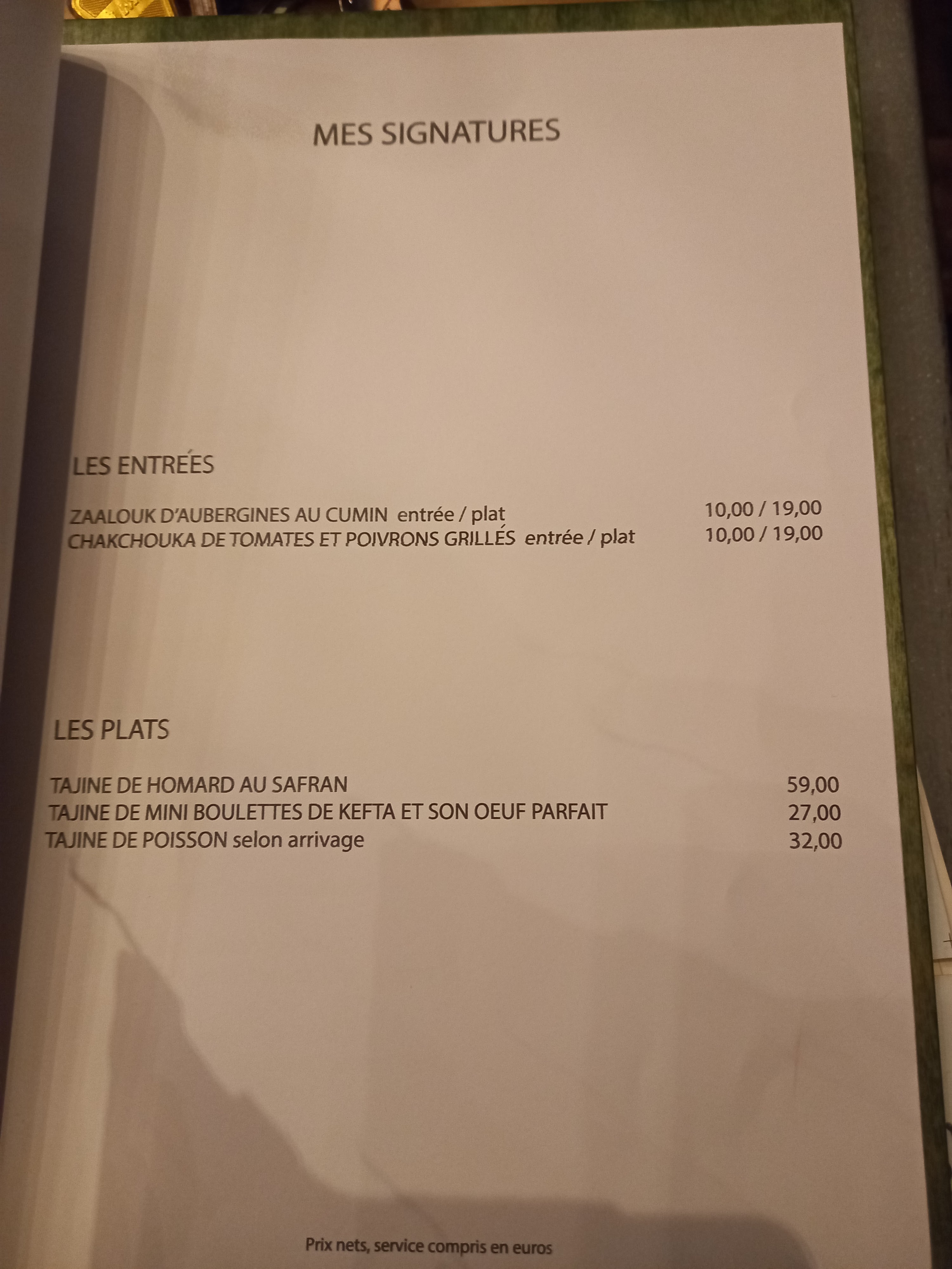 Très bon choix de plats. Les plats sont vraiment très bons, Par contre je trouve que ça ne justifie pas le prix. Coca 6€ tajine 30/35€ une viande et un bol de semoule. Entree pastilla poulet 27€ ... Le rapport qualité prix pour moi n'y est pas malgré que la cuisine soit bonne.
