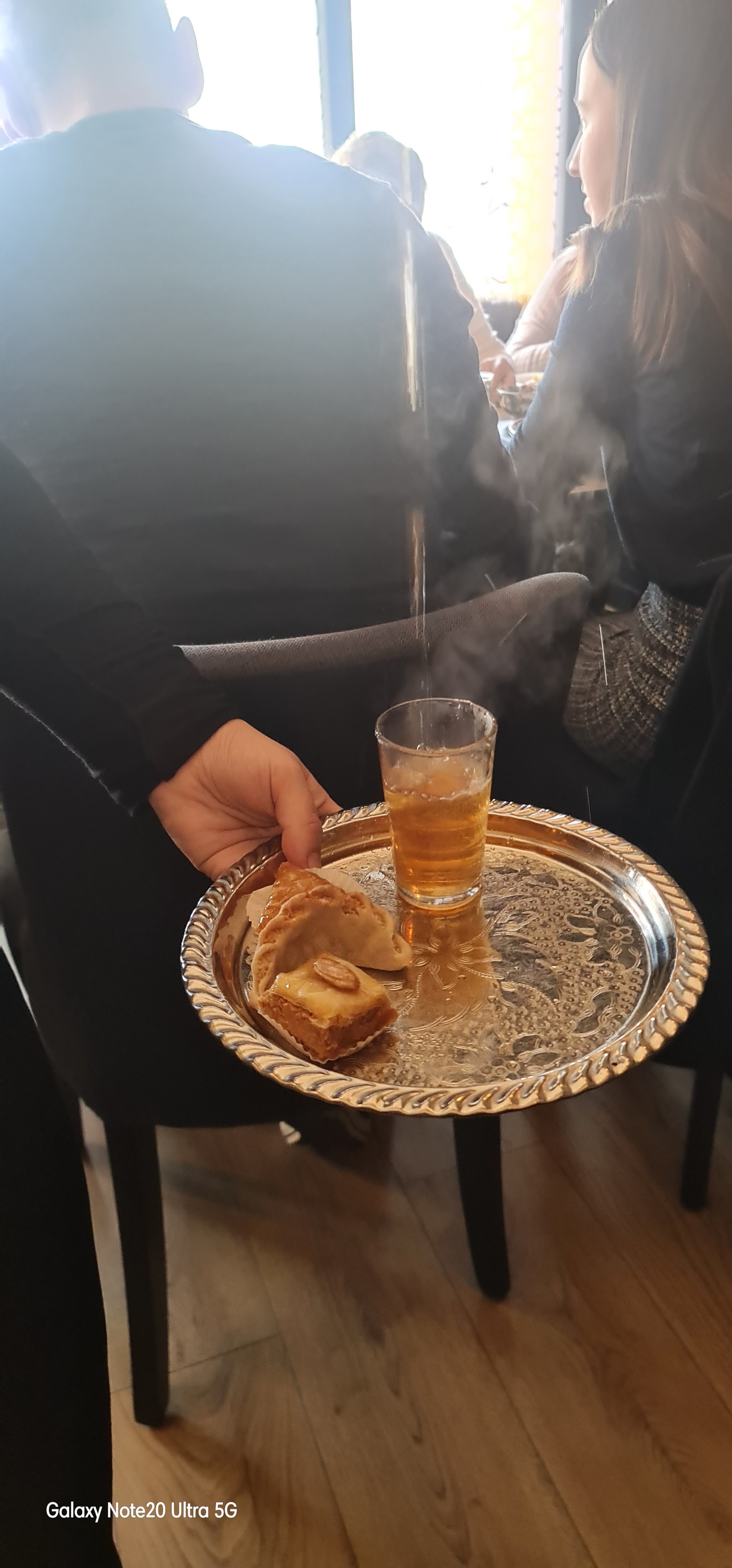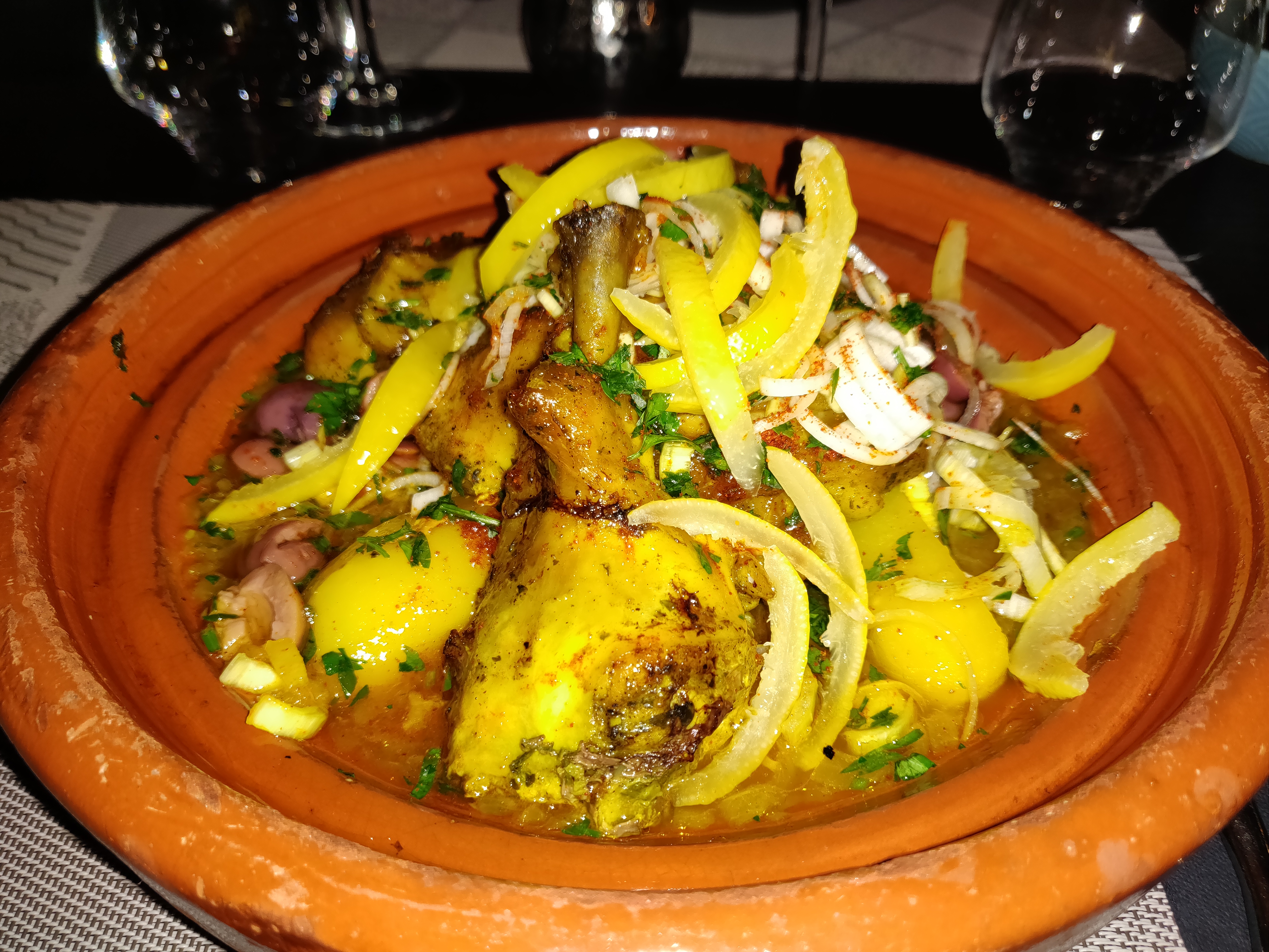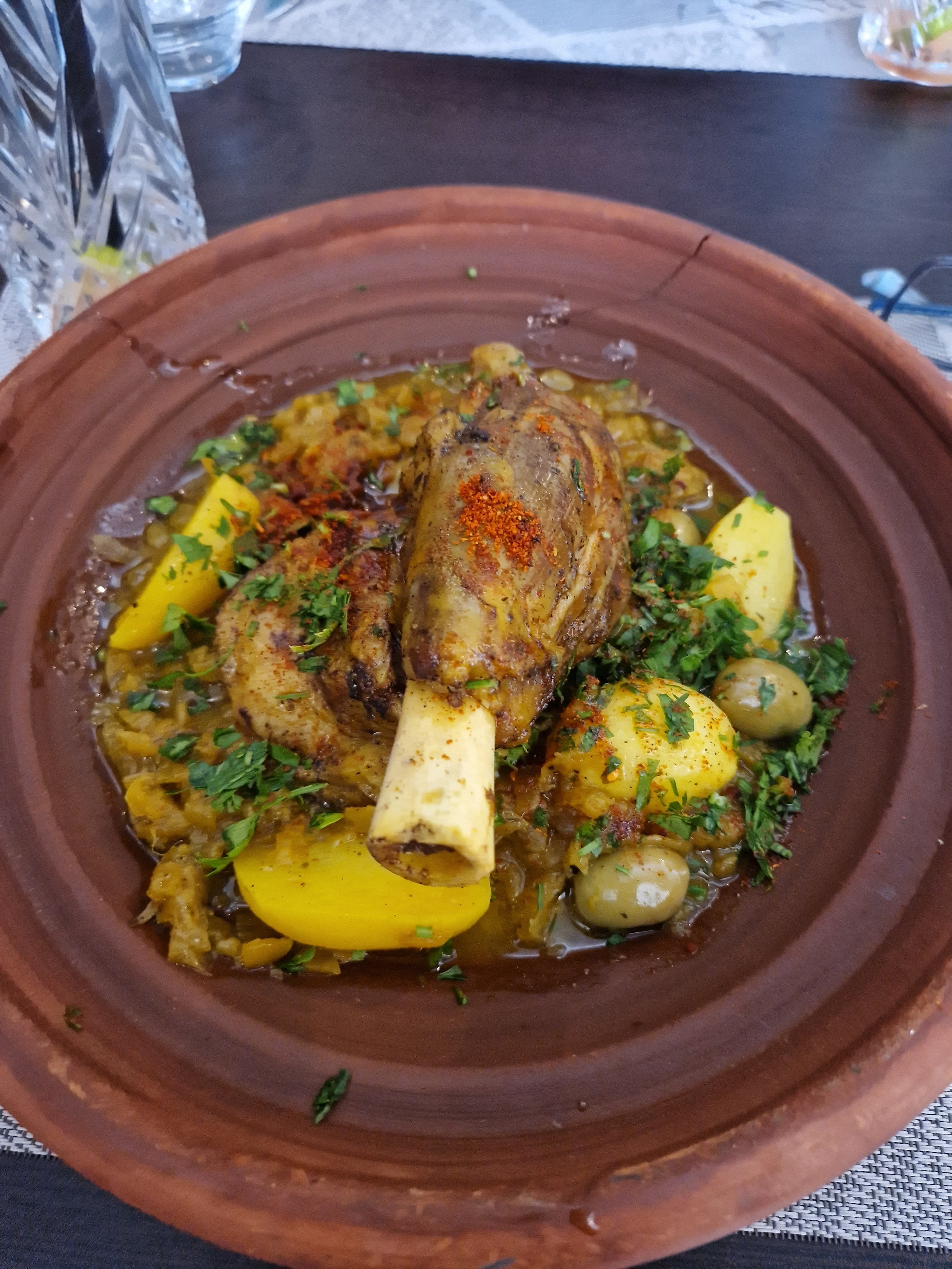 Un restaurant que nous ne connaissions pas, et nous avons adoré ! Après un apéritif (kir Miel et Safran très sympa), mon conjoint et moi même avons pris un tajine raisins secs, miel et cannelle ; moi avec du boeuf, lui avec du poulet. C'était excellent, bien dosé en goût, copieux ! Nous avons ensuite pris un thé à la menthe chacun et des pâtisseries orientales, qui étaient très bons également. Le service est super, on nous a offert une pâtisserie orientale et on nous a proposé le reste de nos plats en doggy bag. Par ailleurs, la déco et l'ambiance sont très chaleureuses, on s'y sent tout de suite bien. Je recommande vraiment ce restaurant qui va devenir un de mes chouchous des environs 😇