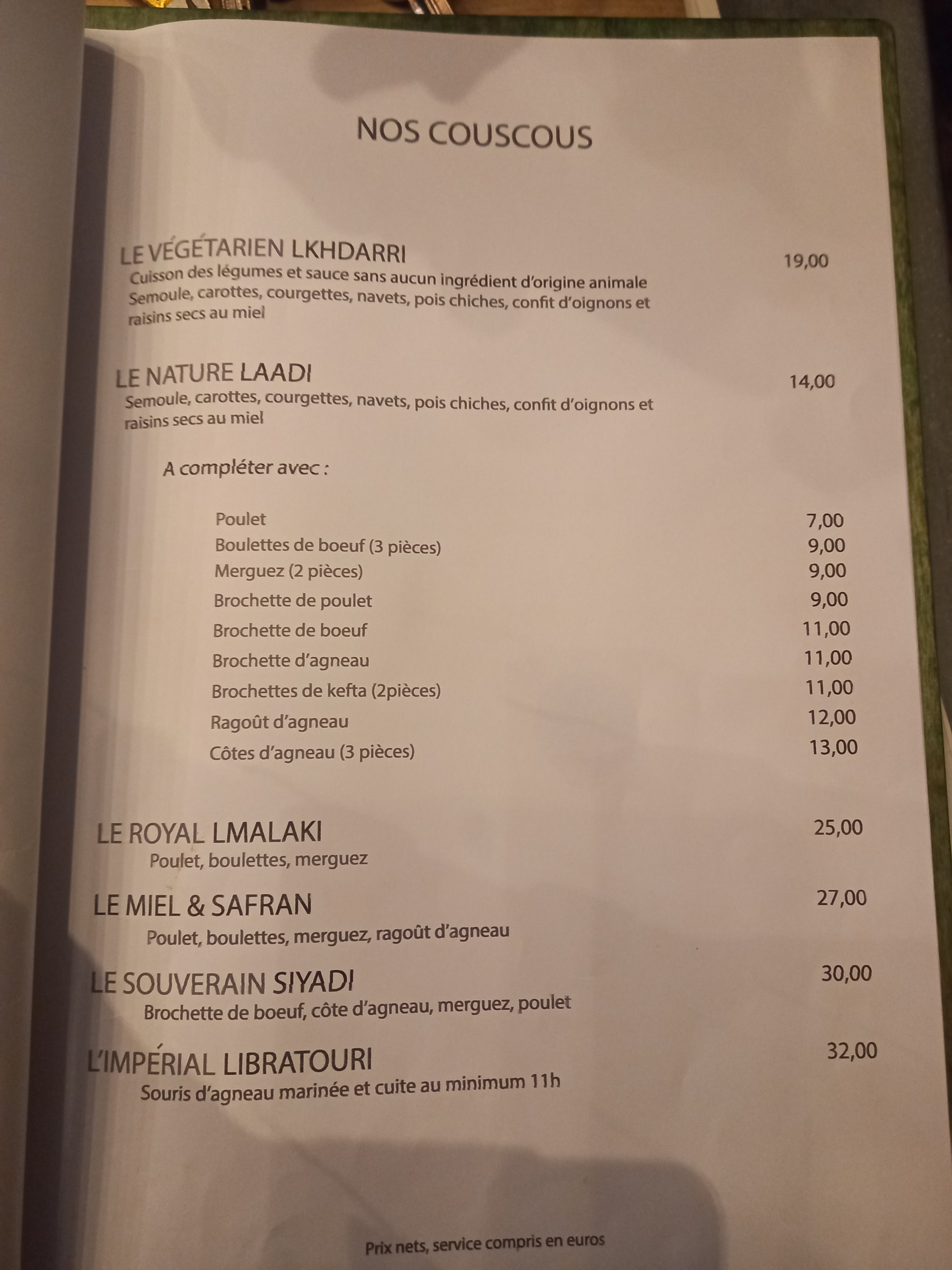 Bon couscous , prix correct, service agréable et professionnel..cadre correct ..bon petit restaurant!