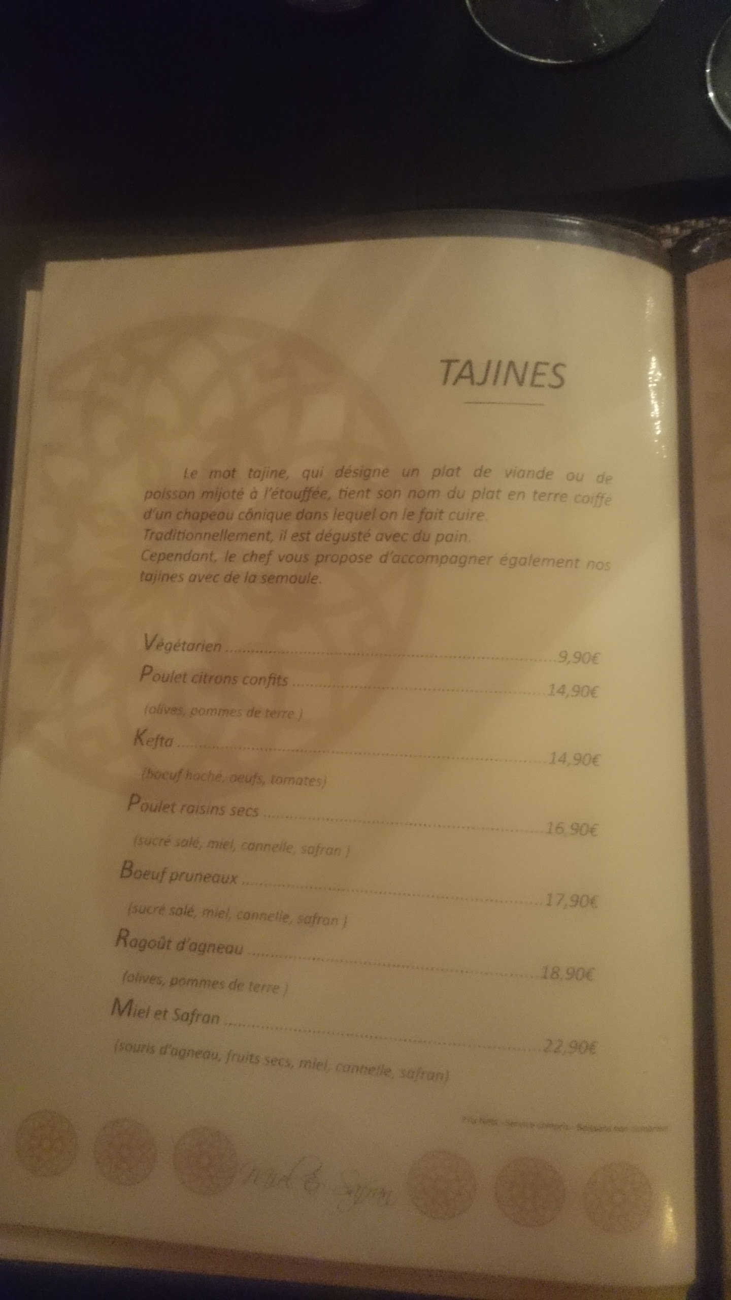 Nous sommes allées avec mes amies, et une chose est sure nous n'y retournerons plus jamais. Le serveur très désagréable, qui nous a donné l'impression d'être dérangé et qui nous parlais d'une manière très hautaine!! Quant à la nourriture!! Oh mon dieu.. c était vraiment mais vraiment d..... , écoeurant, ce n'était pas du tout mangeable!! Les plats ont lâchés beaucoup d'eau, ce qui nous a fait douter sur la fraîcheur de ces derniers, à savoir si les plats n'étaient pas congelés.. fades, pas de goût.. je m'en souviendrais de ce tajine boeuf ( viande presque noire!! Et sans gout) pruneaux/cannelle!! Une catastrophe dans tous les sens ....