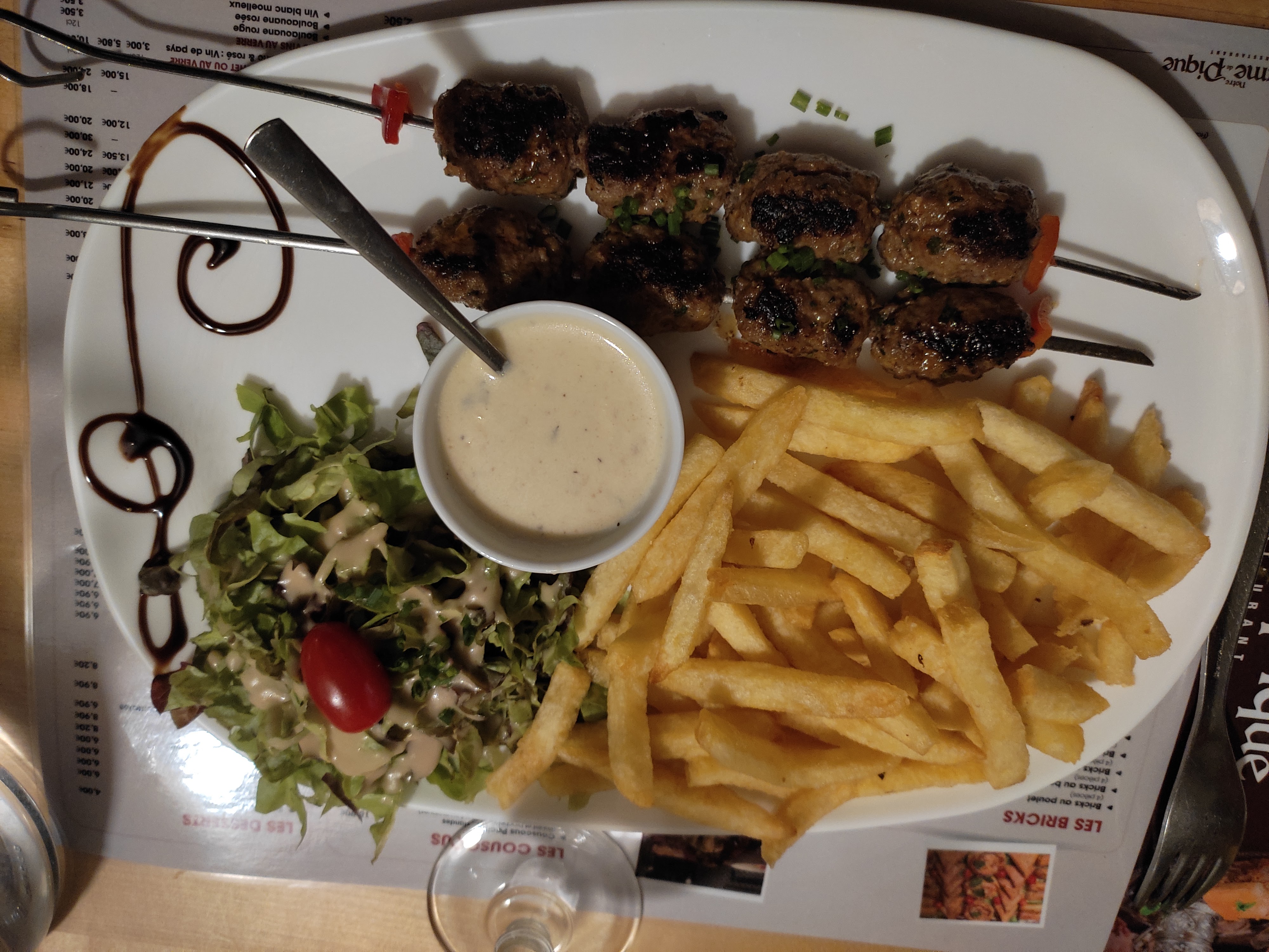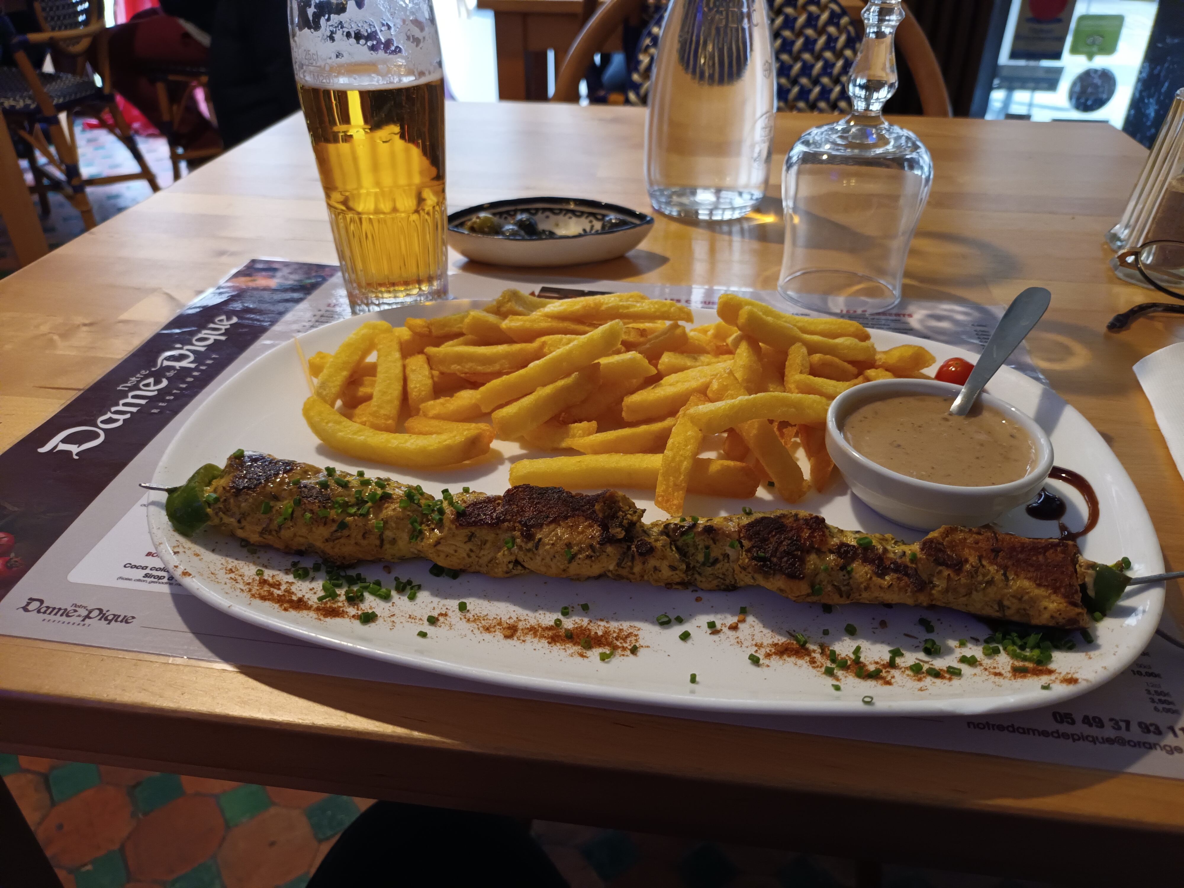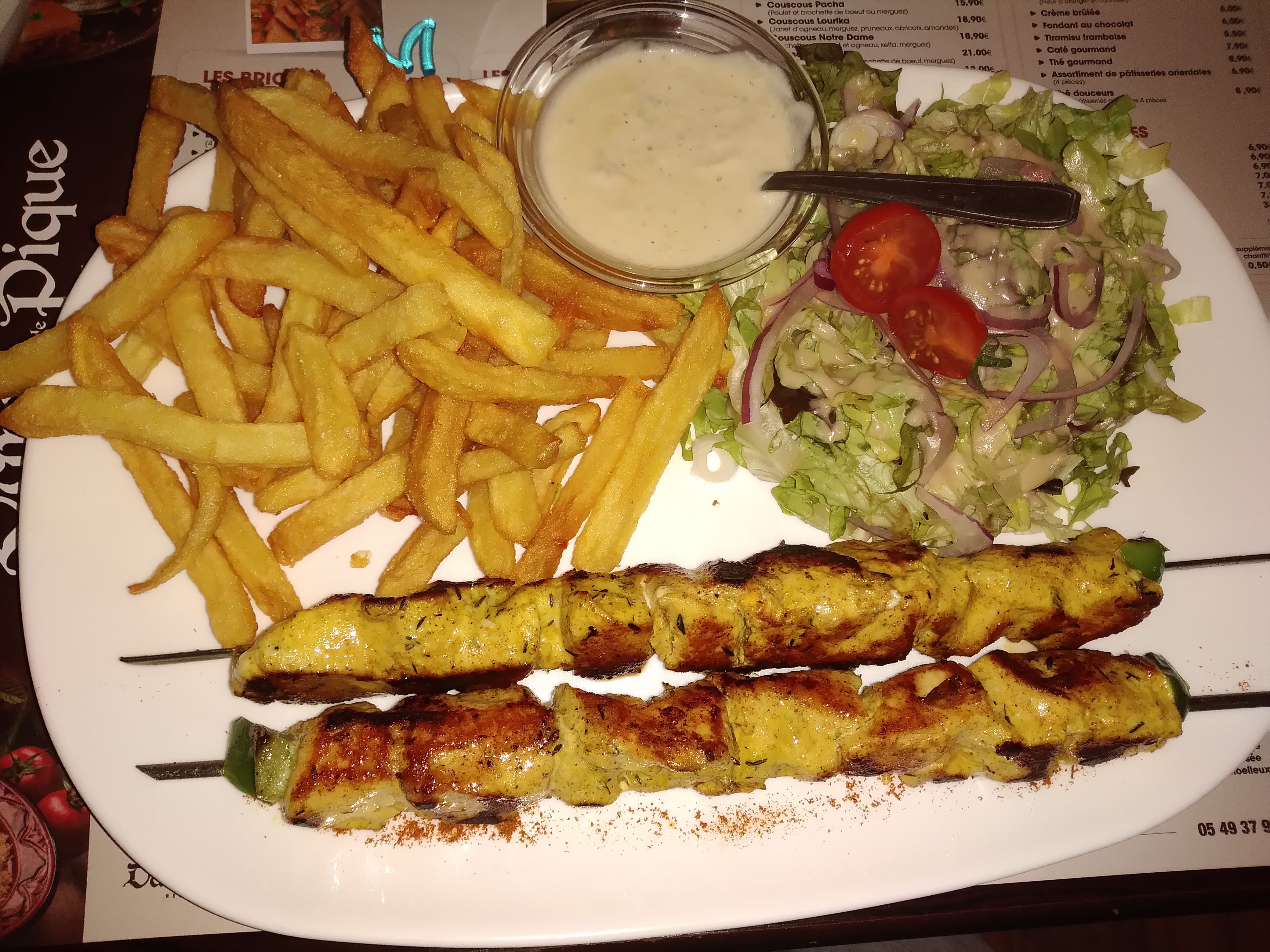 Je continue d'essayer d'aller dans d'autres restaurants de Poitiers mais je reviens toujours à celui-ci! Le décor est incroyable, comme un hammam à l'intérieur avec de belles tuiles et des plafonds sculptés. La nourriture est délicieuse. Je recommande fortement les brochettes qui viennent en steak, agneau ou poulet et une merveilleuse sauce au poivre. La crème brûlée était l'un des meilleurs que j'ai jamais mangé. Le service peut être un peu lent entre les cours, mais la nourriture arrive assez rapidement. et le personnel est très sympathique. Je recommande de réserver parce que c'est très populaire. Dernier point mais non le moindre, le prix est très raisonnable :)