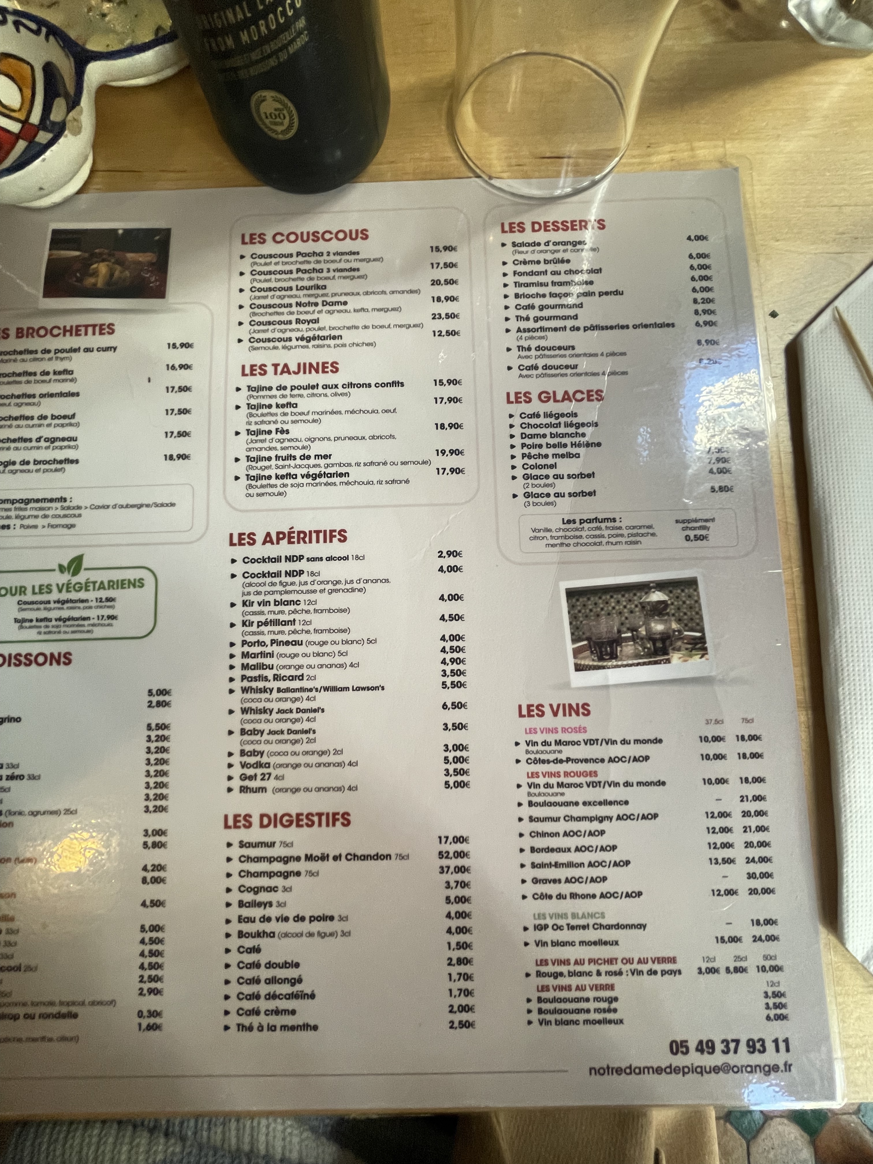 Première fois au restaurant tout été parfait super accueil très bonne cuisine juste un petit bemole vous avons tous commande un couscous différents mais au service aucun plat individuel un peut difficile de reconnaître son plat du coup ont a taper dans tous