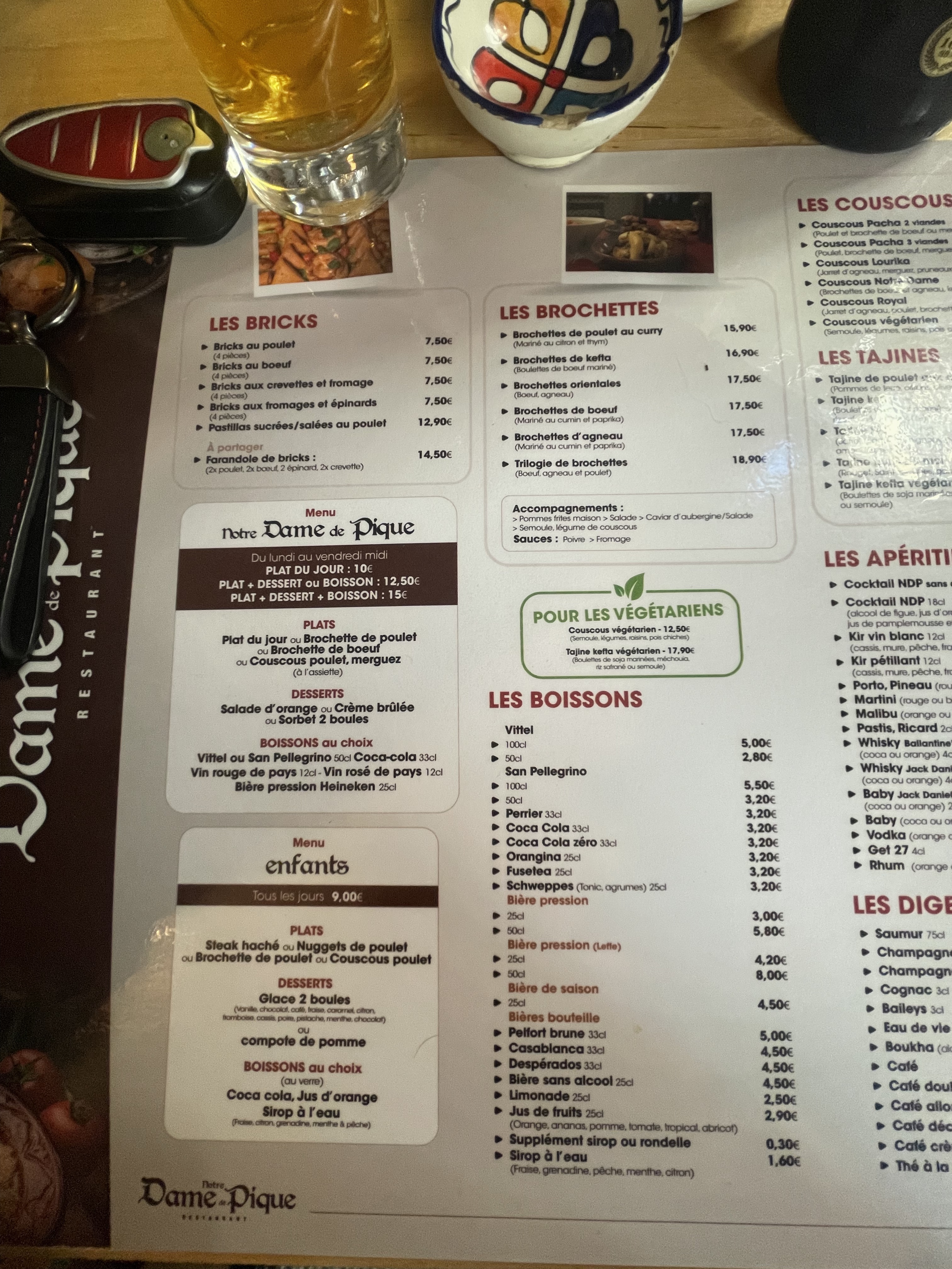 Nous avons pris deux couscous dame de pique ! Très bon rapport qualité-prix, nous nous Somme régalés ! Le décor est très sympathique ! Viandes marinées, délicieux !